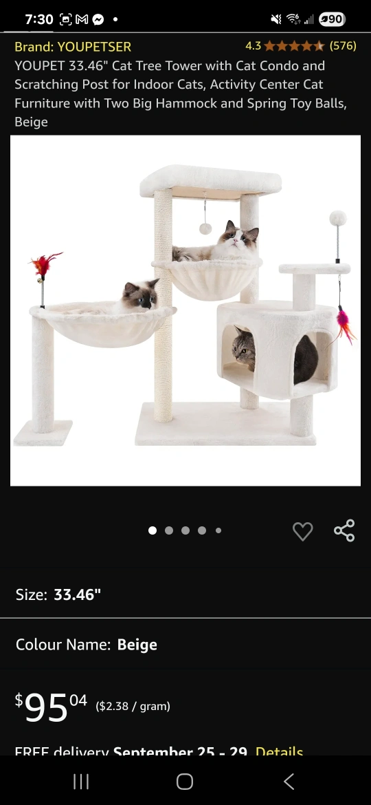 This is a YOUPETSER 33.46" cat tree tower. It comes with a cat condo, scratching post, two big hammocks, and spring toy balls. The colour is beige. It was originally bought for $95.04