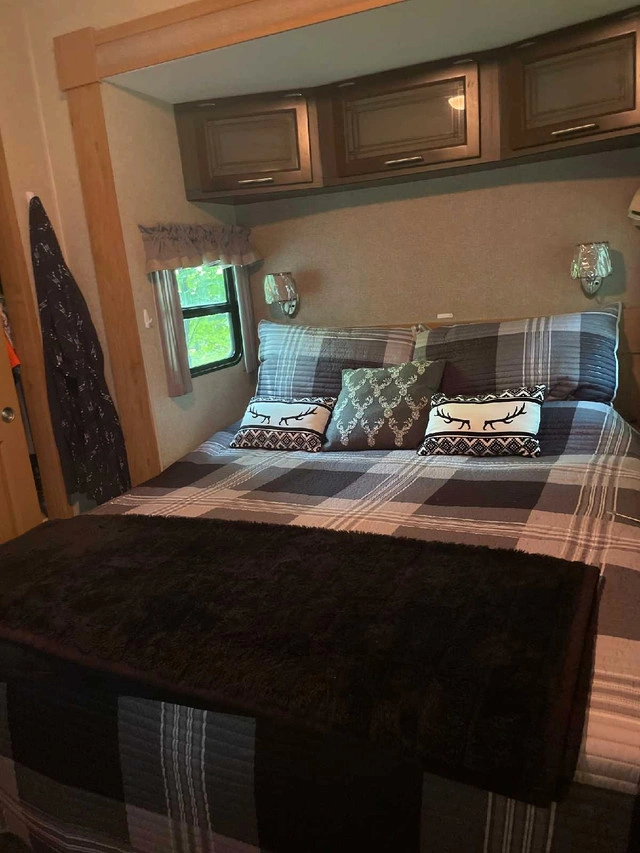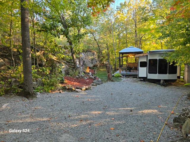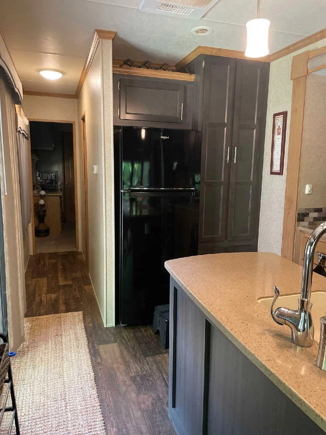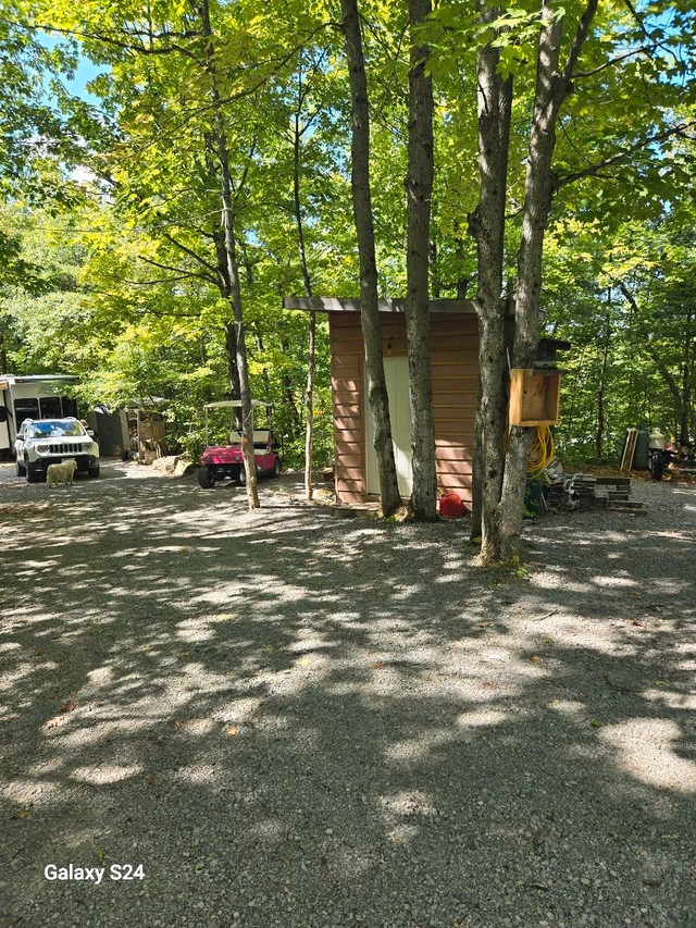 # 35 202 hidden Glen road 2019 Hy-Line 44 foot park model trailer with all the extra's Enjoy your morning coffee on your own spacious private site , watch the sun set over the water, or simply soak in the sights and sounds of nature all around you. Located in a highly sought-after park with gated entry with 104 sites. Situated a short distance from the park's marina, sandy swimming beach, pickle ball courts, volleyball, horseshoe pits, kids' playground, boat launch, many fun planned activities such as corn hole tournaments, live bands and dances with fellow camp members. Where else can you find direct waterfront access to Georgian Bay with a designated dock and boat slip in Muskoka at this price? Don't miss this opportunity - pack your suitcase and start making memories! Site 35 is considered one of the most private in the Park with its own private laneway. Tons of room for all your parking needs. Beautifully landscaped Canadian shield rock wall with custom built in fire pit. A 12x24 covered deck includes lighting and ceiling fan. Site also includes: Custom painted (Pink) gas powered Golf cart with rear flip seat 1st shed with full sized fridge and plenty of room to store all your outdoor games 2nd shed with work bench and shelving for all your tool storage Bunkie comes with a double and single bed, tons of windows for plenty of beautiful evening breezes for your guests, patio door allows for tons of extra light. Key features include opposing slides for spacious living, bay front windows for natural light, a one-piece fiberglass front, and construction with high-efficiency insulation for durability. This model is designed for three season use and offers residential comforts such as a ceiling fan, solid wood cabinet doors, and full sized appliances. Spacious and well-appointed 44-foot Park Model trailer with 3 slide-outs, offering a residential feel and plenty of comfort : Rear King Bedroom with double closet, ample storage, and under-bed compartment 3-Piece Bathroom with full-size shower, linen closet, and modern fixtures Front Living Room featuring 2 recliners, electric fireplace and entertainment center, and ceiling fan Open Kitchen/Dining Area with center island (double sink), and lots of counter/cabinet space, interior boasts deluxe crown molding, high-efficiency LED lighting, residential table and 2 chairs Electric or Propane Hot Water Heater & Gas Furnace The unit is built with a truss roof and 3/8" decking and floor ducted heating and air conditioning Construction features include an I-beam frame, spring axles, and a full underbelly wrap, ensuring a durable and long-lasting unit. Additional features: A detachable hitch, flush-floor push-outs, and a full underbelly wrap. *Seasonal May 1- October 31 *Designated dock and boat slip for a modest extra fee* Please contact for your personal viewing
