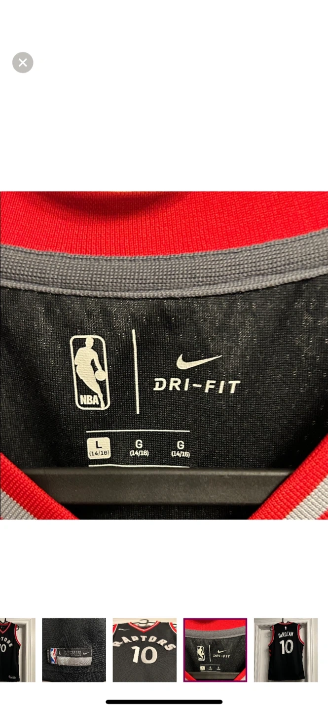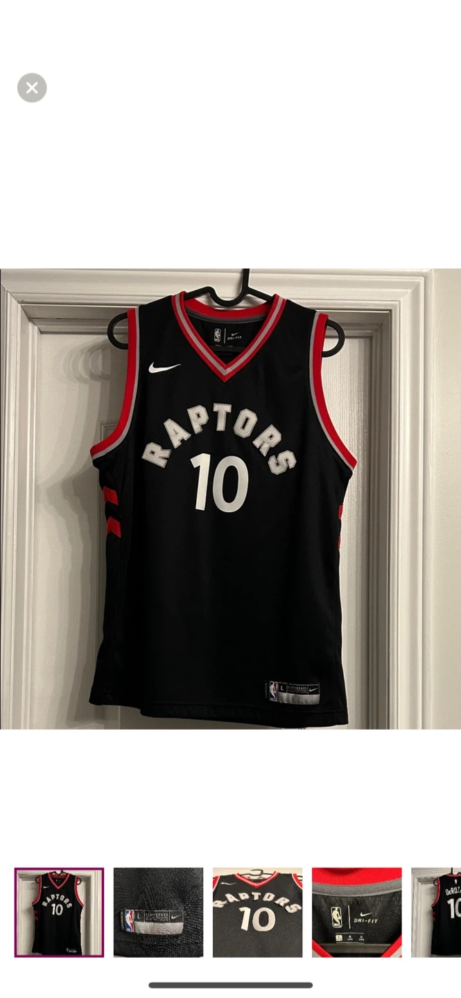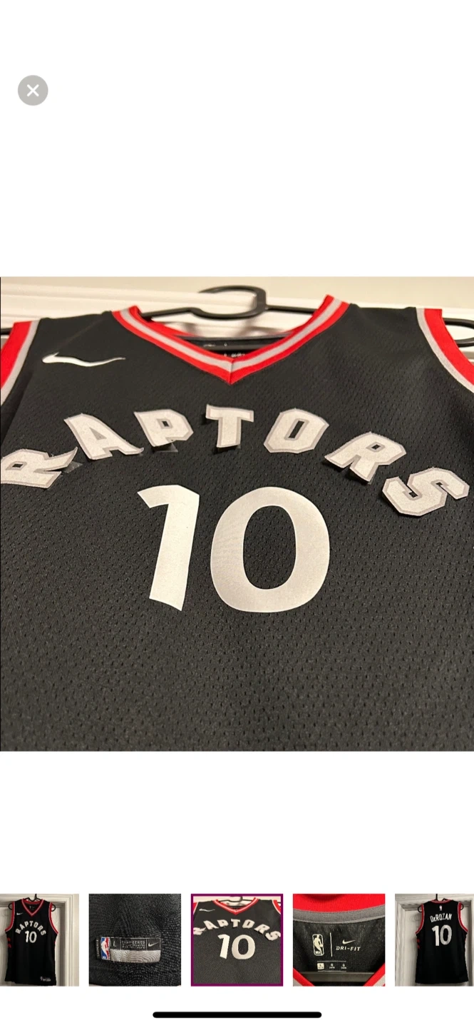Selling a Nike Toronto Raptors DeRozan #10 jersey in size youth L. The jersey features Nike's Dri-FIT technology to keep you cool and comfortable, whether you're on the court or cheering from the stands. Please see front letters are lifting and need to be reglued.