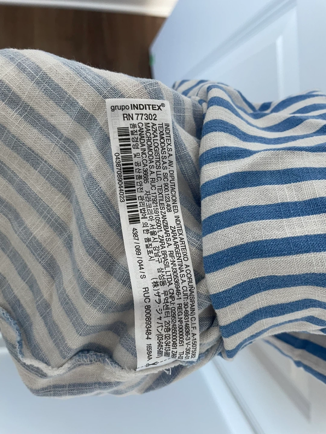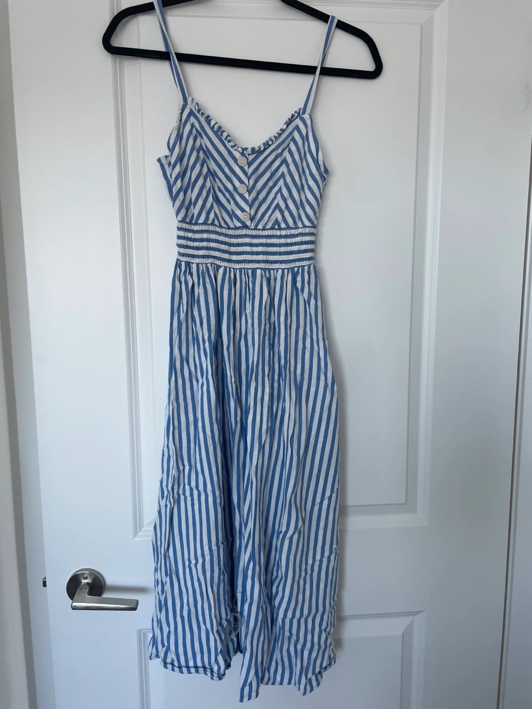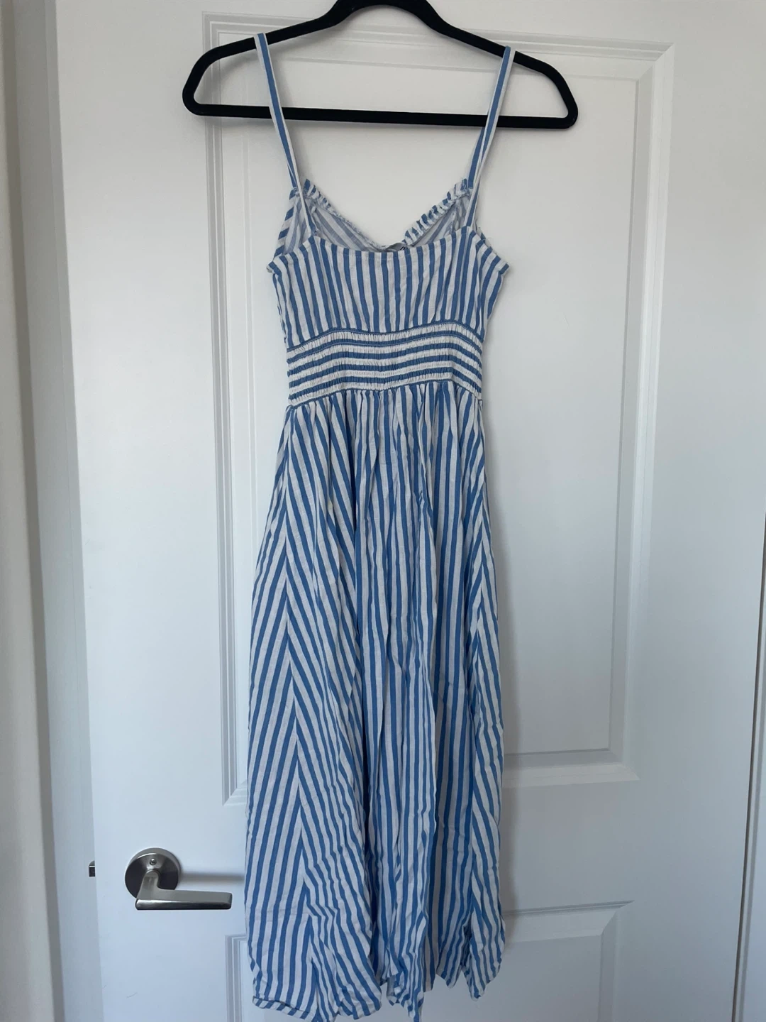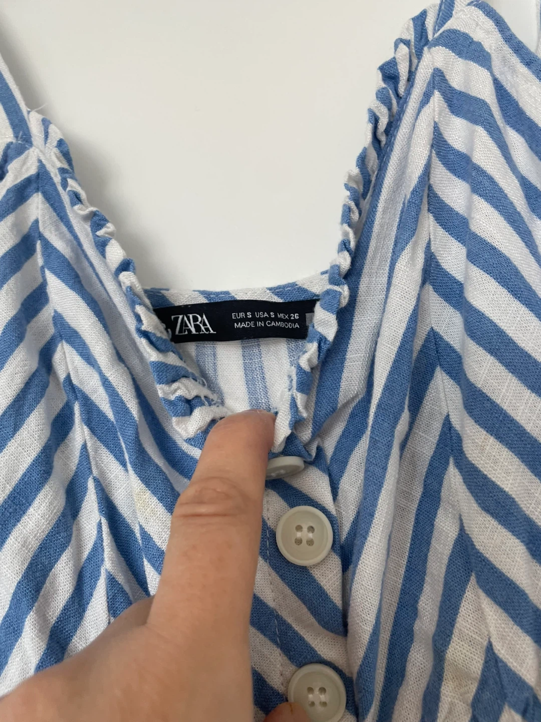 This is a cute Zara sundress in a blue and white striped pattern. It's a size small and perfect for summer days. The material is lightweight and breathable, making it super comfy for warm weather!