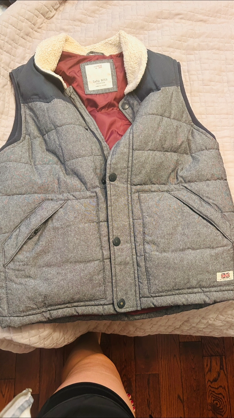 Here's a Zara Boys Collection puffer vest! It features a sherpa-lined collar and a grey outer material. Perfect for layering during the cooler months!
