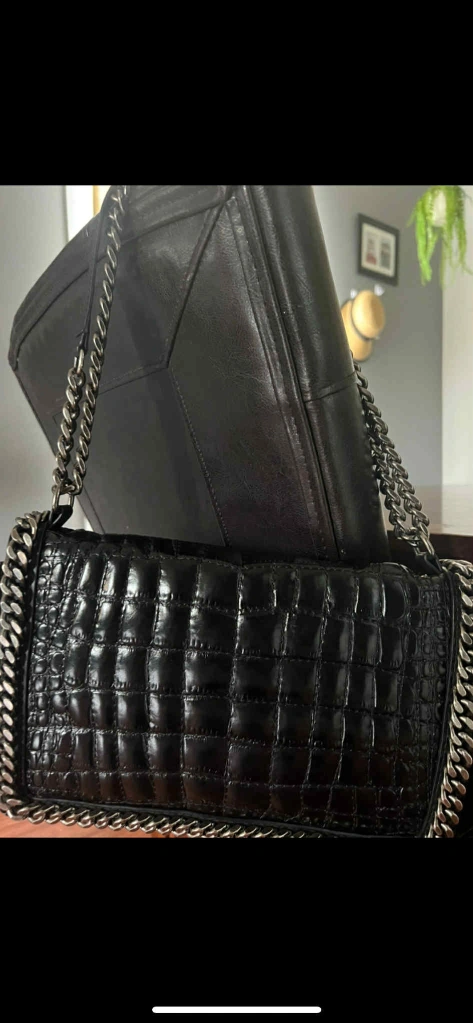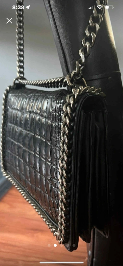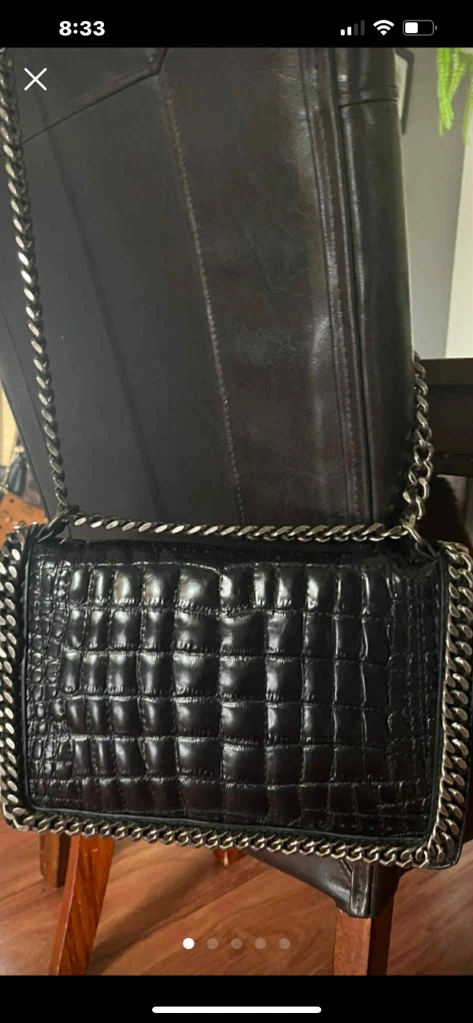 It features a distinctive chain trim and a faux crocodile skin texture. The interior is spacious and includes a magnetic closure. It's a stylish and ethical choice for any fashion-conscious individual almost brand new very clean inside and out pick up or deliver