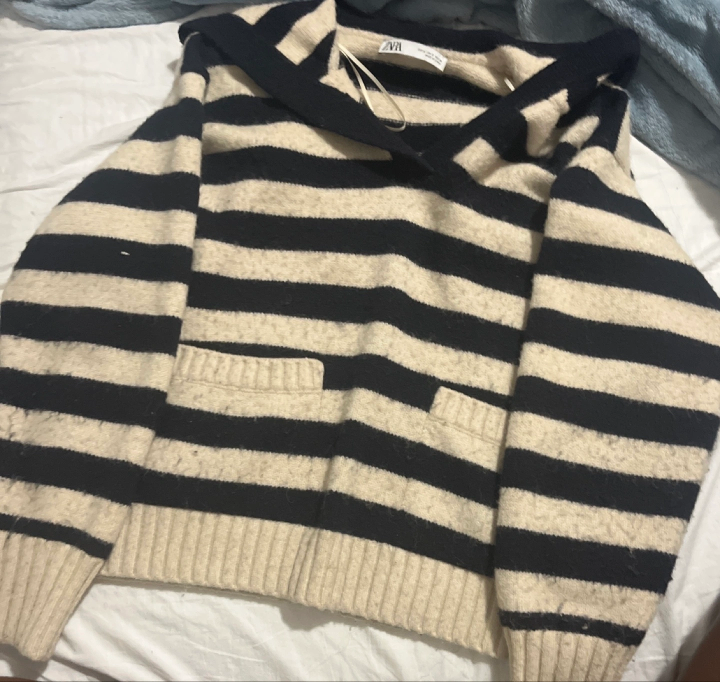 Cozy Zara knit sweater with a stylish striped pattern! It features a contrasting collar and two cute front pockets. Perfect for layering or wearing on its own during cooler days