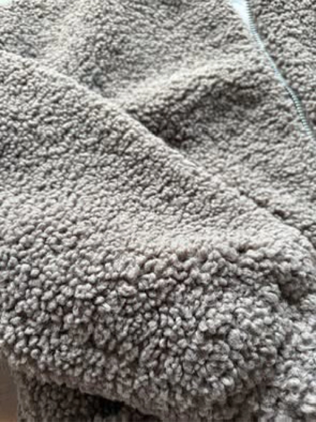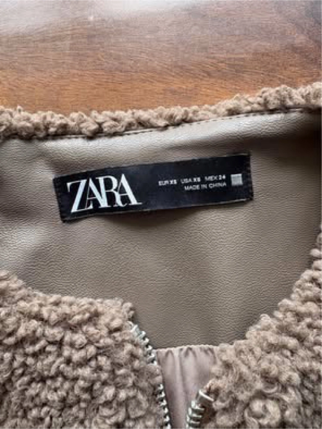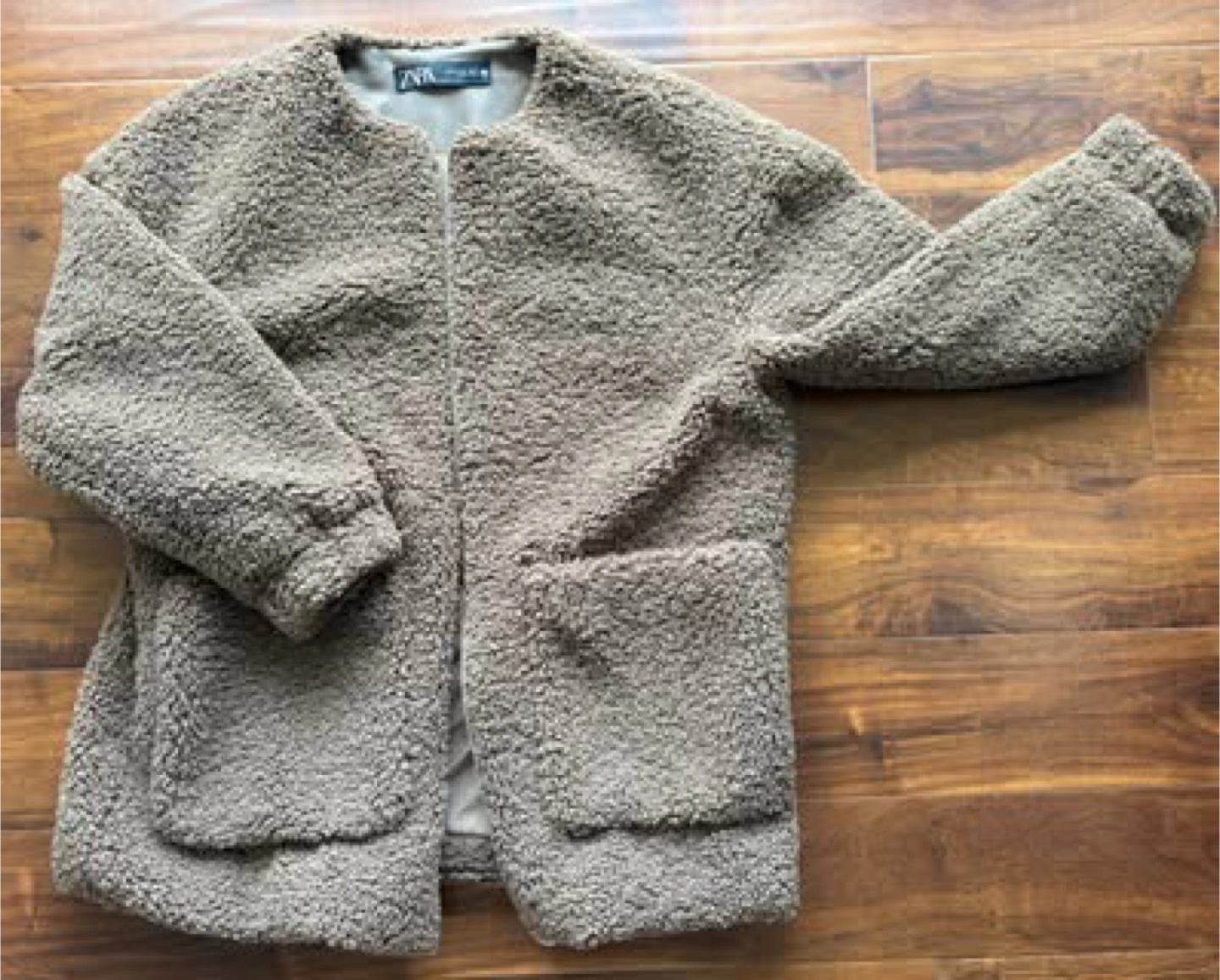Women's taupe teddy coat. Long sleeves, zip closure. Patch pockets. Soft, fluffy material. Size XS
