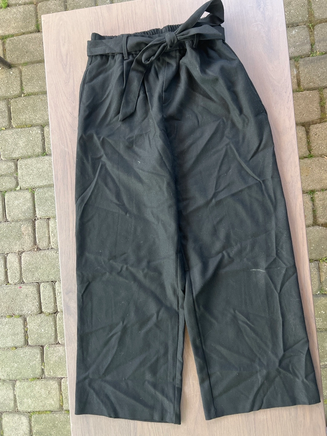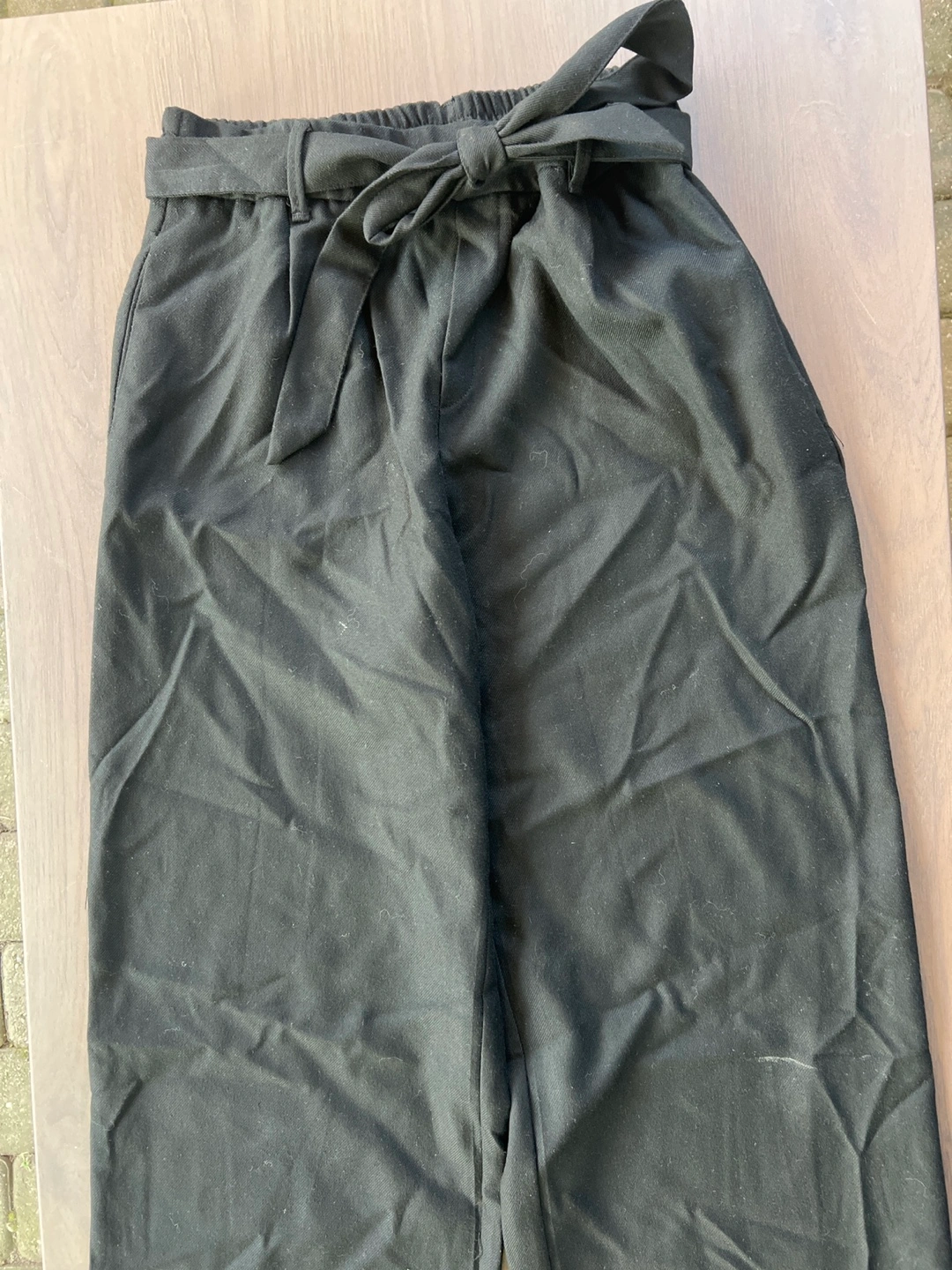 These black pants feature a high waist with a tie. They have a comfortable, wide leg design. Perfect for a relaxing evening at home.