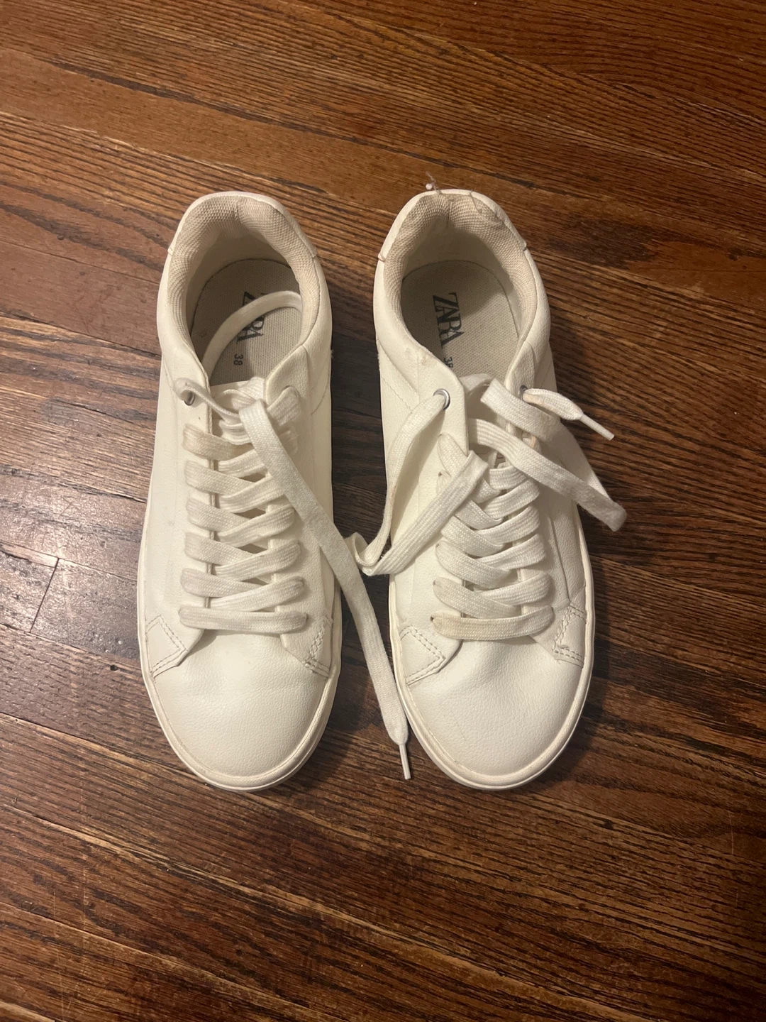 Selling a pair of Zara white sneakers in size 38. They're in good condition and have lots of life left! Perfect for everyday wear. only wear ones to a wedding.