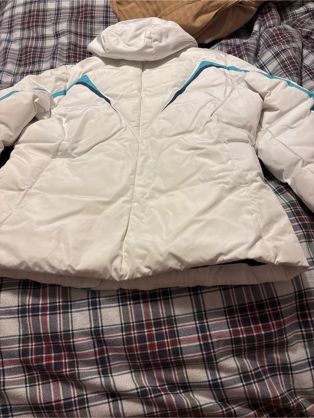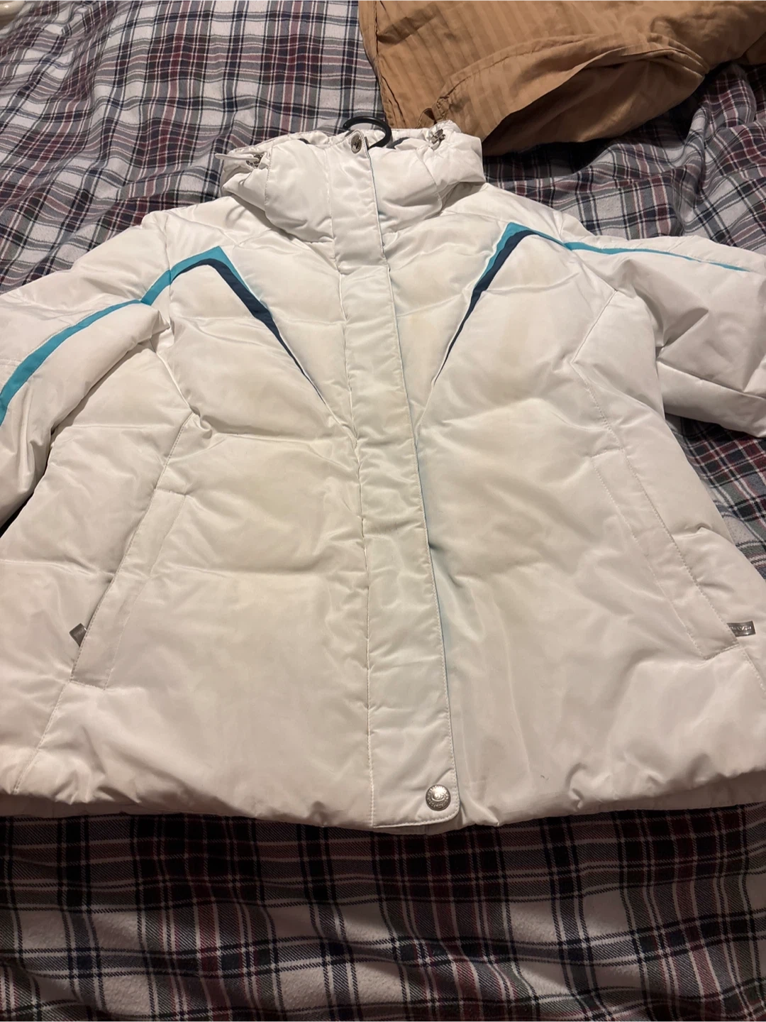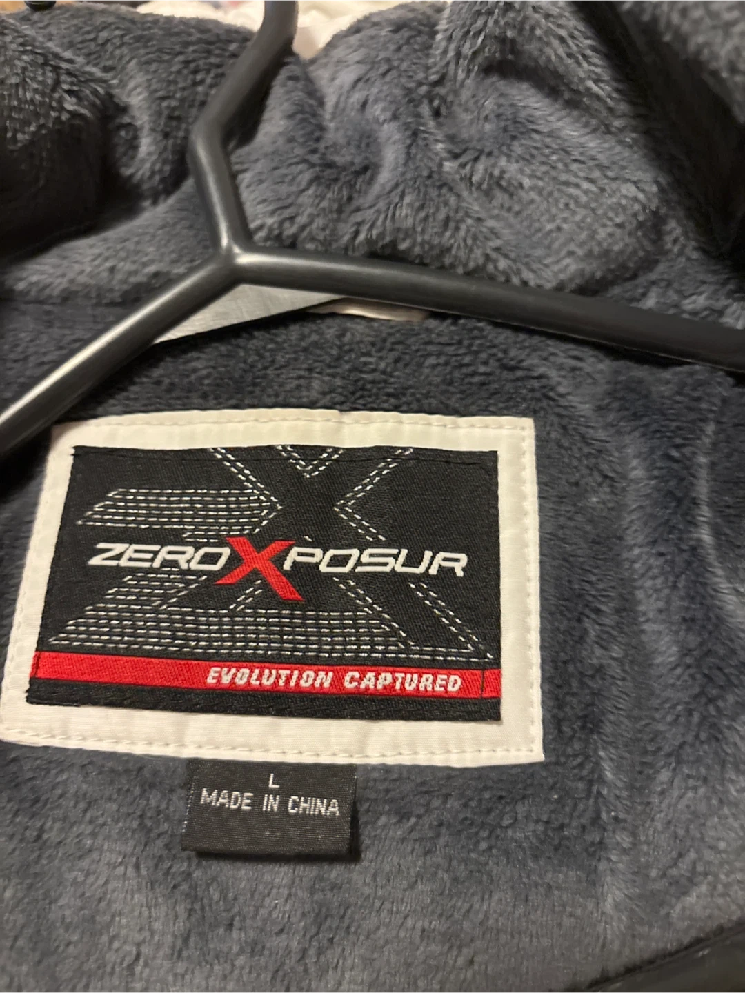 Selling a ZeroXposur white puffer jacket in size L. It features a hood and a stylish design with blue accents. Perfect for staying warm and cozy during the colder months!