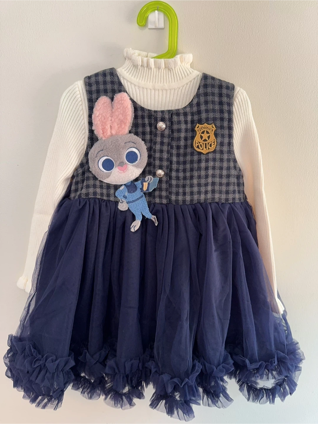 A cute girl's dress with zootopia Judy badge design! It features a checkered top and a navy blue tulle skirt. A white long-sleeve top is also included to complete the outfit