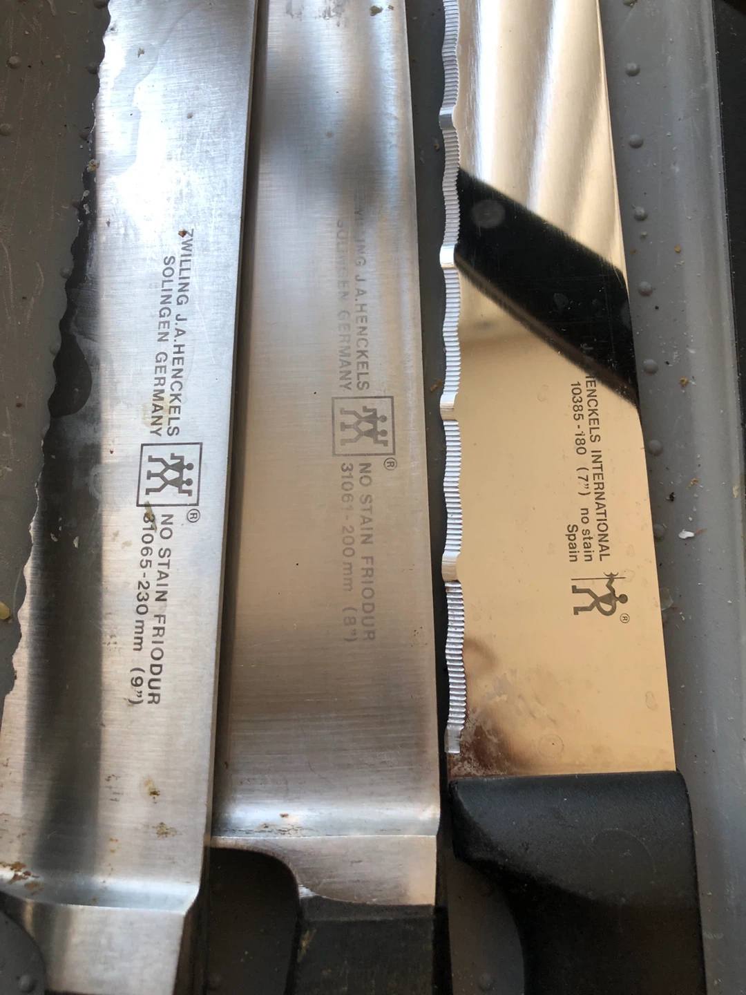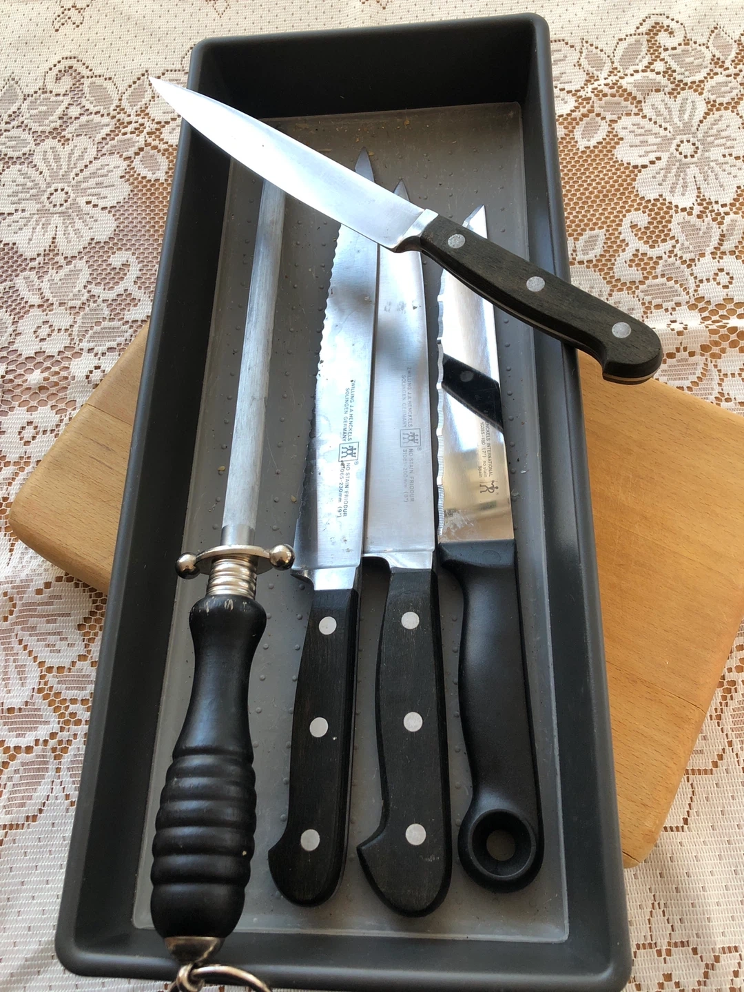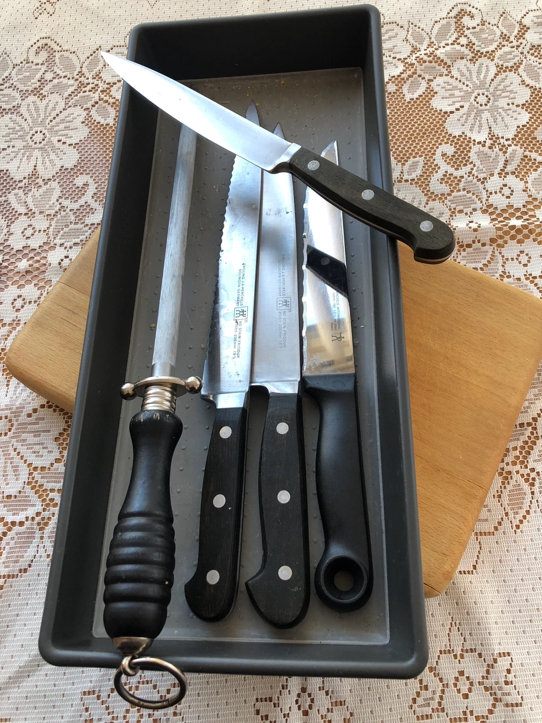 Selling a set of Zwilling J.A. Henckels knives. The set includes various types of knives and a sharpening steel. Great for any kitchen!