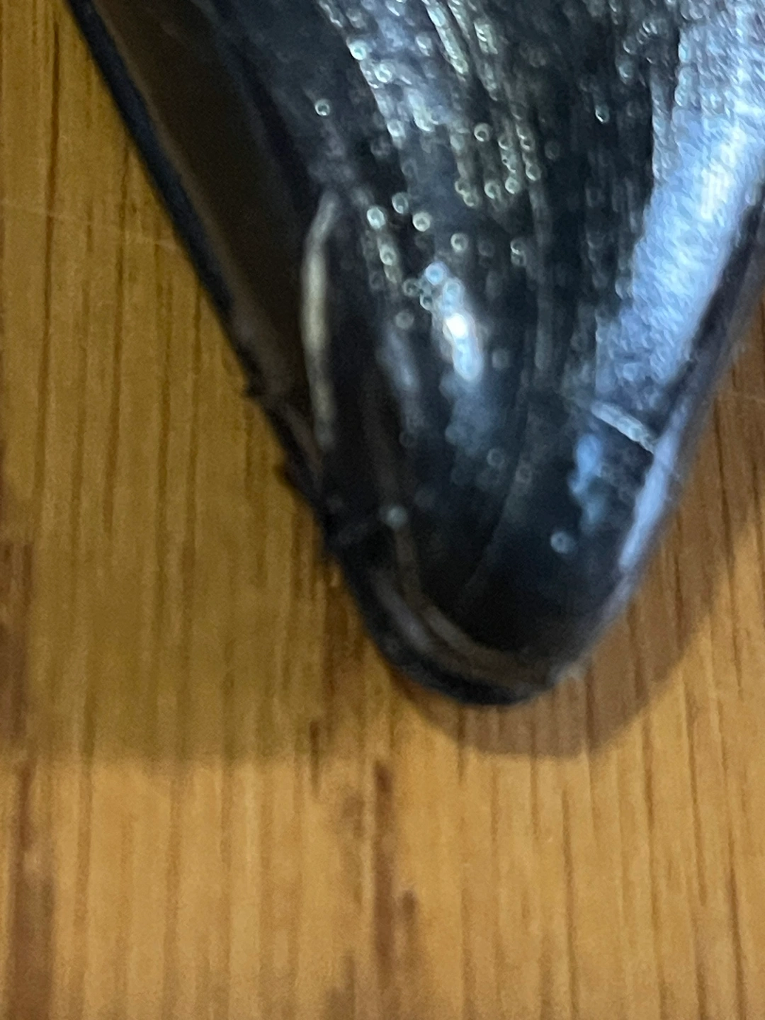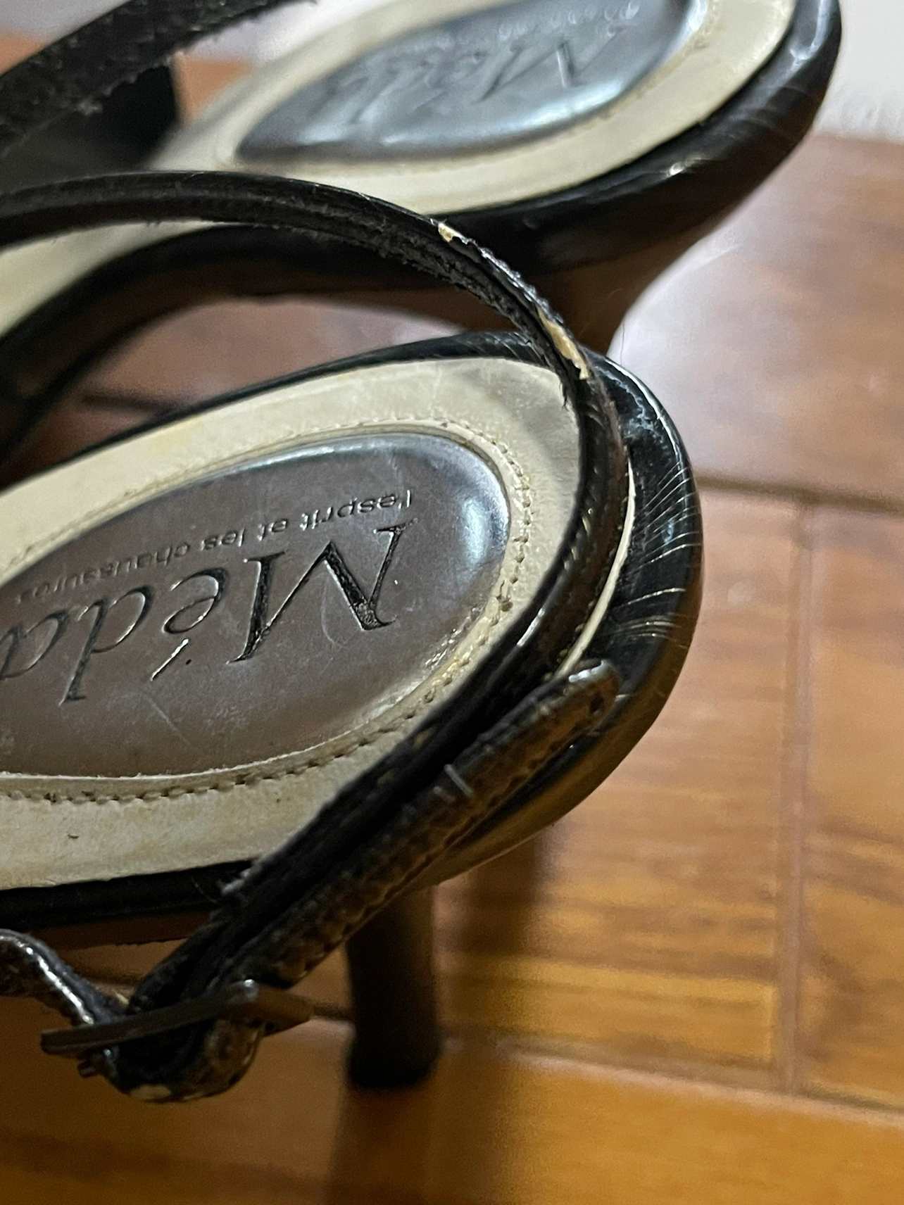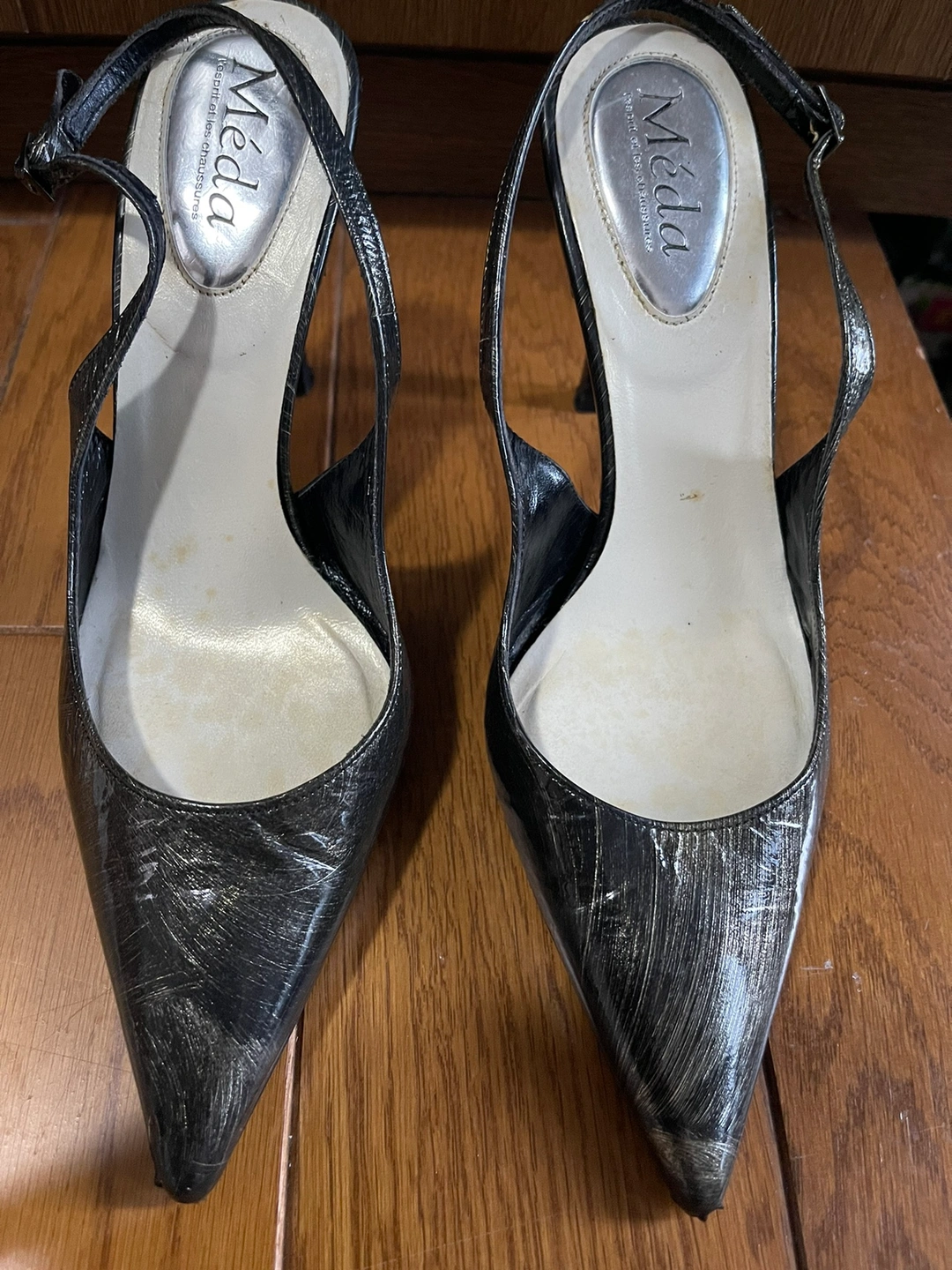 パーティー用に購入して、現地で2度ほど履きました。 往復は別の靴でしたので着用は合計でも数時間ですが、先が尖った型のためか、右に1センチの傷とめくれ、左も先端に微小の傷あります。 左足のベルトにも2箇所のめくれを見つけました。 黒とグレーのオシャレで大変気に入っておりましたが、膝を悪くし、ハイヒール が履けないのでお譲りしたいと思います。 長らく自宅保管の事、中古品であります事をご了承頂ける方宜しくお願いします。