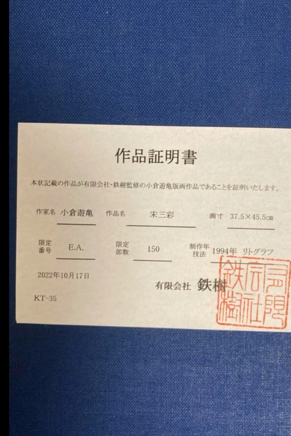 作品証明書付 小倉遊亀 リトグラフ 「宋三彩」 額装 外箱付 金彩のとても豪華な逸品です。 発行元の外箱付 ウコン染めの布袋付 横65㎝×縦57㎝ 画サイズ:横44㎝×縦36㎝ 発売元 資生堂ピクチャーズ 発行 求龍堂 小倉遊亀(おぐらゆき) 1895 滋賀県大津市生まれ 1917 奈良女子高等師範学校卒業 1920 安田靫彦に師事 1926 院展初入選 1929 日本美術院同人('58評議員、’78年理事、'90理事長、'96名誉理事長) 1954 第4回上村松園賞を受賞 1955 芸能選奨美術部門文部大臣賞を受賞 1961 日本芸術院賞を受賞 1976 日本芸術院会員(第一部では上村松園以来2人目の女性会員) 1978 文化功労者 1980 文化勲章(上村松園に次いで女性画家2人目) 1981 日本橋三越にて「文化勲章受章記念 小倉遊亀展」開催 1996 日本美術院名誉理事長に就任 2000 逝去(享年105歳) 2002 「小倉遊亀展」(東京国立近代美術館・滋賀県立近代美術館) <所属> 日本芸術院会員、日本美術院名誉理事長 <特徴> 日本を代表する女性画家。骨太な線描、澄んだ色彩、明快な造形によって生まれた作品は理知的で人間的な温もりに満ちている。 <作品収蔵> 東京国立近代美術館、東京都現代美術館、、山種美術館、東京藝術大学大学美術館、滋賀県立近代美術館、神奈川県立近代美術館、横浜美術館、敦井美術館(新潟県)、小松市立本陣美術館、MAO美術館(静岡県)、フジヤマミュージアム(山梨県)他 安田靫彦に師事し、日本美術院に属する画家として活躍、女性として初の日本美術院理事長になるなど、まさに女性日本画家のトップと呼ぶべき優れた画家です。およそ80年の画業の中で同時代の女性像や静物を、力強い構成と鮮やかな色彩で生き生きと描きだしました。