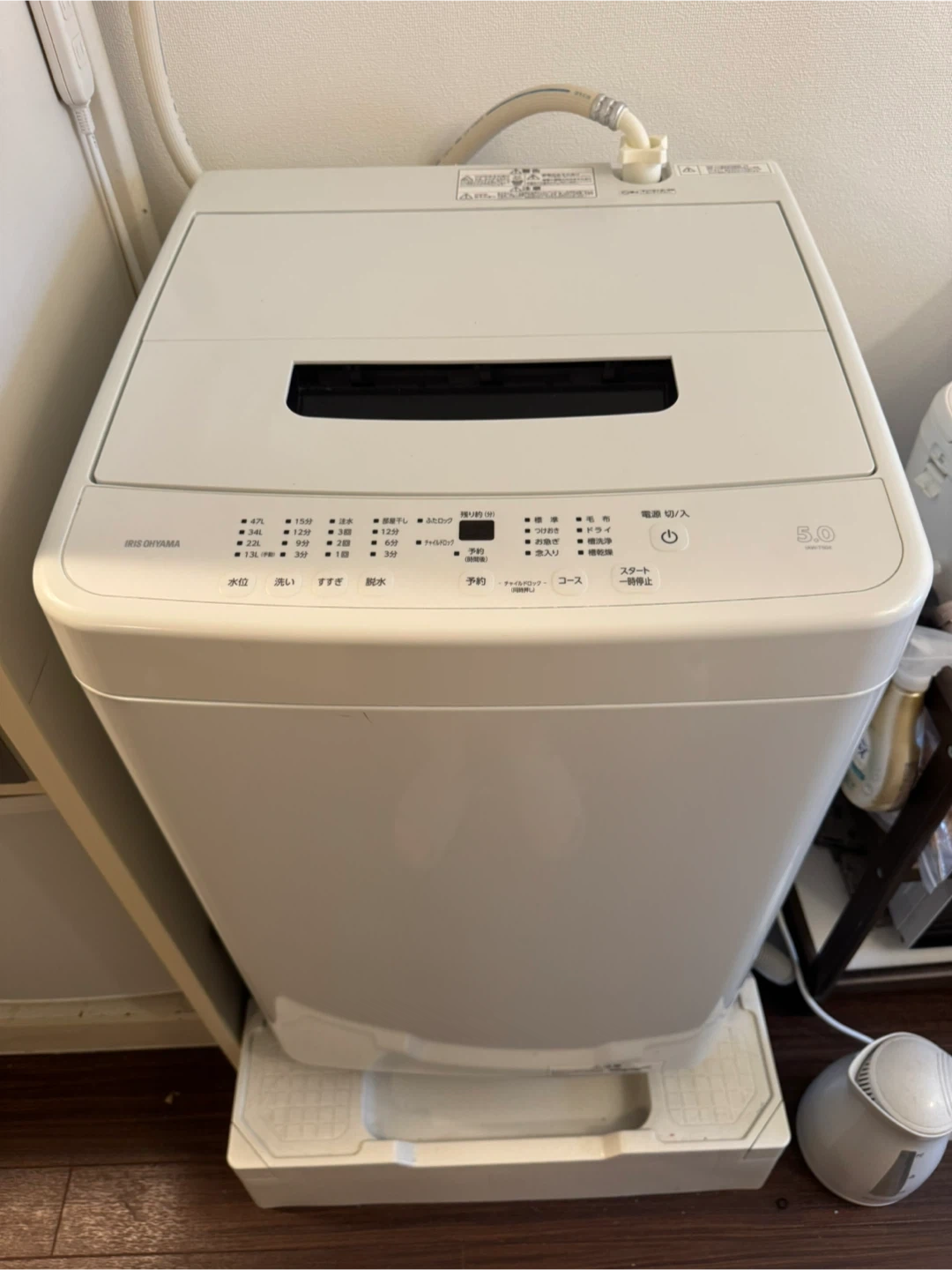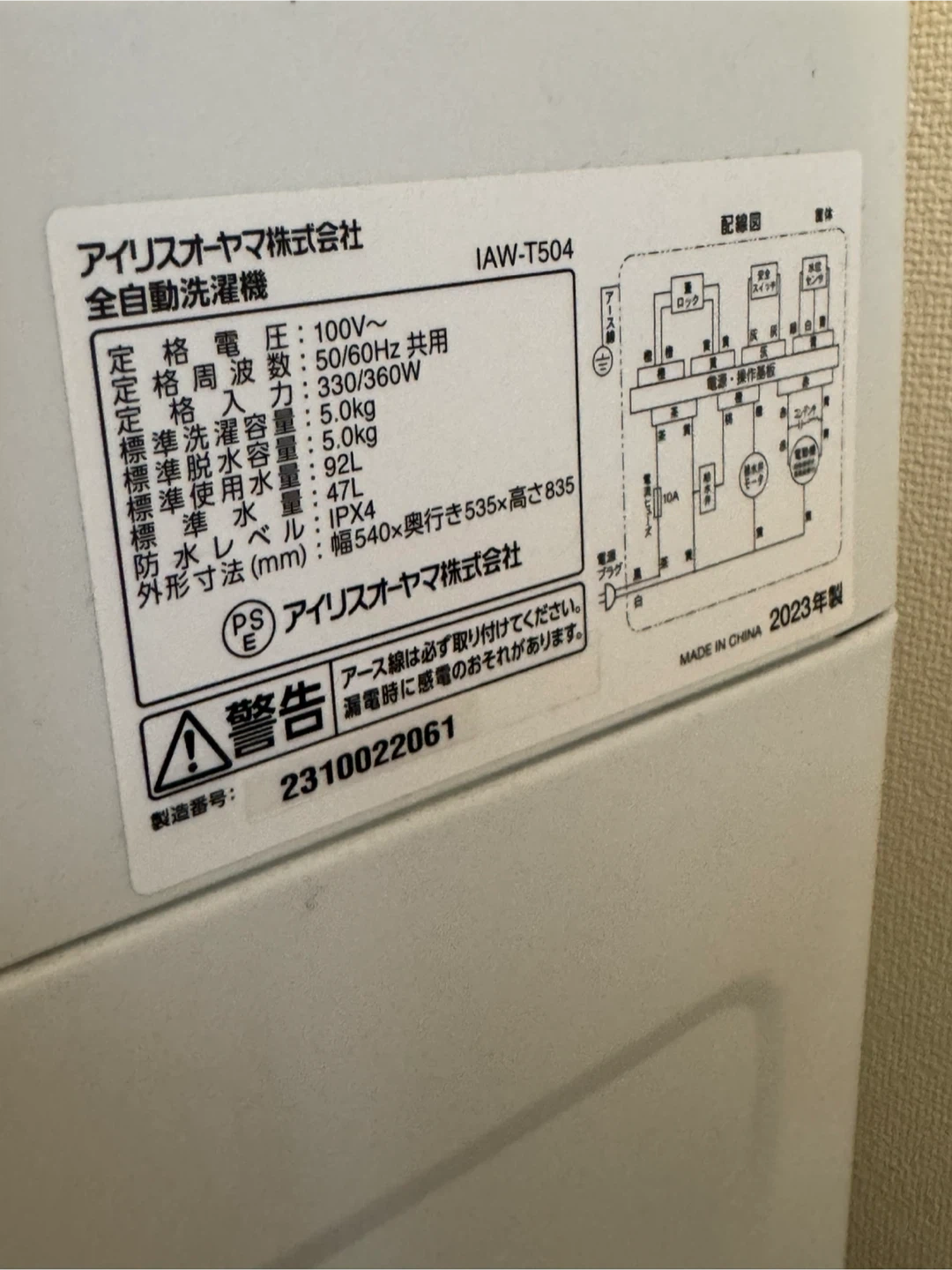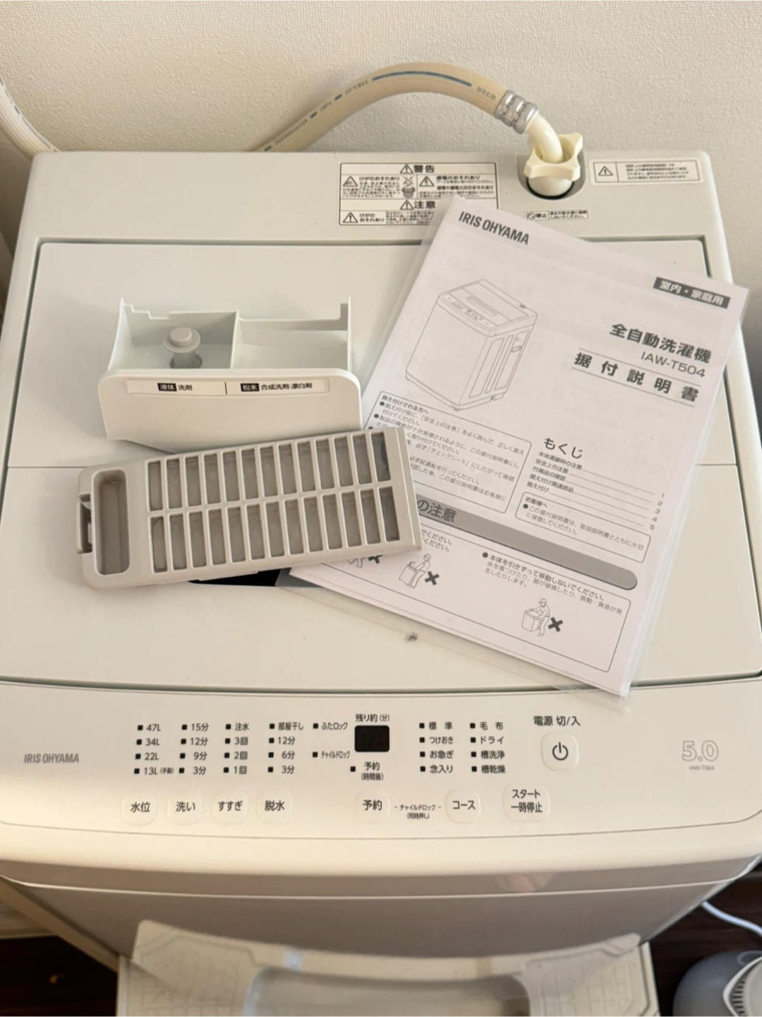 アイリスオーヤマの全自動洗濯機です 【情報】 ブランド:アイリスオーヤマ 型番:IAW-T504 容量:5.0kg 年式:2023年製 【状態】 使用感少なめ、全体的にきれい 【付属品】 取扱説明書、糸くずフィルター 1年ちょっと以上使用した洗濯機です。 特に問題はなく、毎回使うたびに内側をクリーニングしているのできれいです。 引っ越ししながら必要がなくなったので安く出します。 配送は行っておりません。