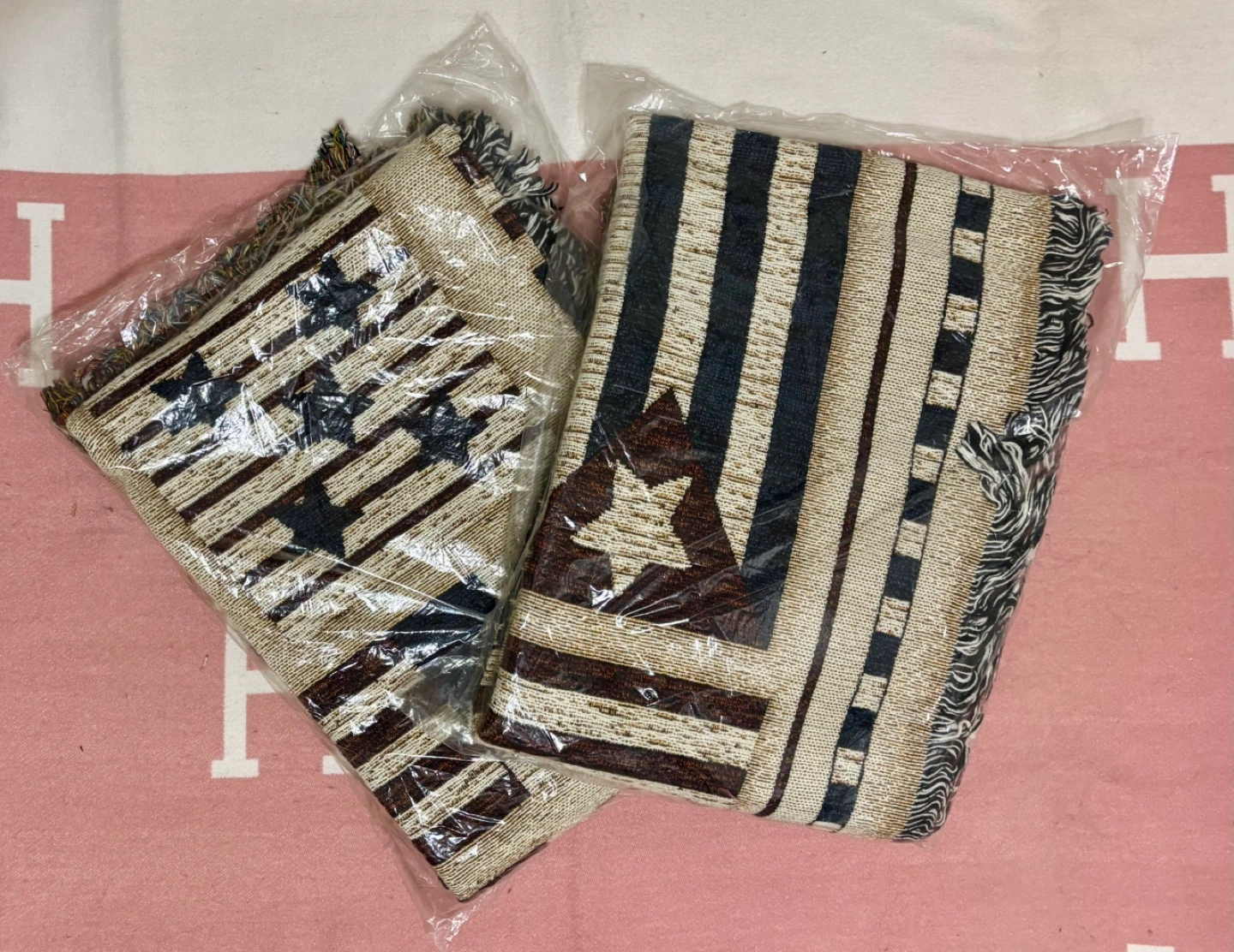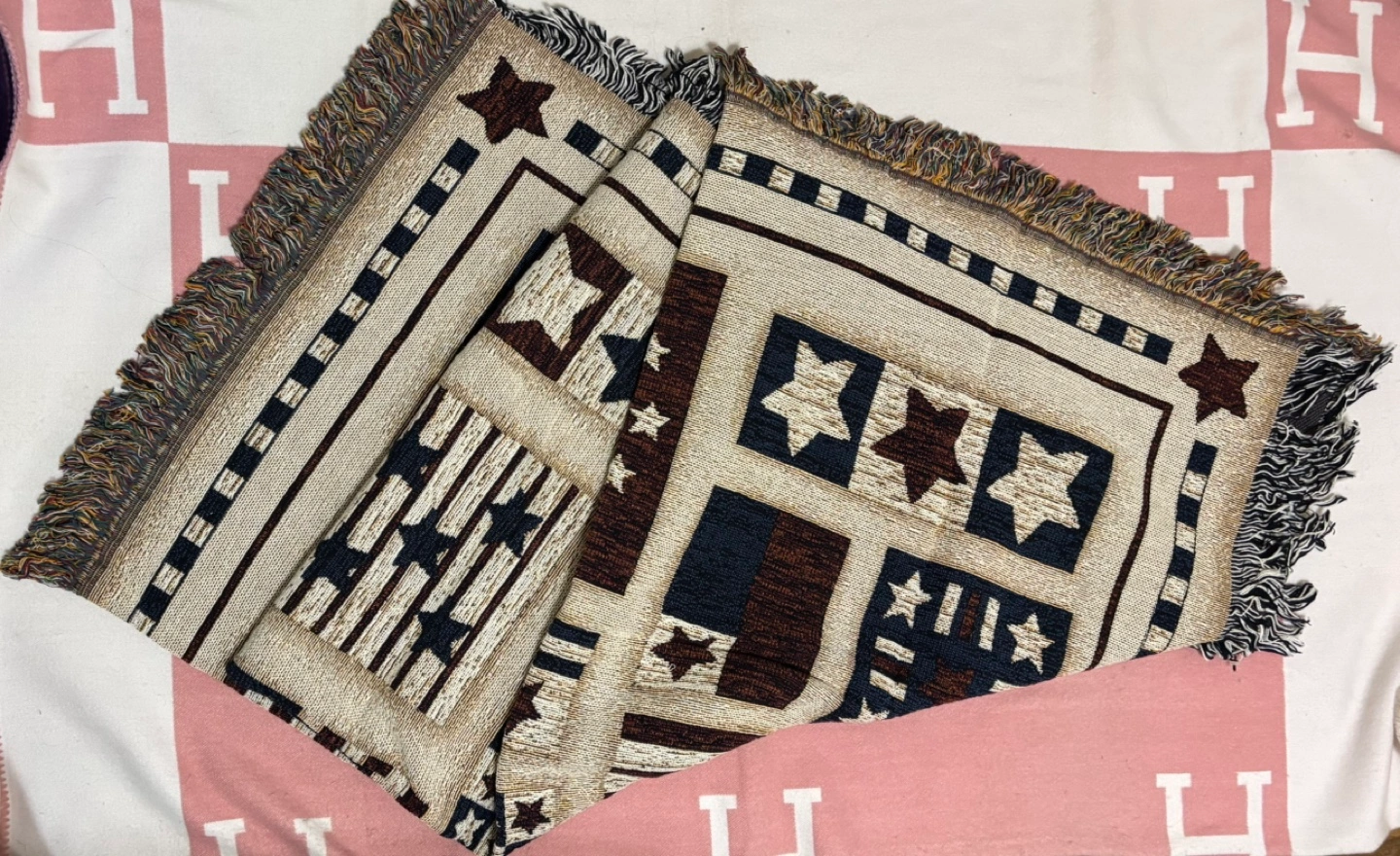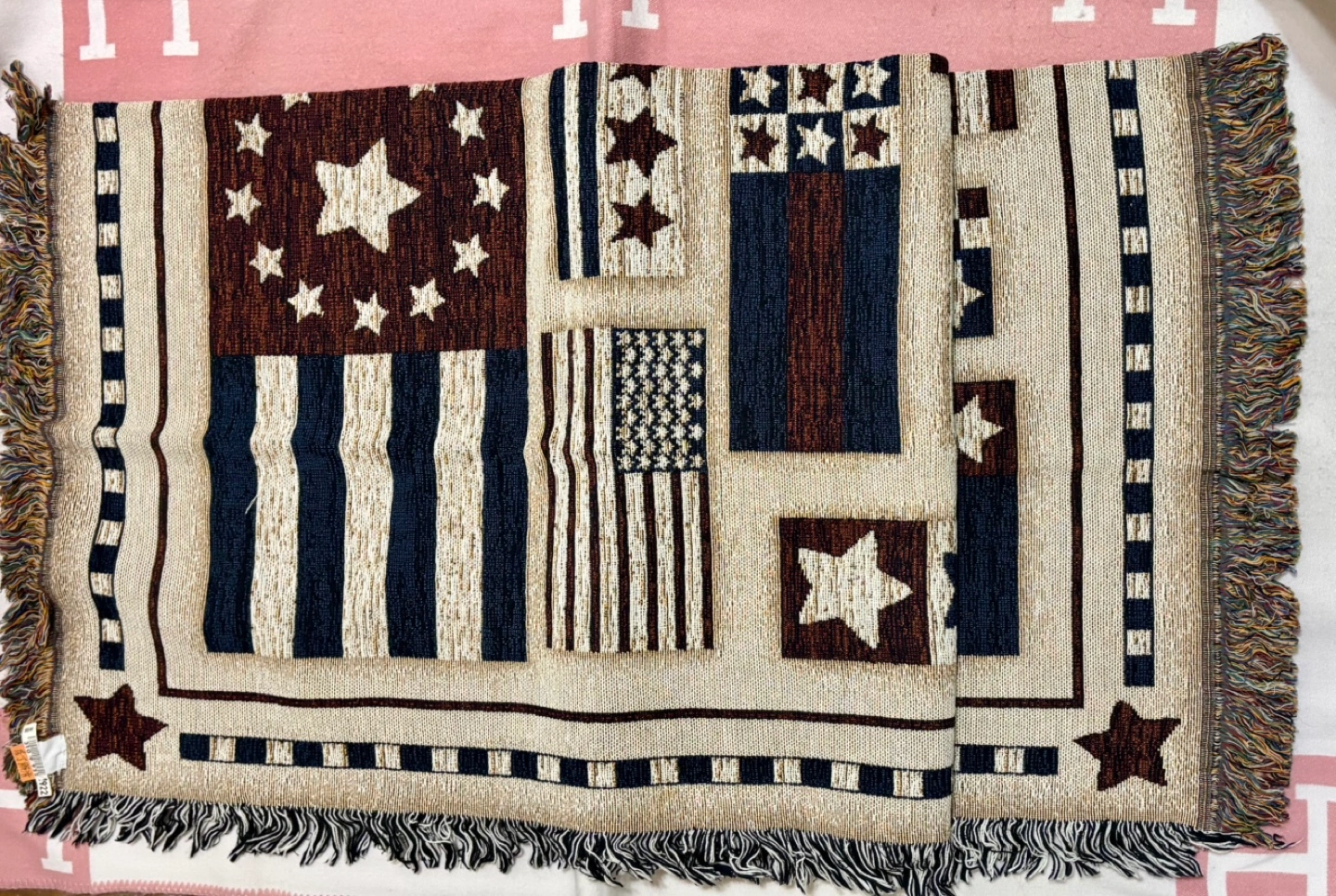 アメリカンフラッグ 星条旗 ヴィンテージ風 ラグ マルチカバー ほぼ未使用品 大きさ(メジャー測り) 140cm×180cm 1点のお値段になります。 2点ございます。 こちらはアメリカン調な家具やお部屋に凝っていた頃に、LAにて購入してきましたラグ・マルチカバーになります。 ベッドメイキング後に上に乗せていただけです。 クリーニングに出しております。 今はアメリカン調からホワイト家具にガラッと変えてしまいましたので、もう使用する事もないのでアメリカンがお好きな方にいかがでしょうか?