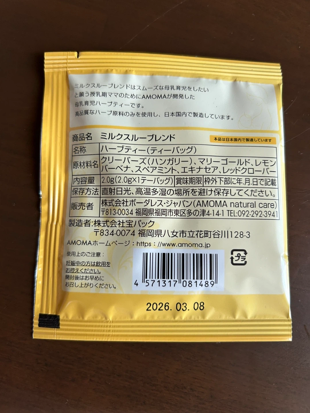 アモーマのミルクスルーブレンド ハーブティーです 【情報】 ブランド:アモーマ 商品名:ミルクスルーブレンド 種類:ハーブティー(ティーバッグ) 内容量:2.0g(2.0g×1ティーバッグ) 賞味期限:2026年3月 7袋 中古品であることご了承ください。
