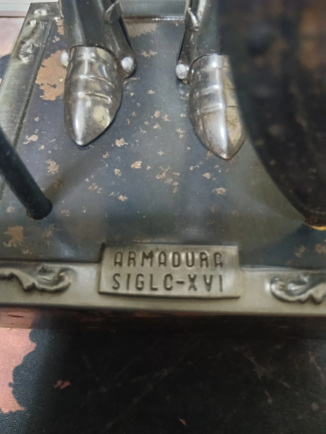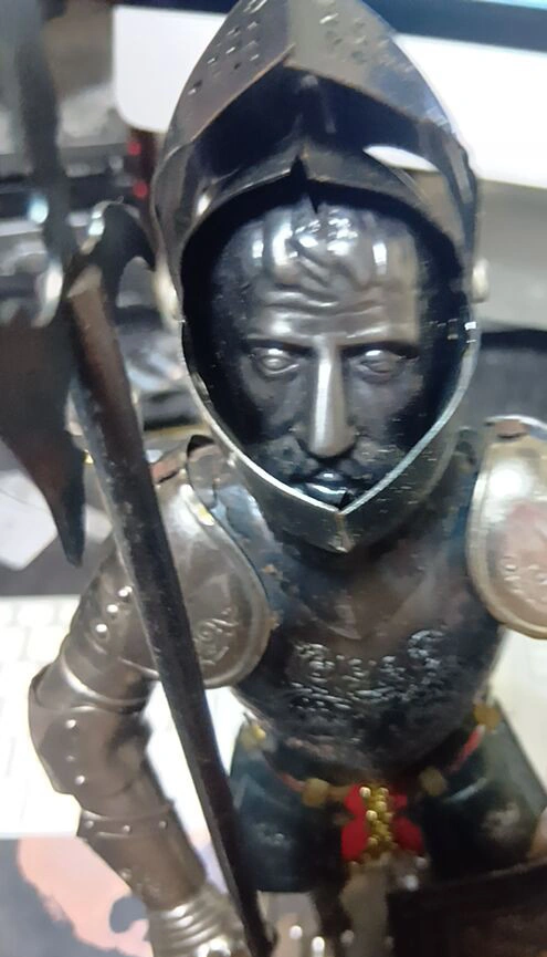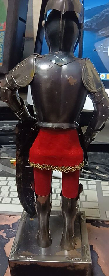ご覧頂きありがとうございます。 こちらは、西洋甲冑を纏った1/6の騎士像。 本格的に組まれた甲冑と赤い衣の色合いが綺麗です。 仮面は可動します。 数年前にスペインの雑貨屋さんで入手したものの、1度も飾らずに日の当たらない場所で保管していました。 別出品のドン・キホーテとロシナンテの像もセットでご購入頂けましたら、合わせて8000円に致しますのでご検討ください。 - 素材: メタル - デザイン: 騎士像 - 特徴: 盾と槍を持つ - 色: シルバー、レッド - ベース: 金属製台座 -高さ:35cm(台座含む)