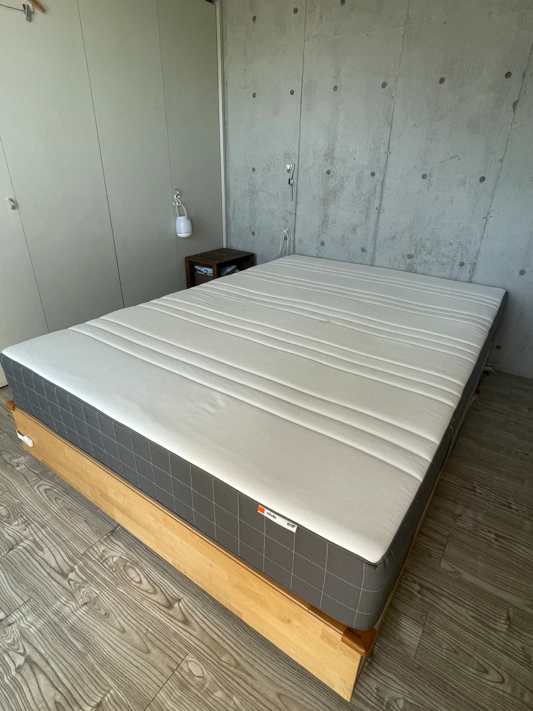 【情報】 ブランド:イケア 【マットレス】¥29,990 商品名:HÖVÅG 色:グレー サイズ:ダブル 厚さ約20cm HÖVÅG(ホーヴォーグ)は、IKEAで以前販売されていたポケットスプリングマットレスです。現在、IKEAの公式サイトでは取り扱いが終了しており、後継モデルとしてVESTERÖY(ヴェステロイ)**などのマットレスが販売されています。 【ベッドフレーム】 ¥54,990 商品名:MANDAL マンダール ベッドフレーム 収納付き 色:バーチ/ホワイト、 サイズ:140x200 (ダブル) ↓公式商品ページ IKEA からシェアされた MANDAL マンダール を確認する。詳細: https://applink.ikea.com/tY8M9r9M4w--10280482--jp--ja 中古品であるこ とご了承ください マットレスはそのまま、 ベッドフレームは解体してお渡しします。