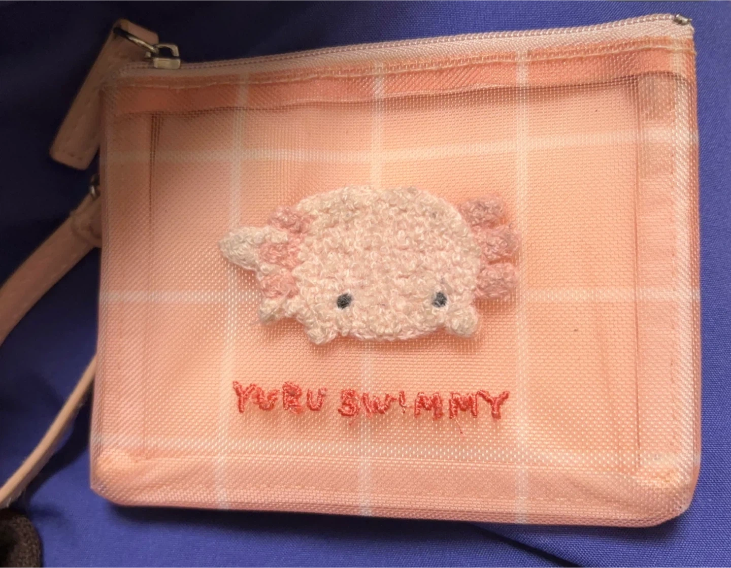 YURU SWIMMYの小物入れです ・色:ピンク ・デザイン:チェック柄、ウーパールーパーの刺繍 ・状態:使用感多め ・リール付き。裏に切符入るくらいのポッケ付き。 中古品であることご了承ください