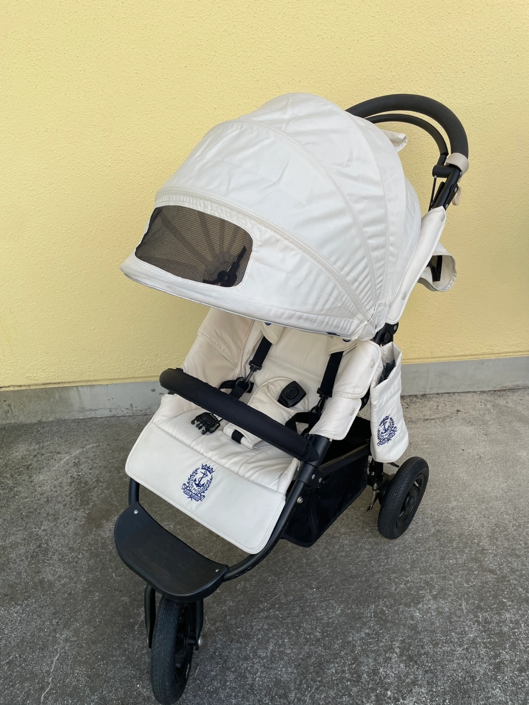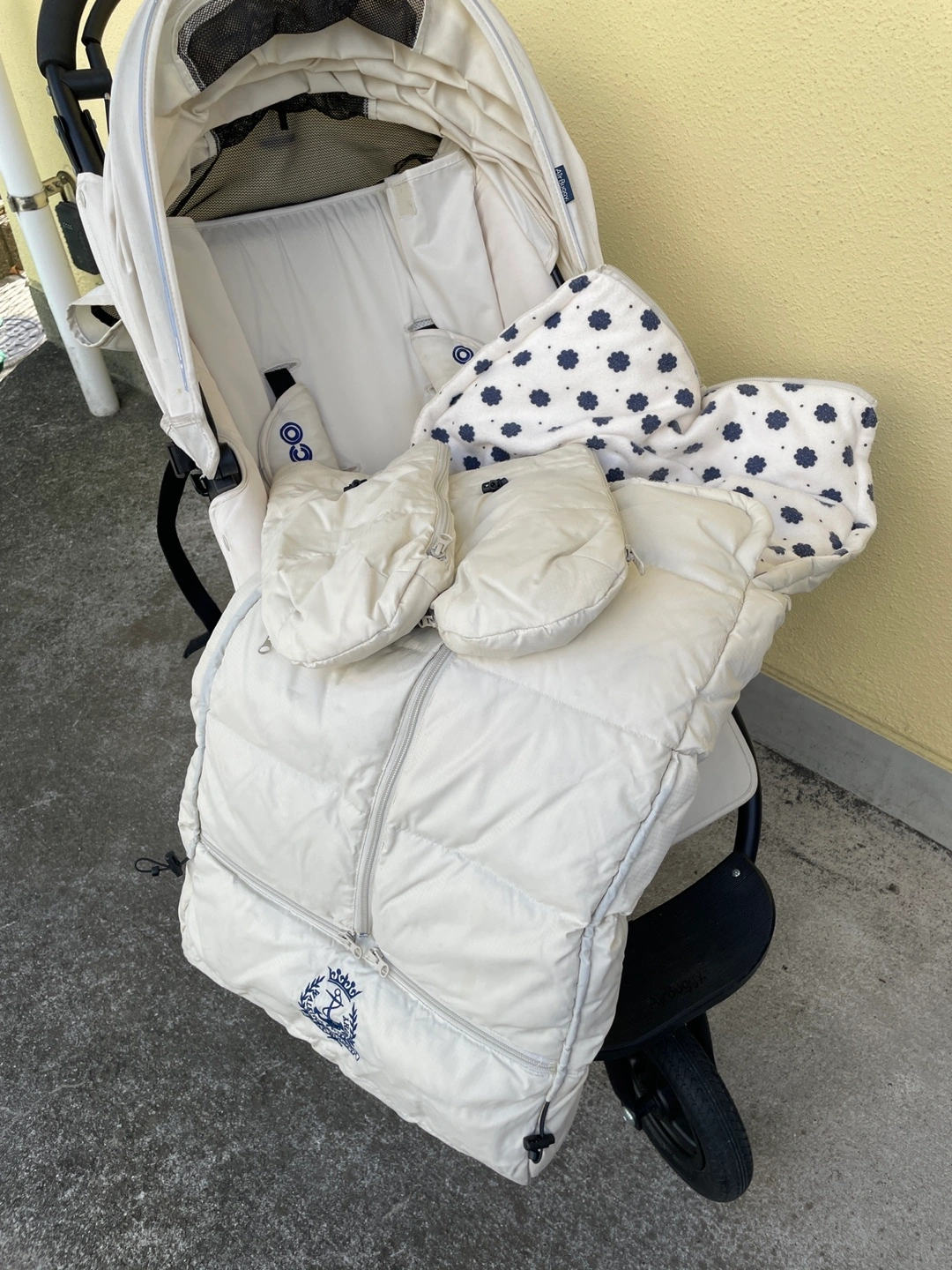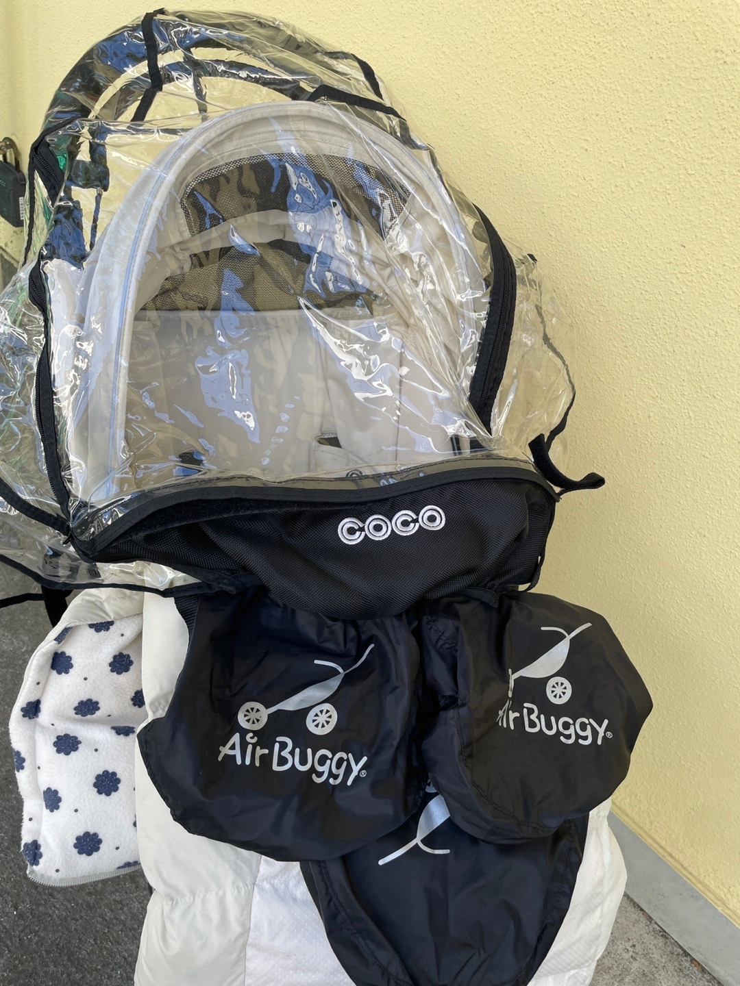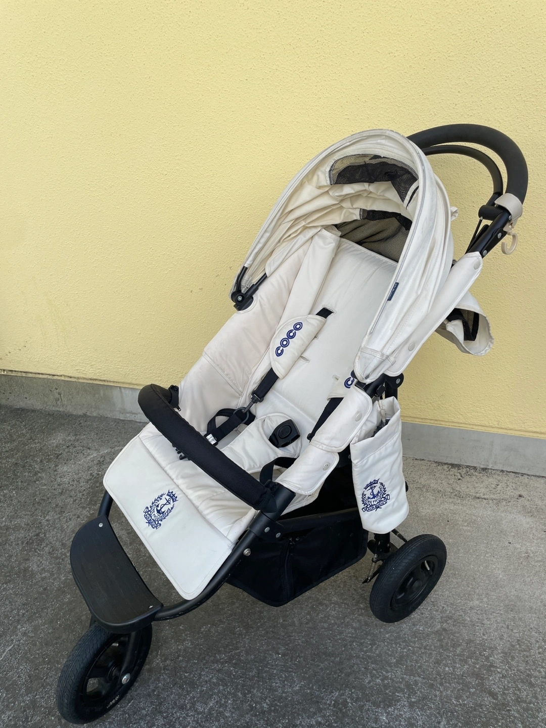 エアバギーのベビーカーです 2年ほど前にキャロットでお譲りいただきました。 乗り心地も大変良く気に入ってましたが、 B型ベビーカー購入後使用しなくなったためお譲りします。 【情報】 ブランド:エアバギー モデル:COCO 数年前に500台限定で発売されたエアバギーココ ブレーキ クルーズライン ( airbuggy coco ) ※カラーはプラチナアーモンドといってオフホワイトのようなお色で、他の方と被りません 【状態】 使用感、シミ、汚れが少しあります 【付属品】 純正の空気入れ、フットマフ、サンシェードもあります。 当方追加購入: 純正タイヤカバー、純正レインカバー(新品購入ですがもともとすこし汚れあり)、純正タイヤカバー、純正チューブ(前の持ち主の方から後輪(おそらく左?)が抜けやすいと聞いて新品購入し交換済みです。 自転車屋さんで交換対応いただき、以前のものも使える状態とのことでお渡しいたします。現状、交換した新しいものがついてます) 中古品であることご了承ください ----- 最初の持ち主の方が大切に使われていたので、年数の経った中古ですが綺麗でした。 オフホワイト系なので、通常使用による使用感があります。 また、ドリンクホルダーで1度カフェオレをこぼしてしまいその部分シミありです。 フットマフは使用感があり、ところどころに薄い汚れがあるためおまけ程度にお考えください。 受け渡しは、笹塚駅・東北沢駅も可能です。 以下商品情報詳細↓ ・対象年齢 首が据わってから(生後3ヶ月頃)~3歳頃(15kg以下) ・背面式3輪ベビーカーです。 (両対面ではありません) ・3歳まで使えるロングユースモデル ・サイズ(mm) 開:W535×D960×H1045 閉:W535×D400×H820 ・リクライニング角度2段階(110° 135°) ・本体重量:9.5kg ・操作性の良い3角構造 ・中空式大型エアタイヤ(軽快な押しやすさ・衝撃吸収) ・エアメッシュクッション(通気性・クッション性) ・ドーム状サンキャノピー ・メッシュ地サンキャノピーカバー(通気性) ・ビッグバスケット(容量17リットル・耐荷重5kgまで) ・駅の改札も通れるスマートサイズ ・ハンドブレーキ ・自立スタンド付き