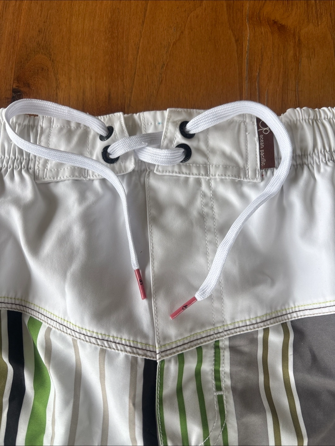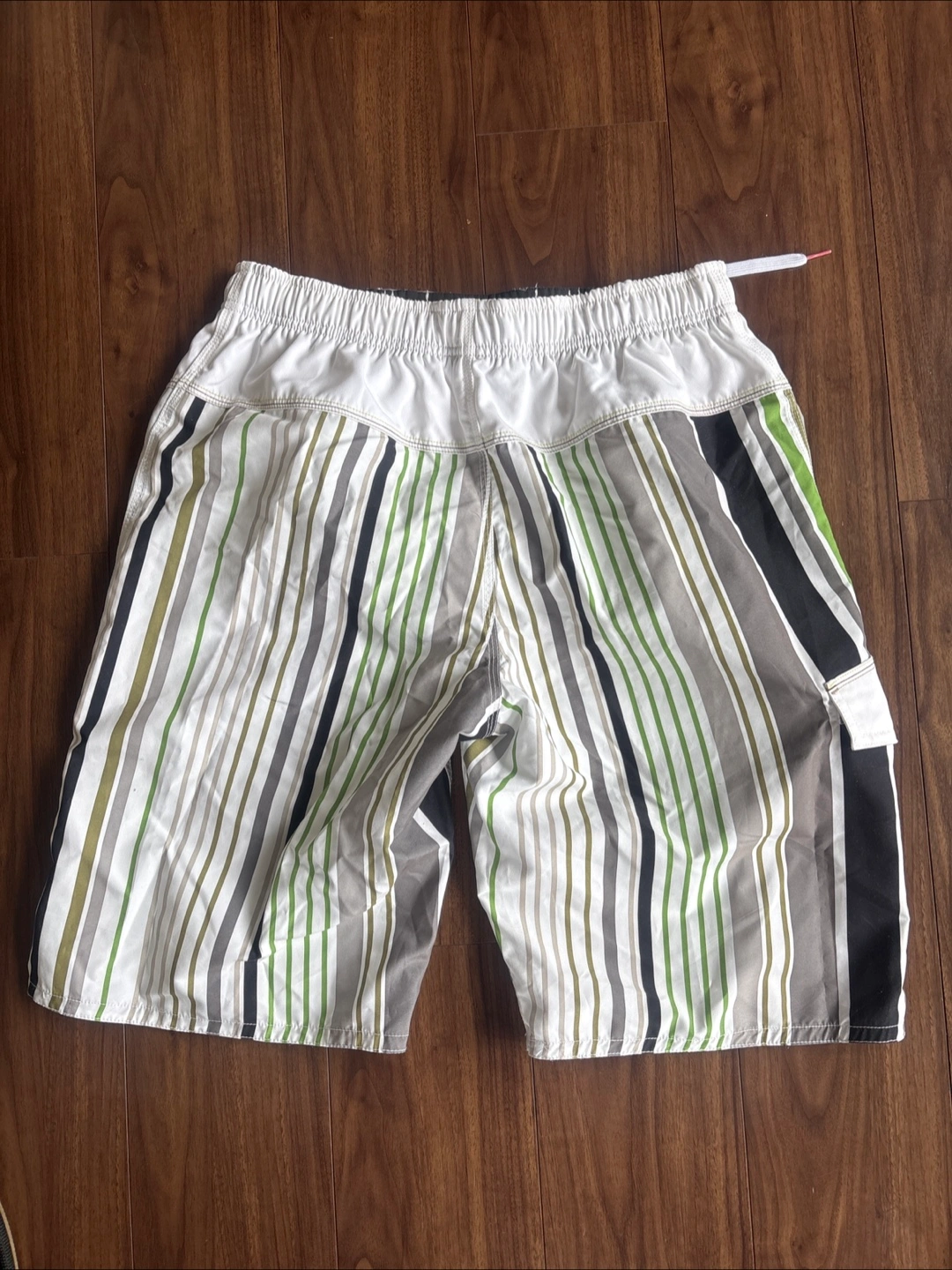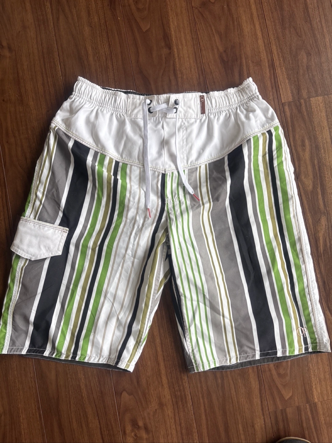 🟩メンズ ハーフパンツ水着🟩 ・ブランド:オーシャンパシフィック ・サイズ:M(胴囲76〜84cm) ・カラー:白、緑、グレー、黒のストライプ柄 ・素材:ポリエステル100% 夫曰く1、2度着用したかも?とのことです。 (※勿論、洗濯済みでの保管です) 長年保管状態でしたので今後も着用することはないとのことで出品します。 私の所見ではシミ、色褪せによる黄ばみ、ほつれ、破れは全くなかったので未使用に近い状態です。 前右下にマジックテープで止められるポケットと、ポケット内にロッカー🔑掛けの輪っか(写真⑧枚目)付き。 内側はメッシュ布になってます。 夏に向け、海やプールのレジャー用水着としておススメしたいと思います。