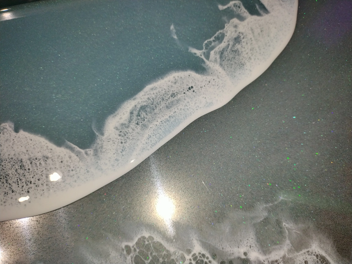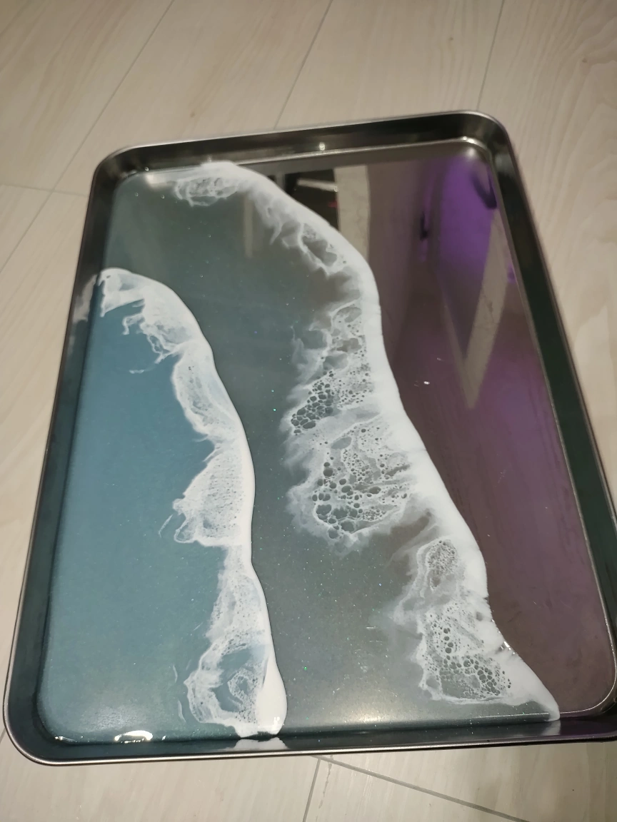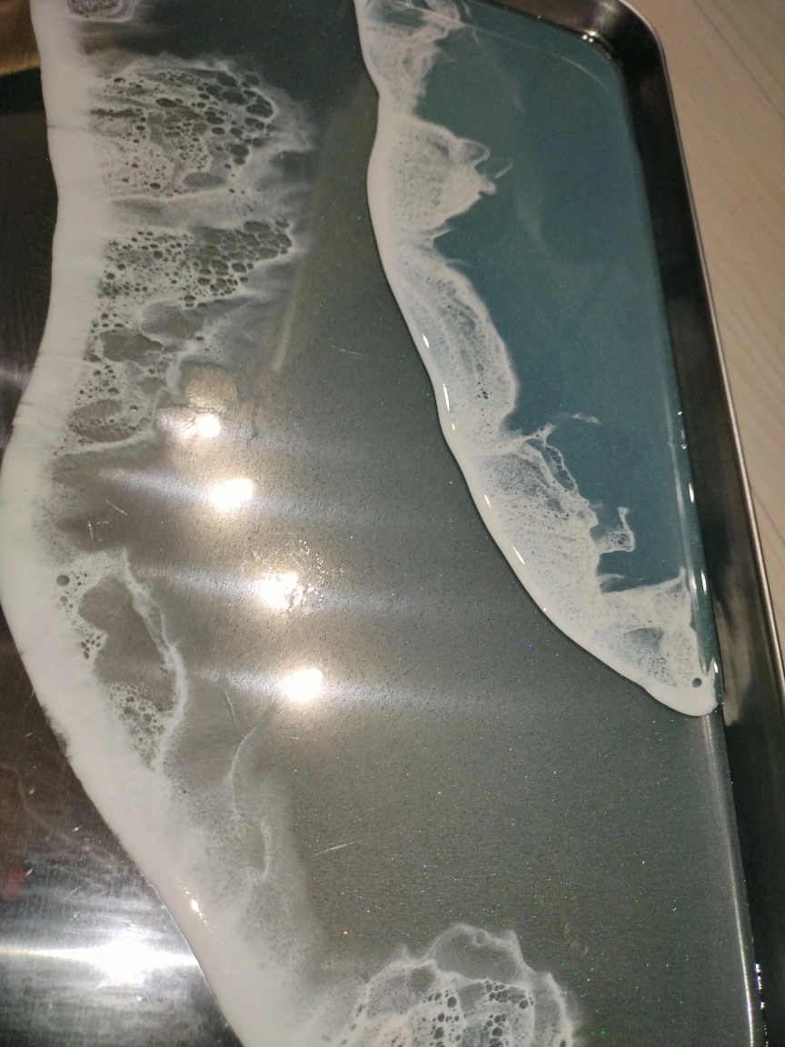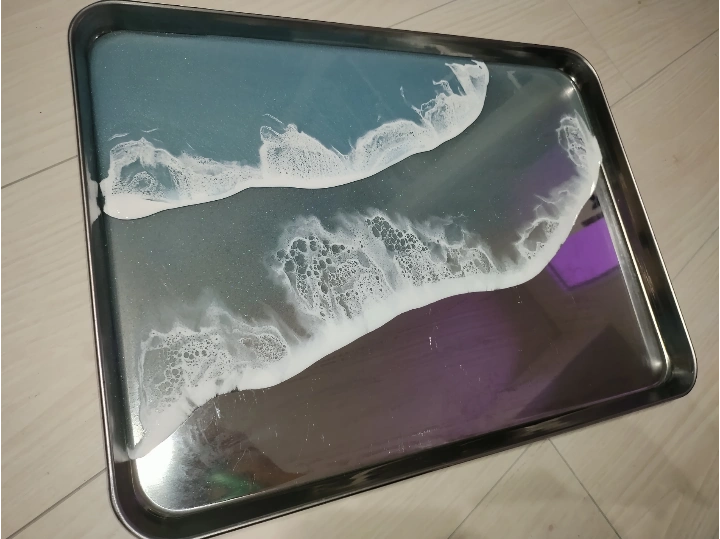 30✕41cm 銀のトレ ー ハンドメイド作品です。 大小ラメが大量に入っており、キラキラ輝いてとても綺麗です。 淡めのブルーの波です。 気になる箇所があれば、アップで撮影しますのでリクエストお願い致します。 ※銀のトレイがまるで鏡面のようにしっかり反射するので、撮影者(私)が写らないように角度を気をつけて撮影しています。 自宅で通常使用していた銀のトレイに、オーシャンレジンを流しました。 ※トレイ自体は普通に使用していたため、傷などございます(画像をご確認くださいませ) レジンを流してから以後は、未使用となります。 他にもコースター4枚セット等を出品しています。 お気に入りのカラー、お気に入りの波がきっと見つかりますように♪ スマホやモニターの種類により、実際の商品との色合いなど、見え方が若干異なる場合がございますのでご了承ください。 レジンの性質上、小さな埃や気泡が入ったり、凸凹やソリ、ヨレ等がある場合があります。 ハンドメイド作品であり、また安価にて出品致しておりますので、ご理解頂きご購入いただきますようお願いいたします。 波 海模様 青 水色 ブルーグラデーション エメラルドグリーン ティファニーブルー ターコイズブルー ウルトラマリン