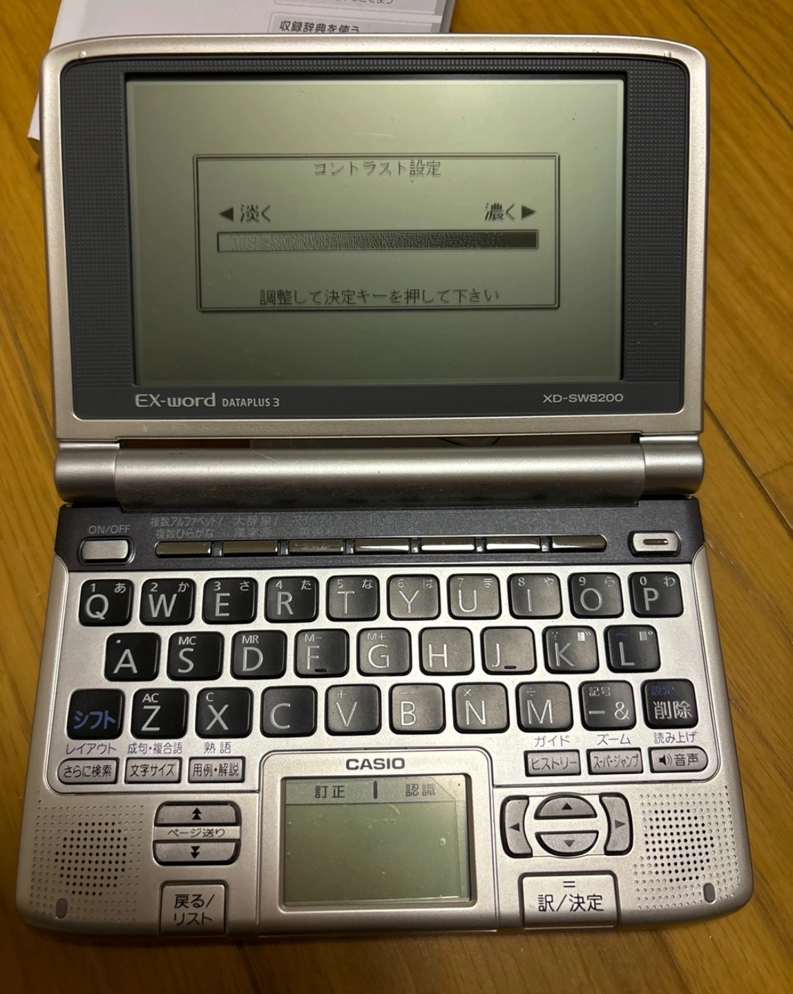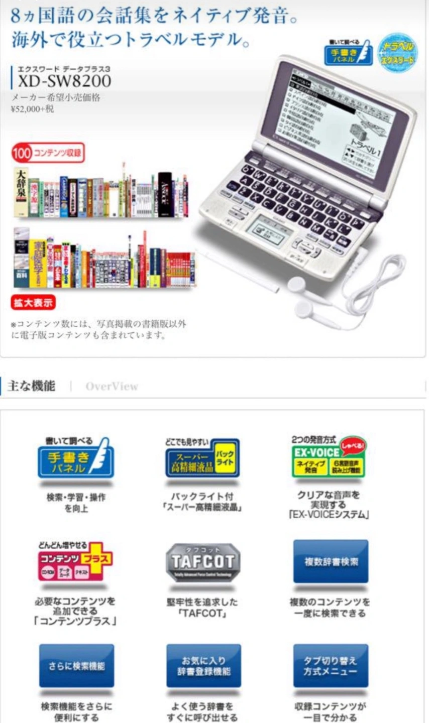 画像の物が全てです 作動確認済み タッチペン 取扱説明書 電池はつきませんのでご用意ください 【商品概要】 ○主な辞書コンテンツ:デジタル大辞泉/漢字源/ジーニアス英和辞典/小学館-ケンブリッジ英英和辞典/プログレッシブ和英中辞典。 ○「8カ国の会話集をネイティブ発音。海外で役立つトラベルモデル。英語/ドイツ語/フランス語/スペイン語/イタリア語/韓国語/中国語/タイ語の「ひとり歩きの会話集」が音声付き。英日とそれぞれの言語の対訳小辞典あり。 ○ ビジネス向け、生活・実用向けコンテンツなど100コンテンツ。 ○画面サイズ:5型 ○バックライト:対応 ○内蔵メモリ容量:50MB ○電源:単4乾電池×2