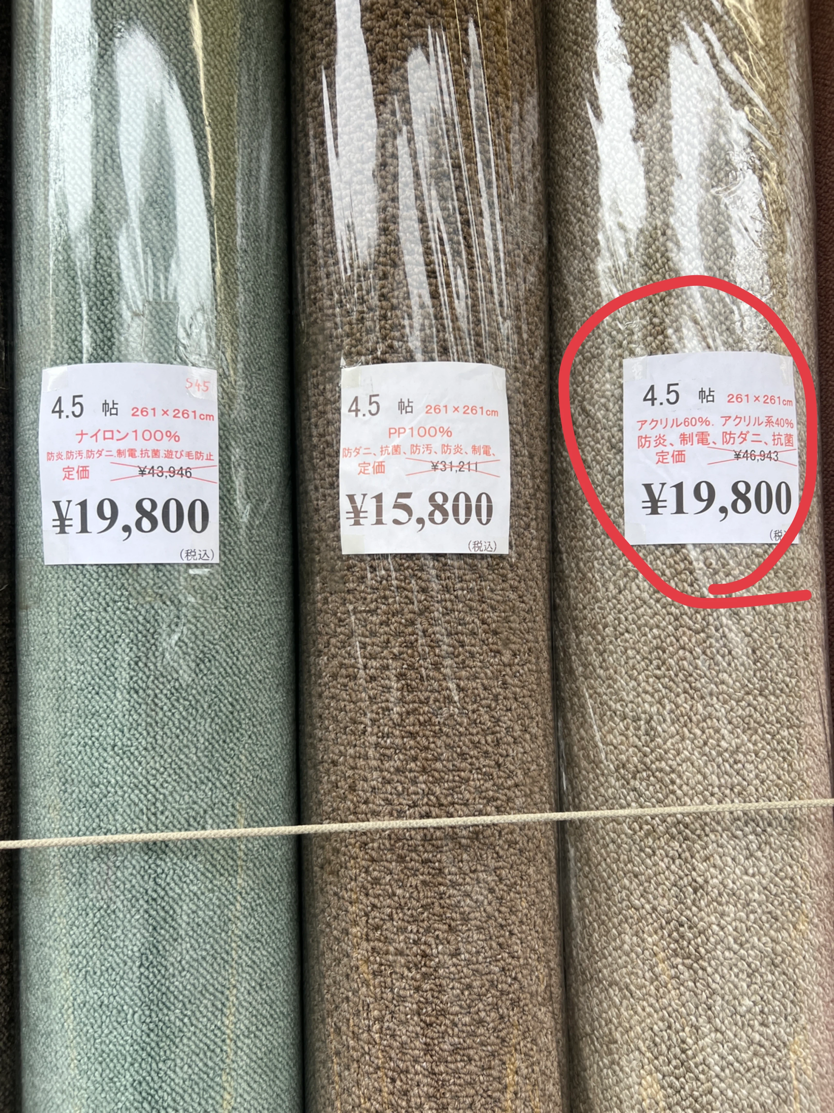 カーペットです ・サイズ:4.5帖(261×261cm) ・素材:アクリル60%、アクリル系40% ・色:ベージュ系 ・防ダニ、抗菌、防炎加工 ・定価は46,943円でした ・全体的には綺麗ですが、小さなシミあり