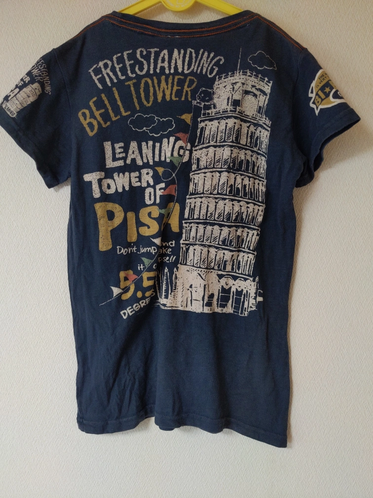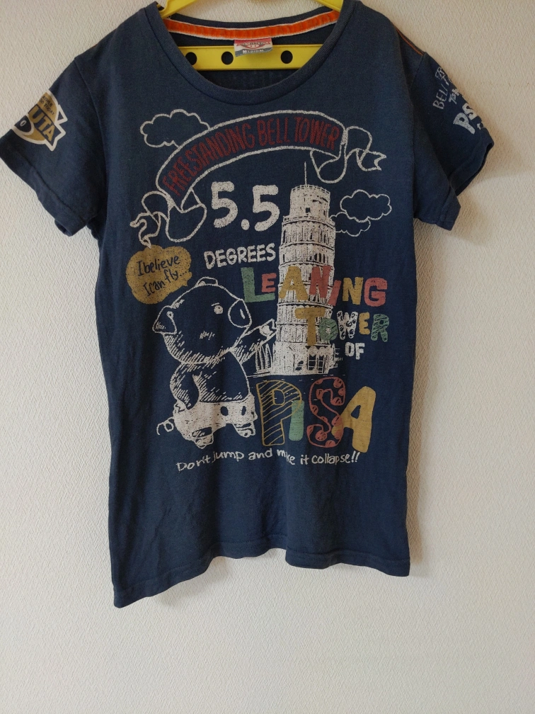婦人Mサイズなので購入しましたが、袖周り少しキツく感じたので出品します。タグによるとバスト79~87身長154~162なので高学年の子なら着れると思います。素材は綿100%です。洗濯後タンスに保管していました。洗濯によるシワが多少あります。洗濯したとはいえ着用後の中古品であることをご理解の上で購入をお願いします。動物好きの方にいかがでしょうか? ・カラー:紺色 ・ピサの斜塔のプリント ・使用感あり 自転車使用につきお取引場所は小田急沿線の他に世田谷線各駅、田園都市線桜新町駅も可能です。