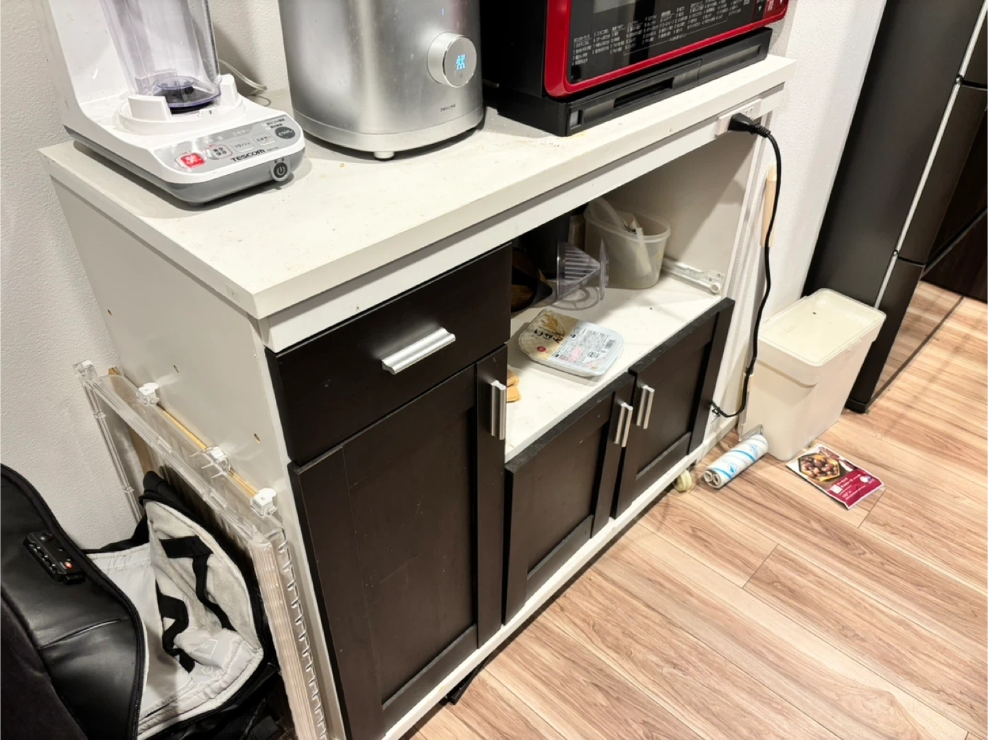 キッチンカウンターです ・カラー:ホワイト、ブラウン ・収納スペースあり スライダーが邪魔なので取り外して ついていません。 分解できる方に来ていただきたいです。 自分で組み立てたのでぐらついてますが、 しっかりと組み立てできる方にお譲りしたいです 中古品であることご了承ください