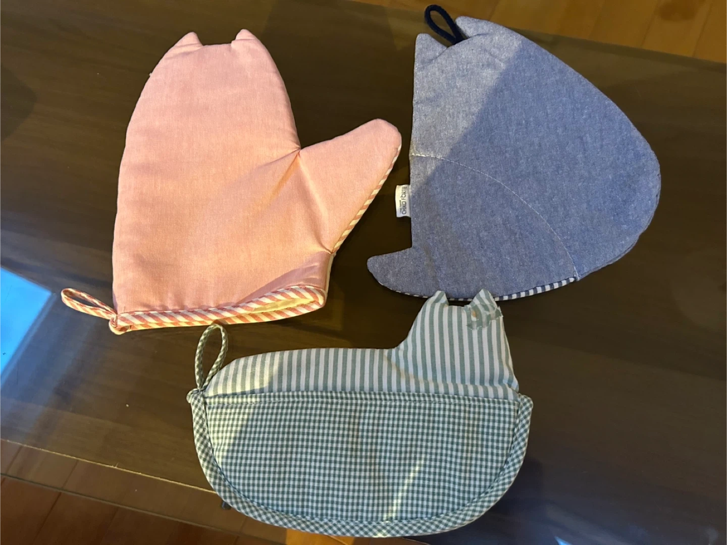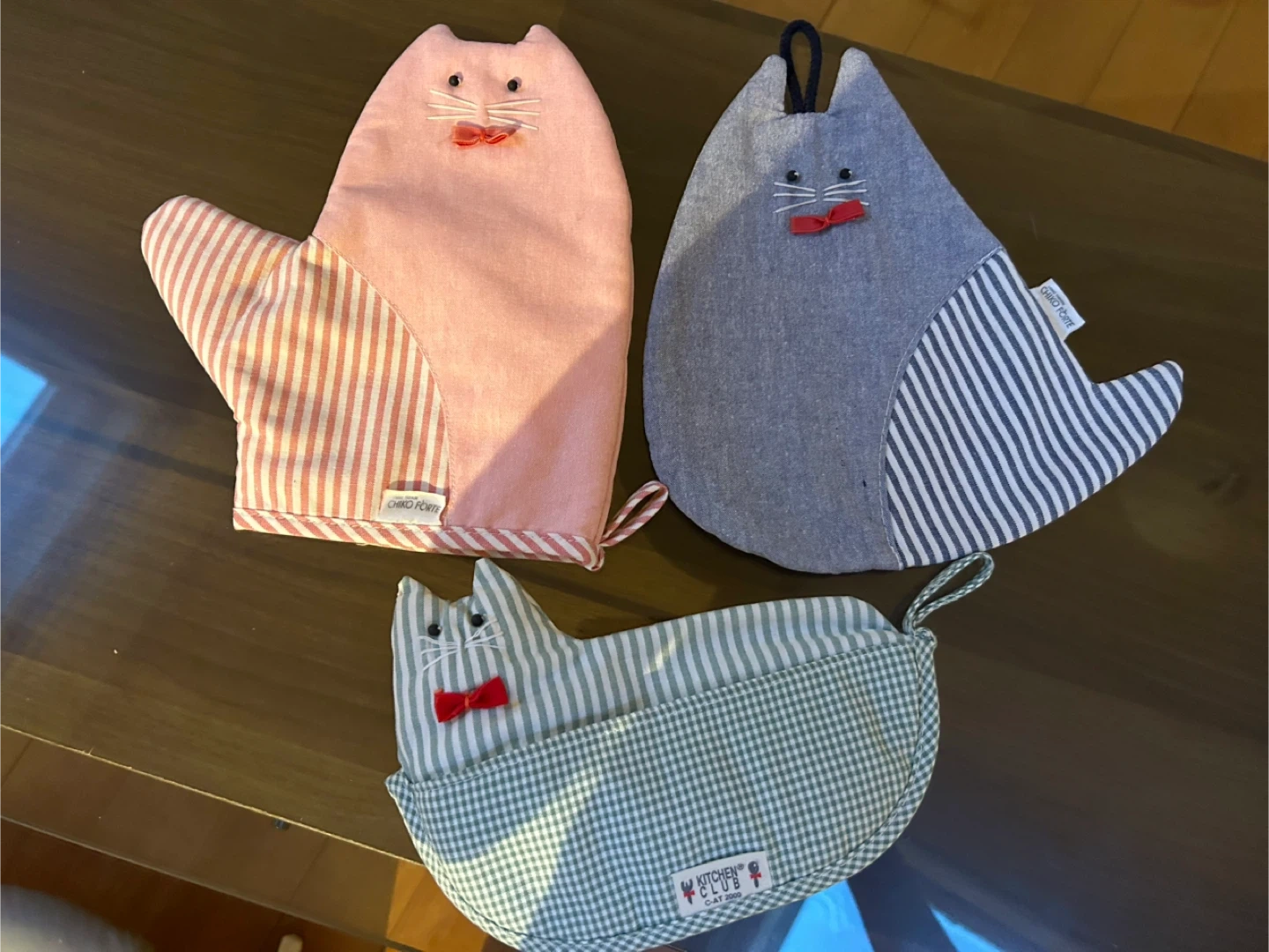 猫型鍋つかみ3点セットです ・色:ピンク、グレー、グリーン ・デザイン:猫型 ・状態:使用感少なめですが、写真3枚目のとおり緑色の鍋つかみの裏側に傷があります。 ご不明点があればお気軽にご連絡ください