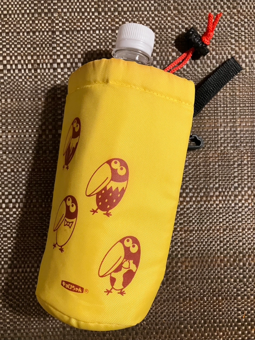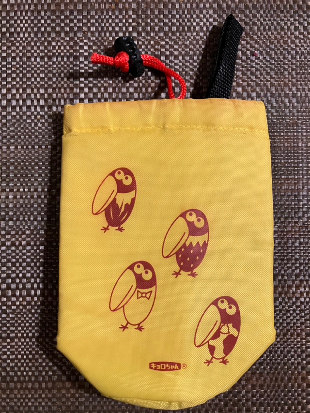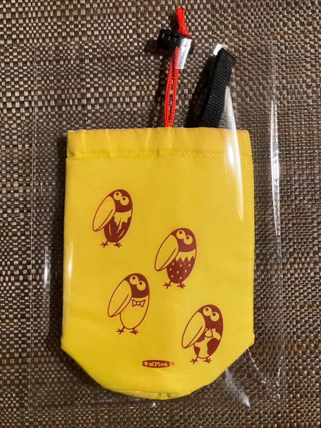 ・カラー:イエロー ・キョロちゃん柄 ・巾着タイプ ・内側はアルミ素材 非売品のレアなキョロちゃんグッズ 撮影のため500mmのペットボトルを入れて見ましたが、かなりの余裕があり太いやつも全然入りそうです