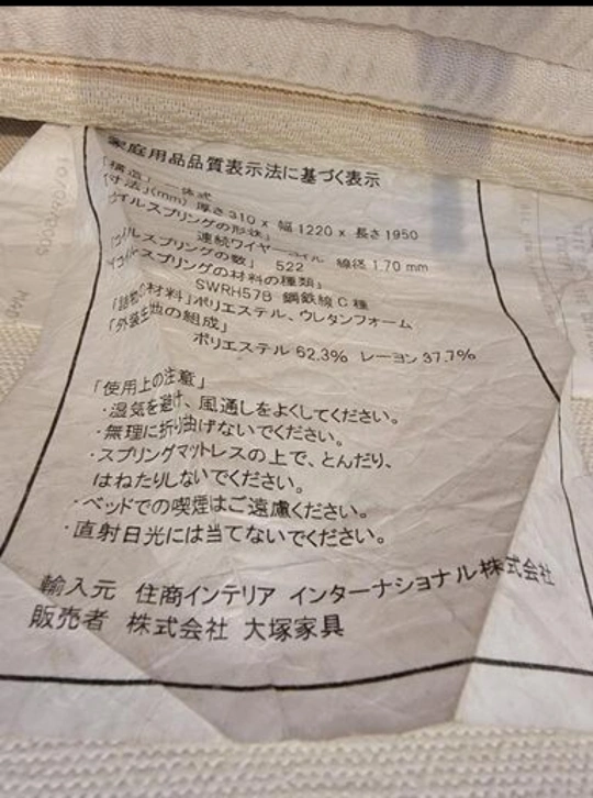 キングスダウンのマットレスです 【情報】 ブランド:キングスダウン サイズ:厚さ310mm x 幅1220mm x 長さ1950mm 【状態】 使用感あり 中古品であることご了承ください 20年以上前に20万程で購入したものです。 セミダブルです。 高級品なのでへたりはほぼありません マンション1階まで取りに来られる方。 袋がないのでシーツでくるんで台車に乗せて渡すので、シーツ付きです。(シーツは汚れます) 引っ越しするので、10月上旬までに来られる方。