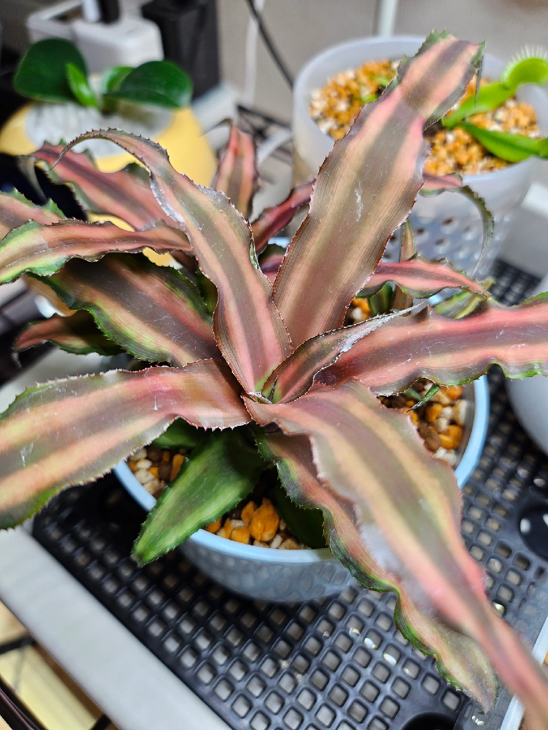 観葉植物のクリップタンサスです。 カーテン越しの窓際で育てられる植物です。 表土が乾いて1日〜2日後に水をたっぷりあげます。 株が3つ群生しています。 光の強さによって葉の色が緑と赤へ変化します。 興味ある方々は気軽にお声がけください。