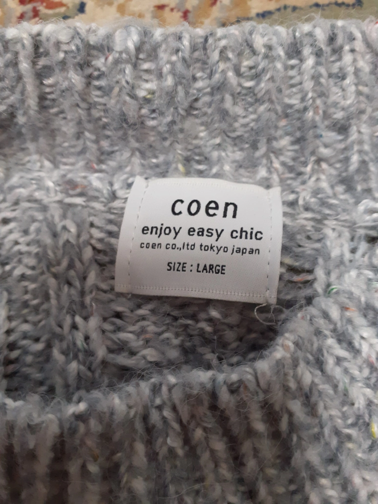コーエンのニットセーターです ・カラー:グレー ・サイズ:メンズL ・購入したものの、一度もきずにしまってました。 ・全体的にきれい 身幅約60センチ 後ろに縄編みが縦に一本はいり、お洒落です。 ご不明点があればお気軽にご連絡ください