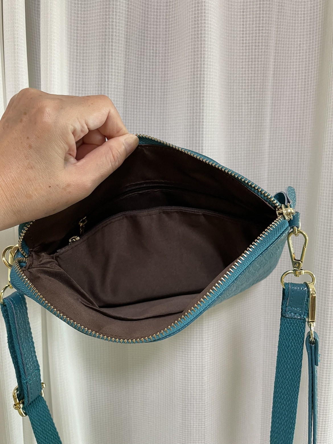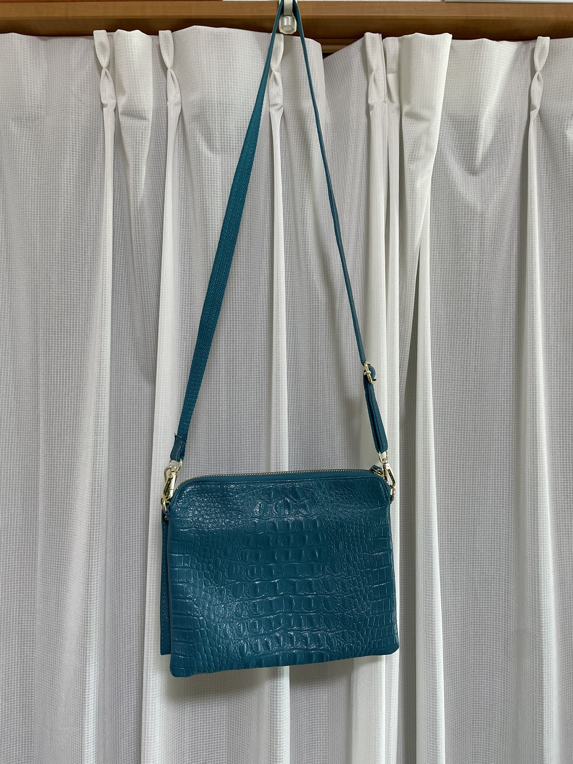 マチのないショルダーバッグです。 色は少しくすみのあるターコイズブルーです。 紐の長さは調節できます。取り外しも可能です。 内側にファスナー付きポケットと、仕切りになるファスナーポケットがついています。 サイズ たて:19.5cm よこ:24.5cm ショルダー紐の長さ:約110cm できるだけお近くまでお持ちします。 ご相談ください。