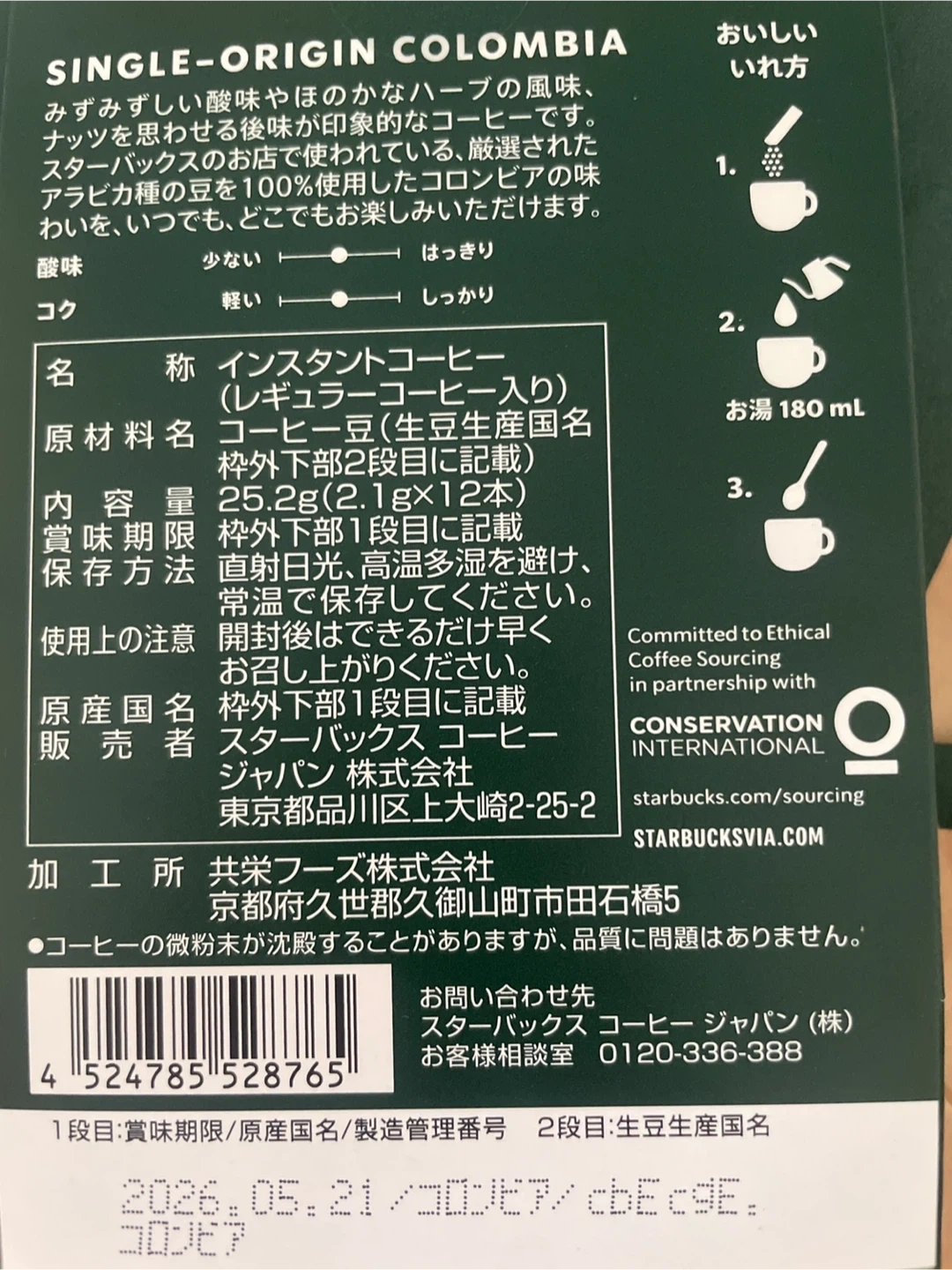 スターバックス VIA コーヒーエッセンス コロンビアです 【情報】 ブランド:スターバックス 商品名:VIA コーヒーエッセンス 種類:インスタントコーヒー 原産国:コロンビア 内容量:25.2g(2.1g×12本) 【状態】 新品未開封 自宅保管です。 お渡しは土日祝日の限られた時間になります。 ご了承ください。