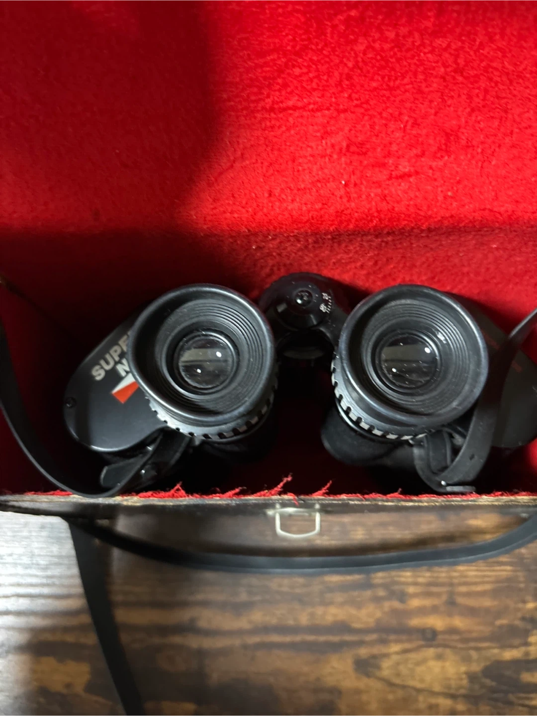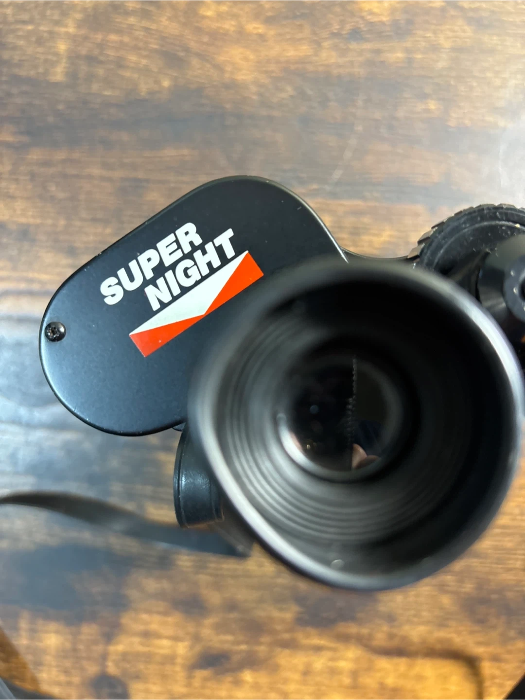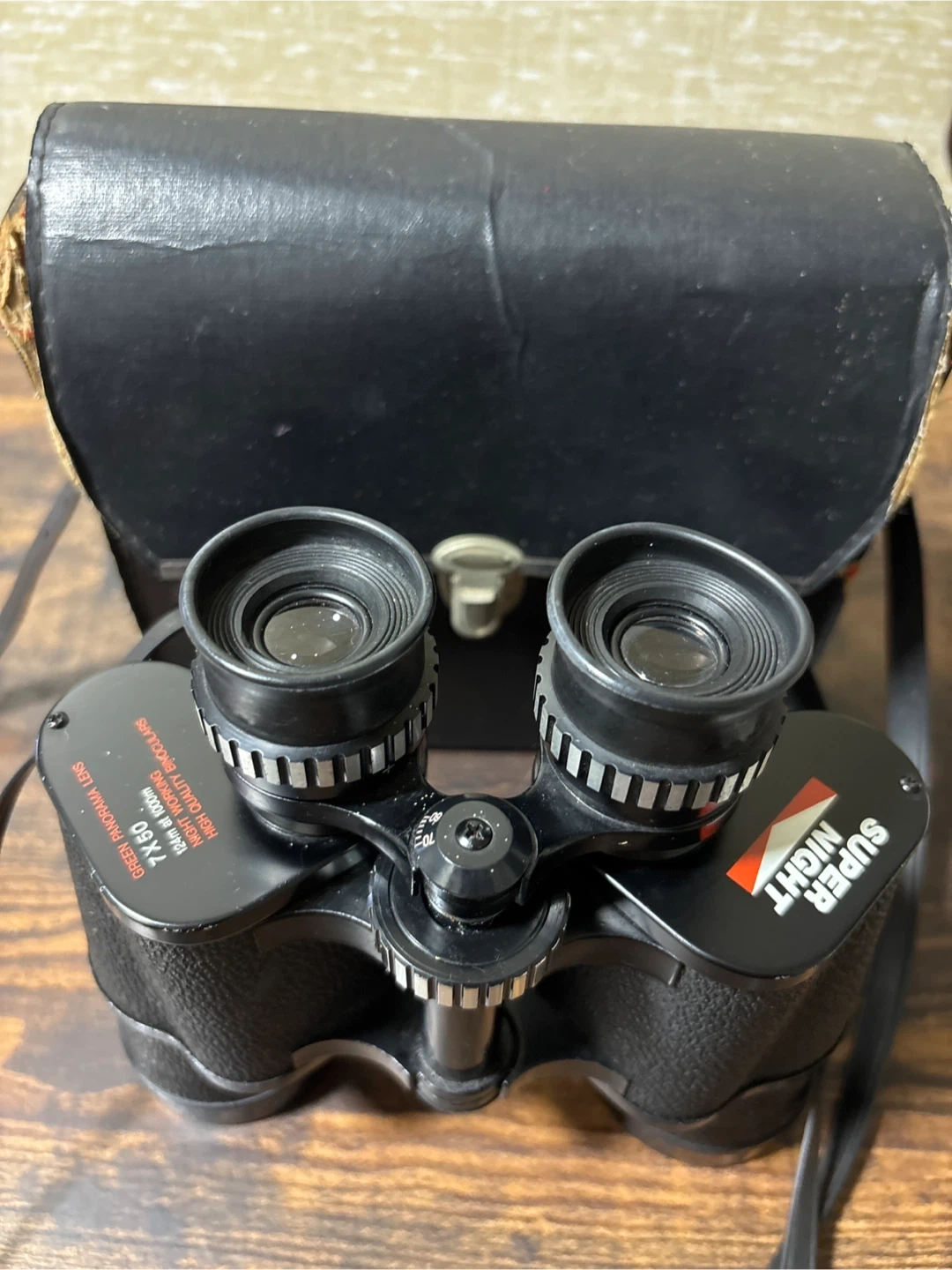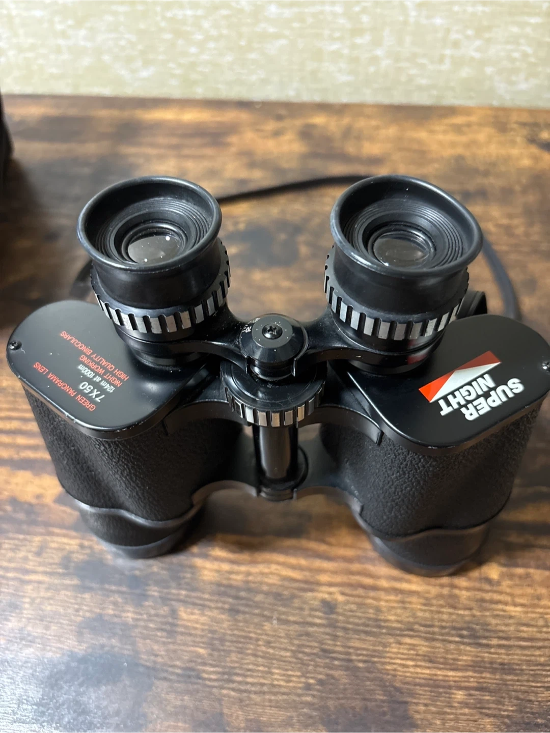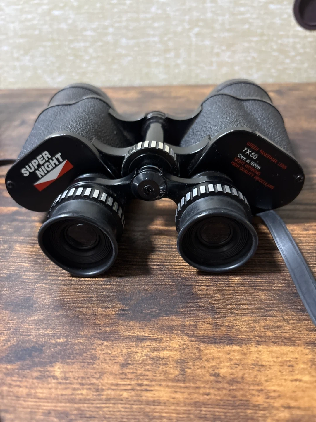 スーパーナイトの双眼鏡です 【情報】 ブランド:スーパーナイト 倍率:7x50 【状態】 使用感少なめ 【付属品】 ケ-ス SUPER NIGHTスーパーナイト 双眼鏡 7×50mm GREEN PANORAMA LENS 124m at 1000m ケース付き ビンテージ品です。 保管状態が良く、レンズには、くもりや、カビもなく 見え具合は、非常に良好です 7×50 high quality night working ケース以外の付属品はありません ケ-スは、経年劣化が見受けられます レトロ品です 非常にレアな逸品です