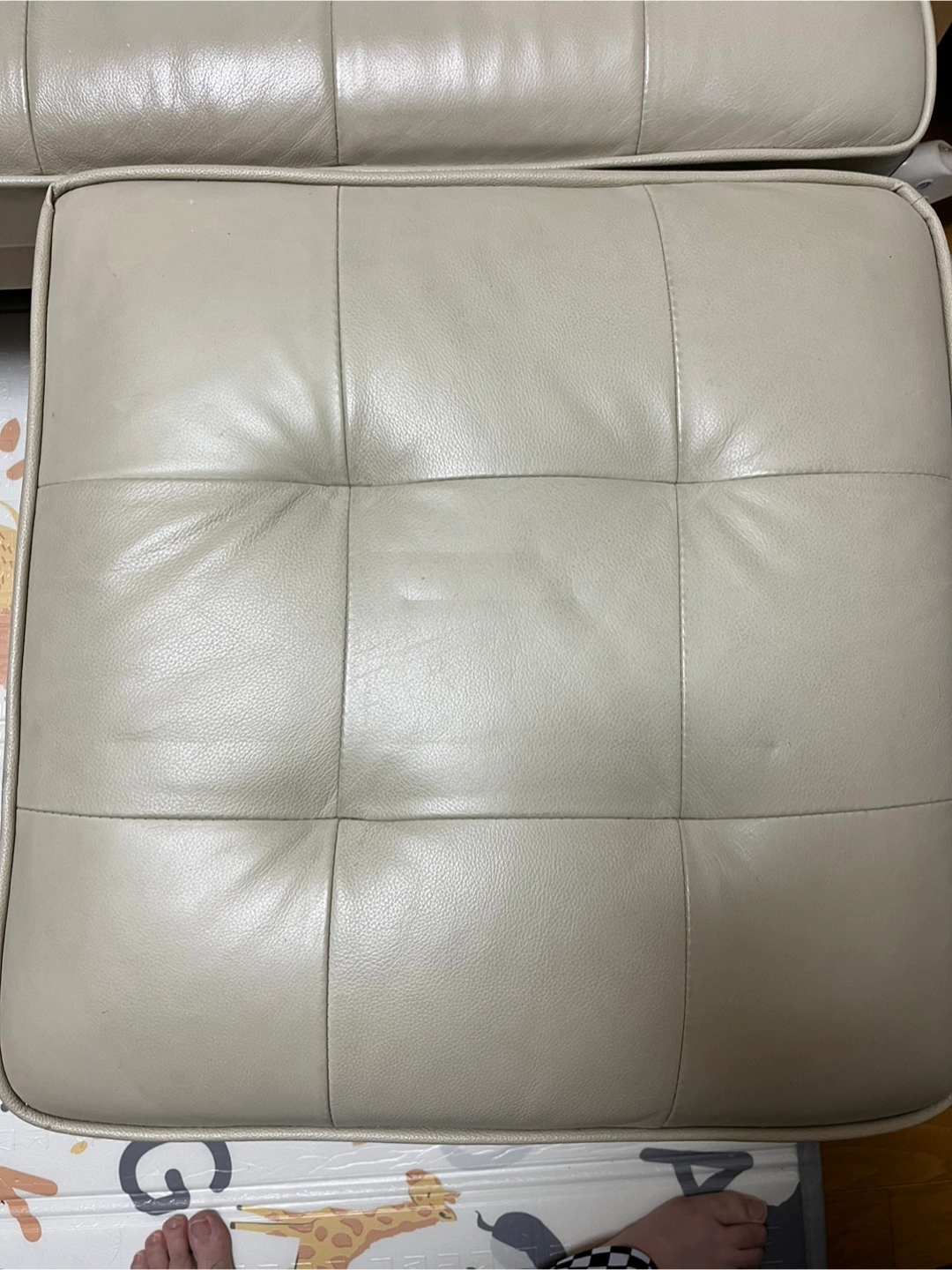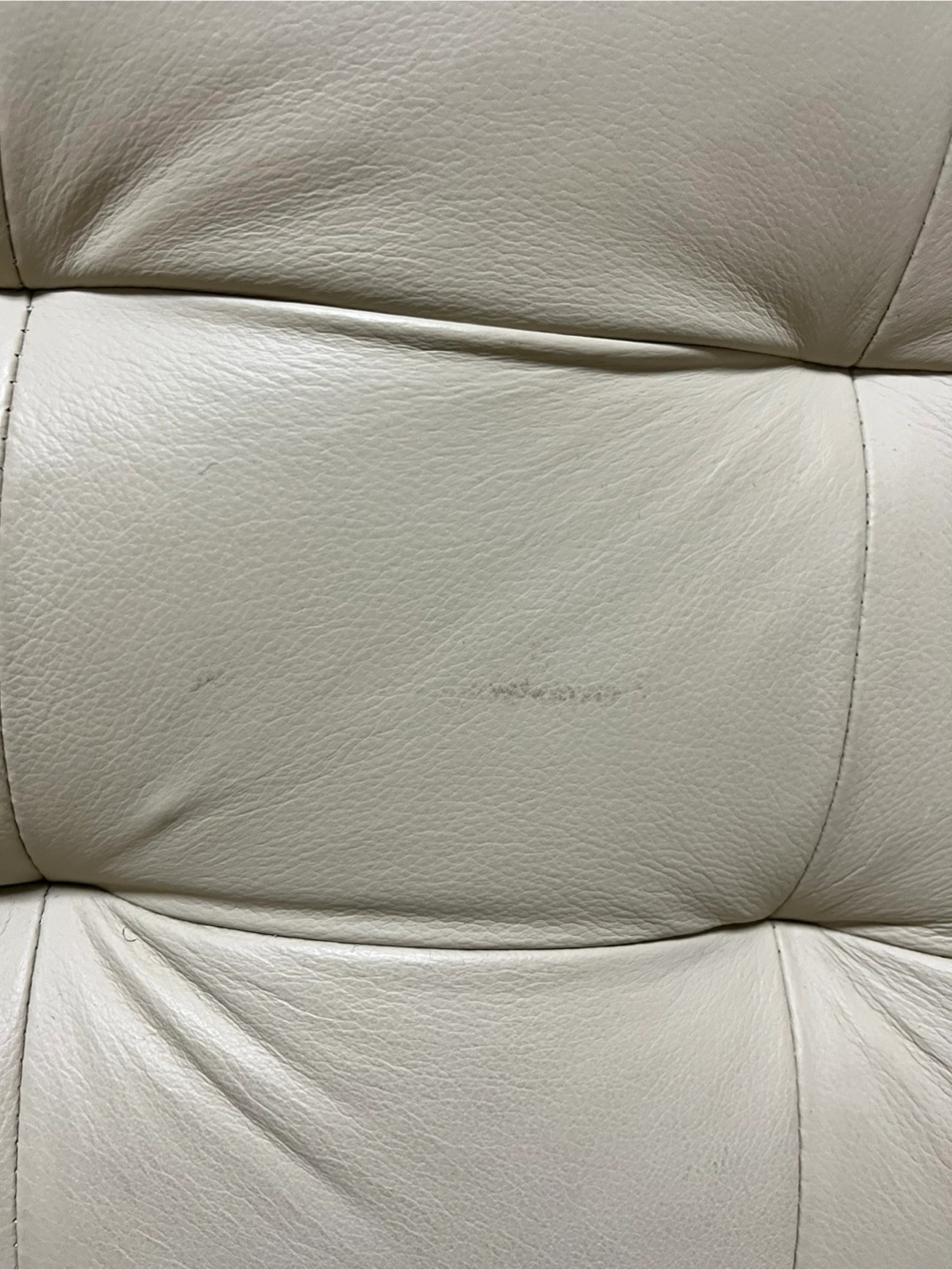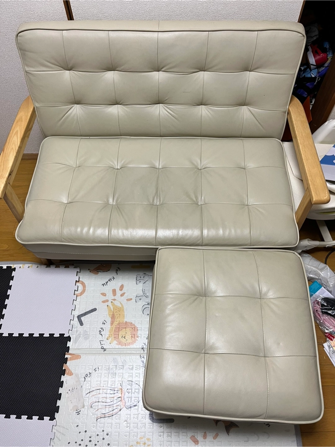 ベージュ色のソファとオットマンのセットです。 約10年前にニトリで購入 ほぼ洋服を投げておく場として使用していたのでそこまでへたっている感じはありません。 ・カラー:ベージュ ・素材:レザー(素材の詳細は不明) ・サイズ: - ソファ:幅 約113cm, 高さ 約76cm, 奥行き 約70 - オットマン:約50cm x 50cm ・状態:小さな傷や汚れが数 カ所あります ・オットマンは独立して使えます 中古品であることご了承ください