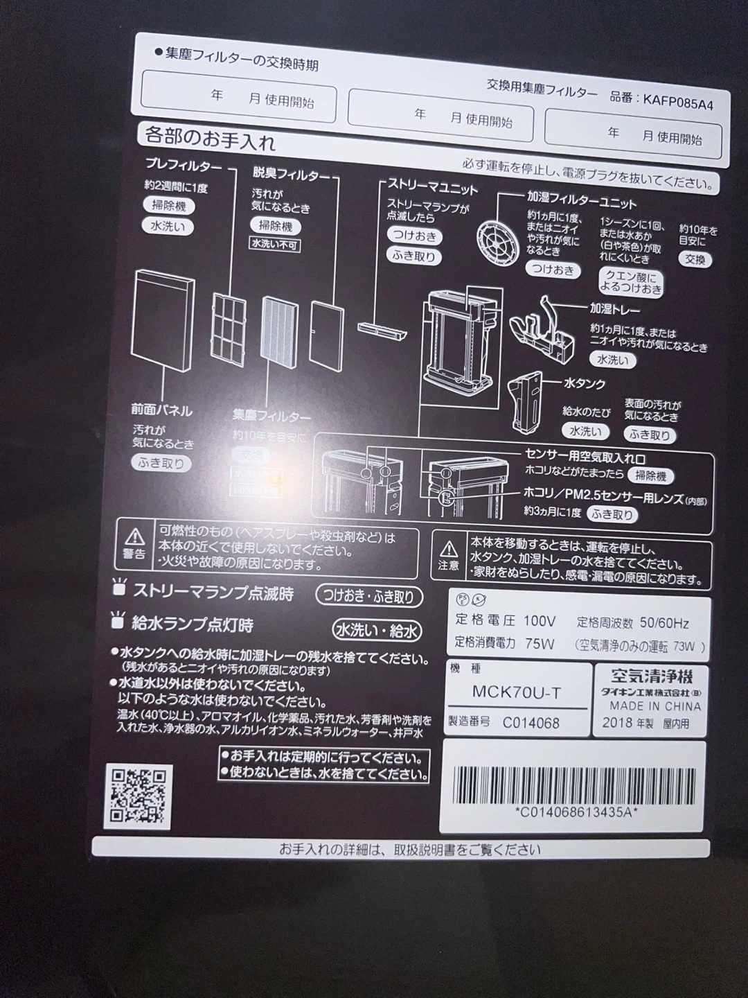 ダイキンの加湿空気清浄機です 前面パネル左側下部の爪が1箇所折れています。 片側は付いてるので外れることはありませんがご了承ください。写真をご確認ください。 タンク内は綺麗です。 フィルター類は使用に伴う多少の汚れはあるもののまだまだ使えるかと思いますm(_ _)m 【情報】 ブランド:ダイキン 型番:MCK70U-T 色:ブラウン系 【状態】 使用感はありますが、全体的にきれいです 【付属品】 フィルター類 中古品であることご了承ください