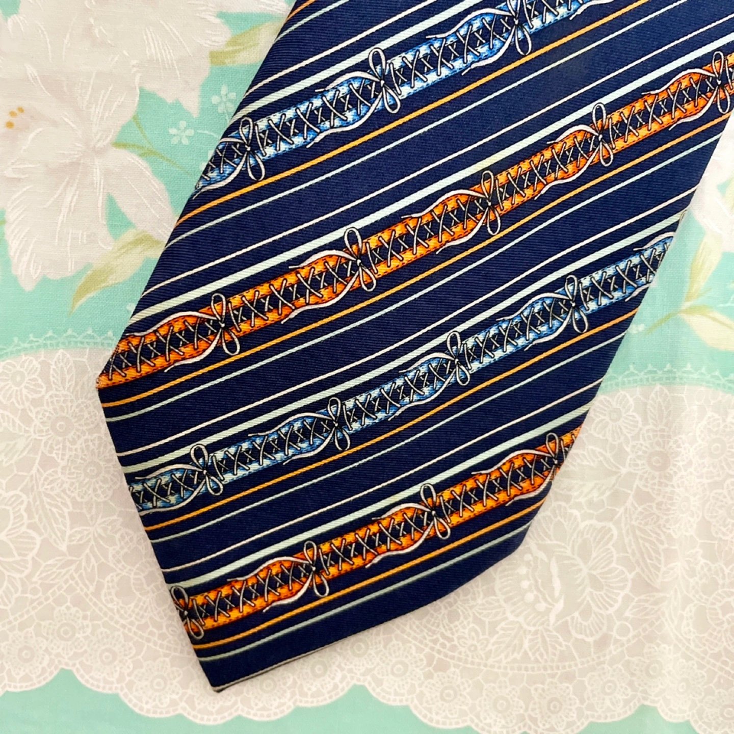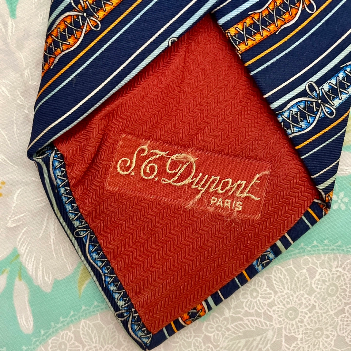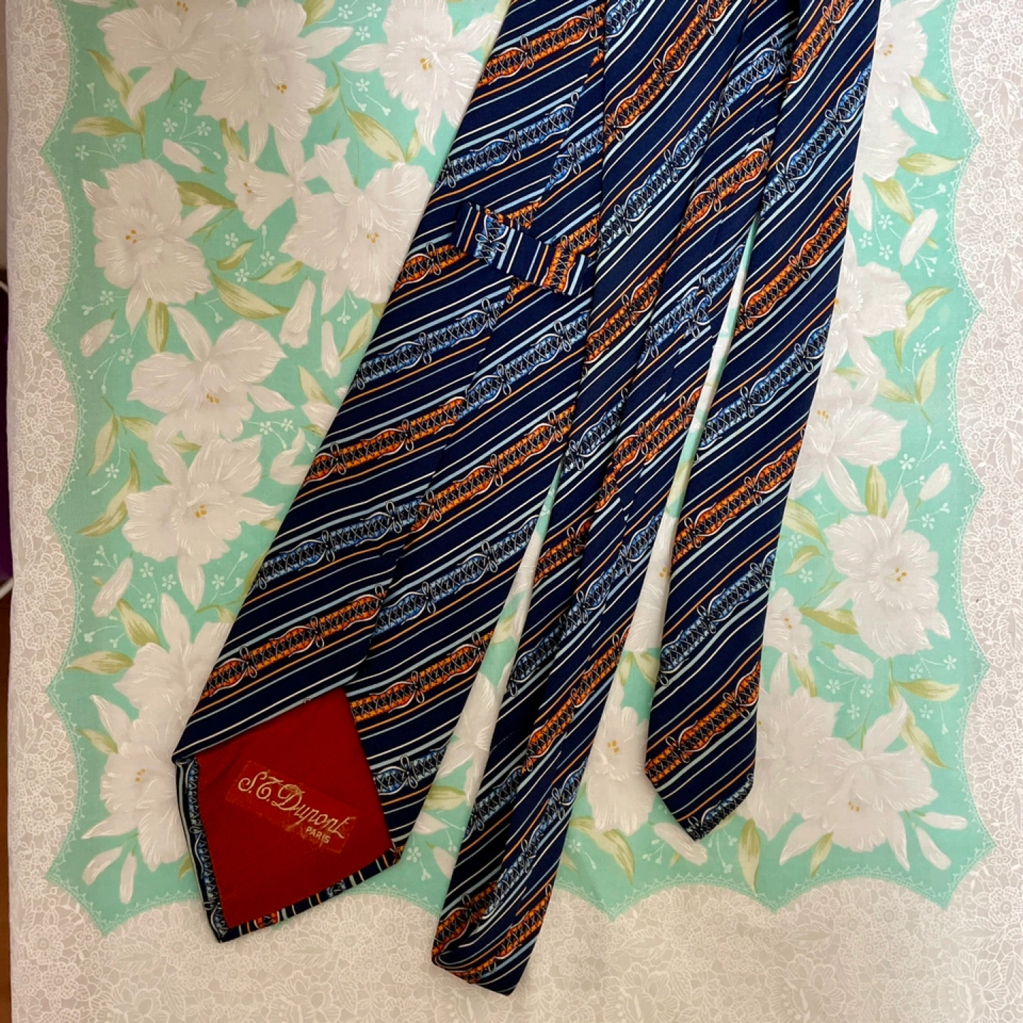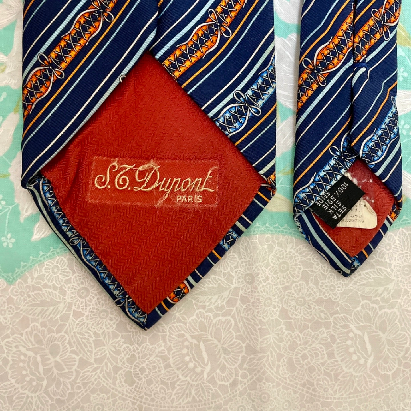 【高級感】 S.T. Dupontのネクタイは、エレガントなデザインと高品質な素材で知られています。シルク製で、肌触りが良く、フォーマルな場面に最適です。 【デザイン】 ネイビーを基調にしたストライプ柄は、ビジネスシーンでもカジュアルな場面でも活躍します。オレンジとホワイトのストライプがアクセントとなり、洗練された印象を与えます。 【ブランドの信頼性】 S.T. Dupontは、長い歴史を持つフランスのブランドで、品質とデザインにおいて高い評価を受けています。 ◆size 全長:約157.5cm 大剣幅:9.0cm 素人採寸です誤差はご容赦下さい。 - ブランド: S.T. Dupont - 色: ネイビー、オレンジ、ホワイト のストライプ - 素材: シルク - 製造国: フランス -写真の如く裏地の記載貼り付け文があせてます。新品で購入し、着用していました。 受け渡し場所 東中野駅または落合駅周辺 ご覧いただきありがとうございます。