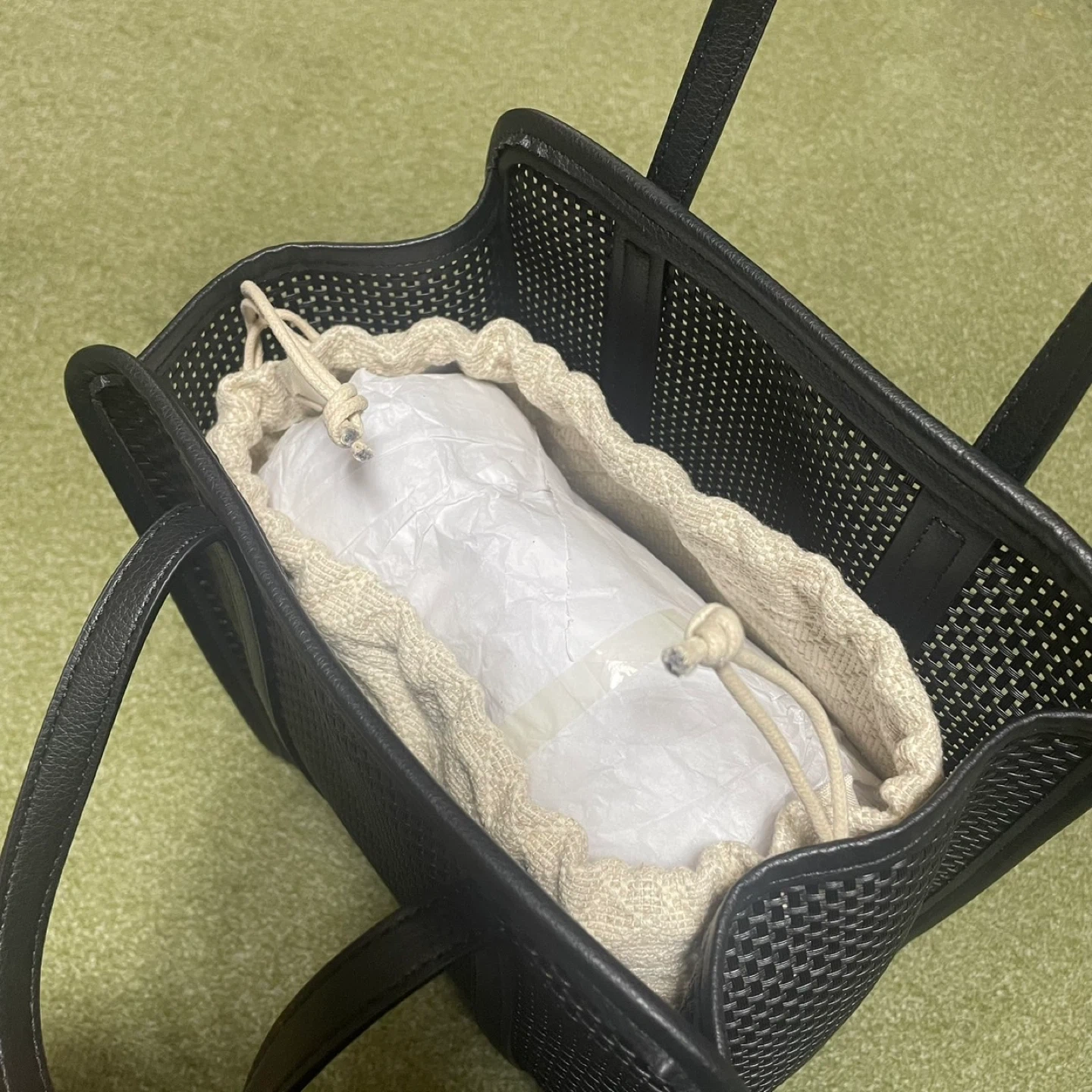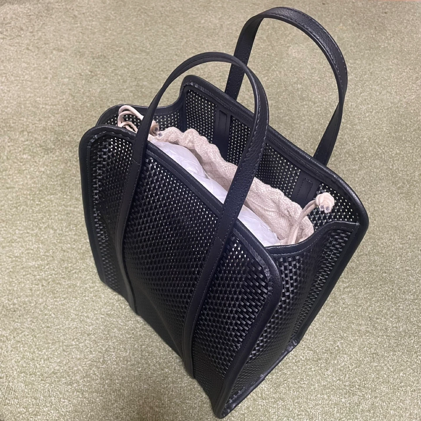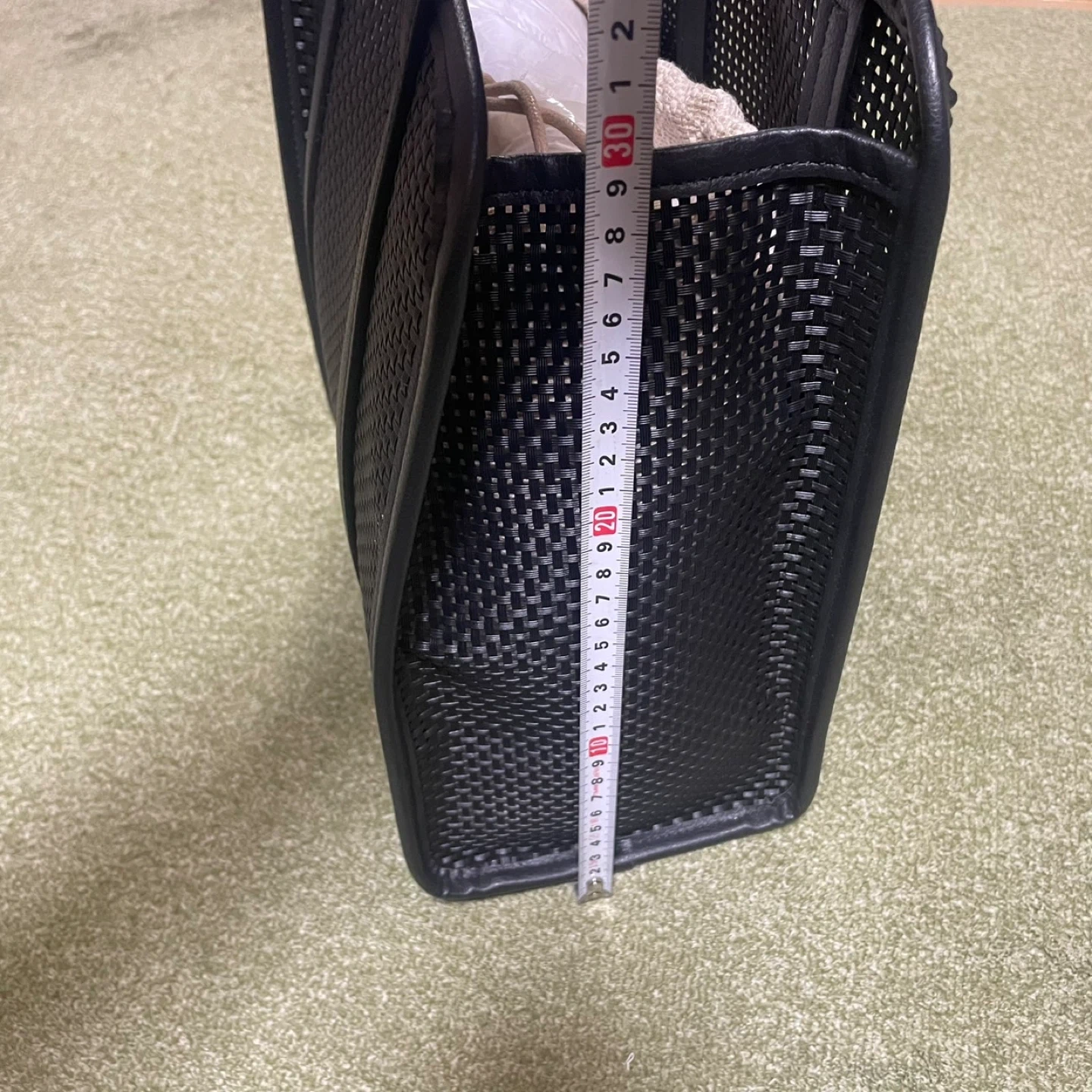 黒色のトートバッグです ・色:黒 ・サイズ:約23cm x 14.5cm x 30cm (写真6.7.8枚目参照) ・付属品:鞄に付属の巾着 ・一度のみ使用しました。 中古品であることご了承ください。 また、自宅保管、素人検品にご理解下さい。