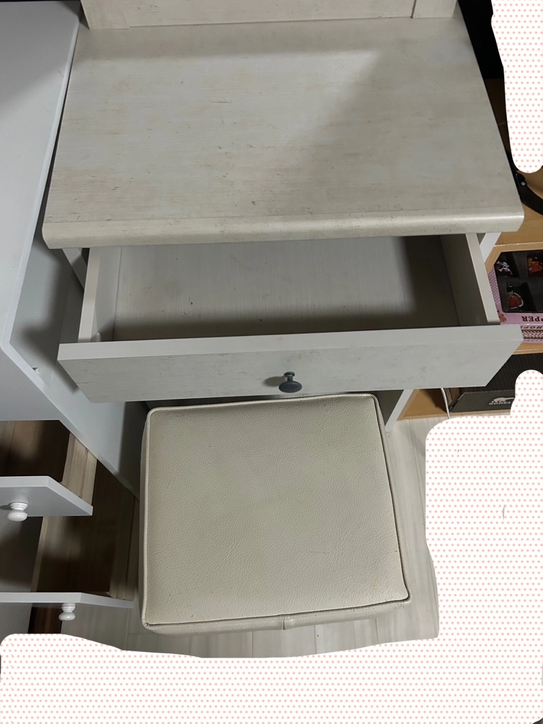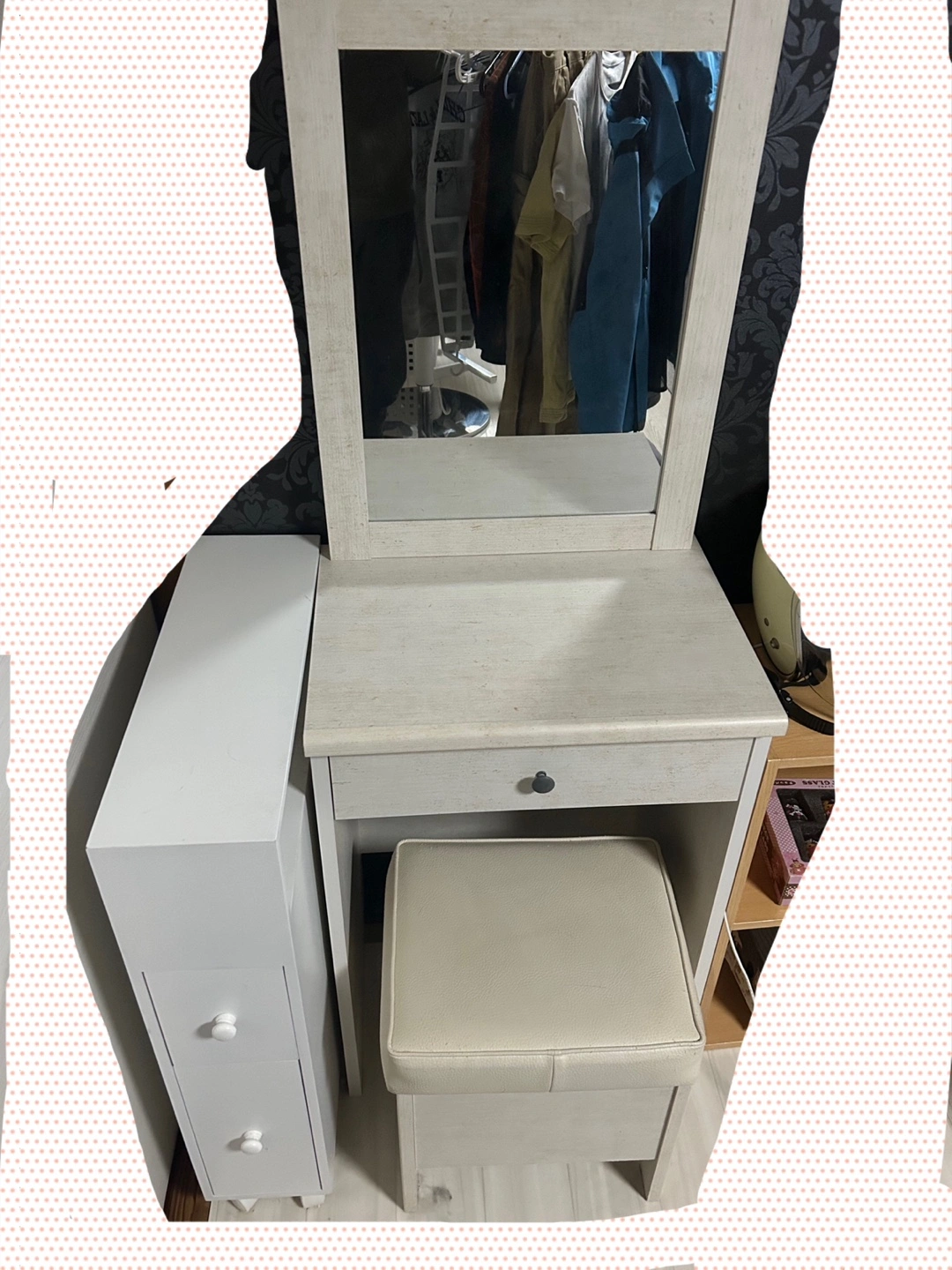 5年ほど前に購入しました化粧台3点セットになります。 化粧台のサイドの収納は元々セット品では無いです。 サイドの収納の寸法 H70センチD50センチW16センチ 化粧台の寸法 鏡含むH128センチ化粧台H70センチD36センチW48センチ 鏡は外しておきます。 受け渡し時間は20時以降になります。 日曜日はご相談下さい。 使用していたものになりますのでノークレーム、ノーリターンでお願いします。
