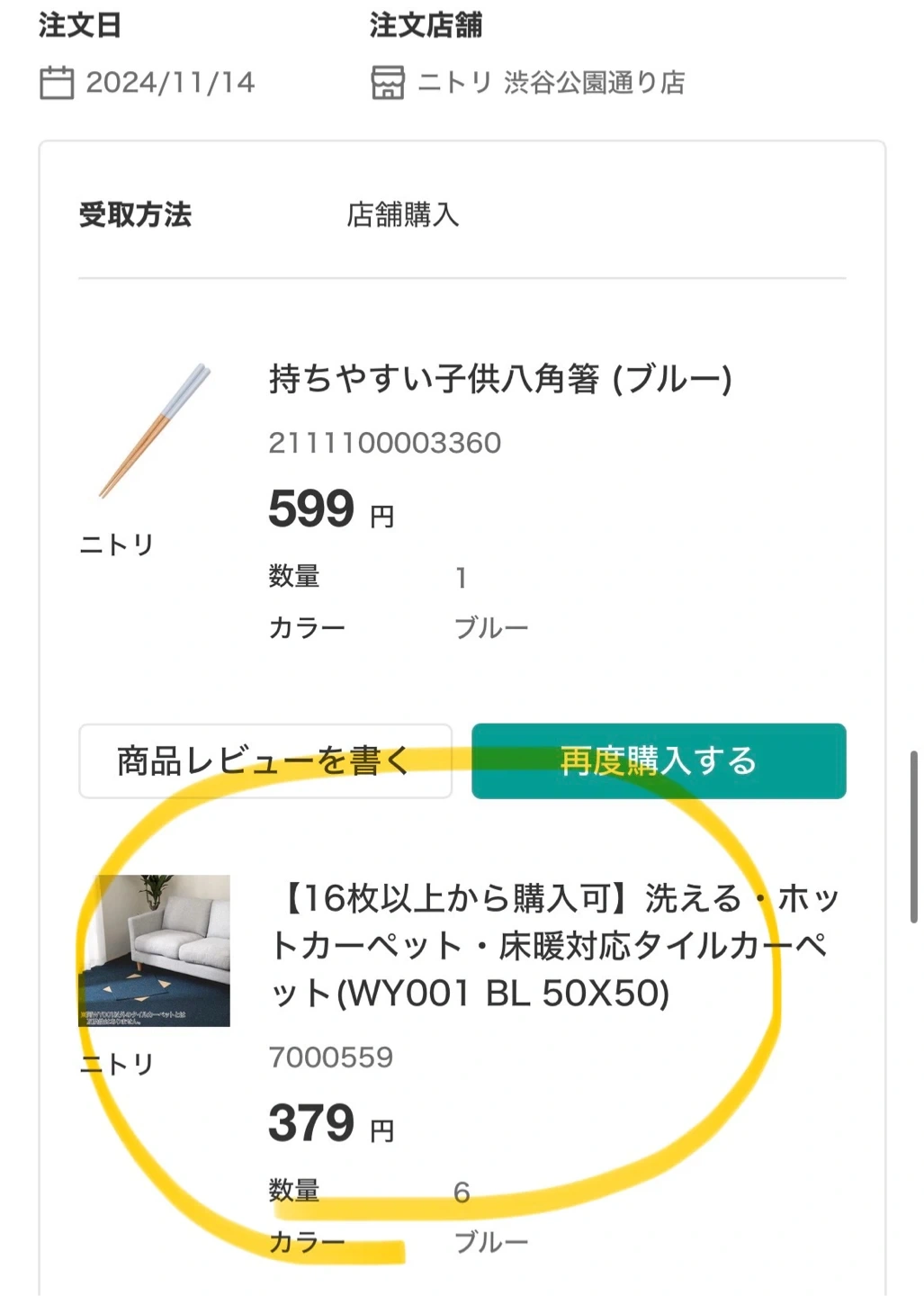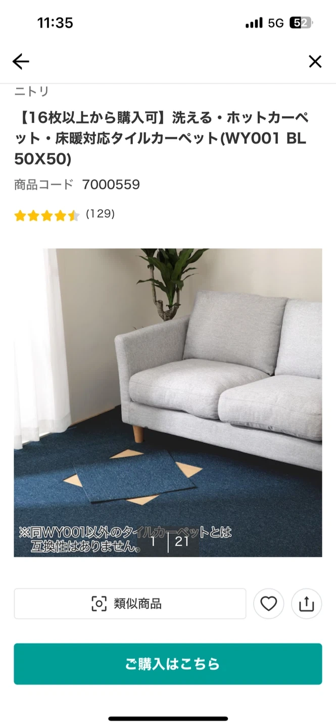 ニトリのタイルカーペットです。 【情報】 ブランド:ニトリ 商品:洗える・ホットカーペット・床暖房対応タイルカーペット 型番:WY001 BL 50X50 カラー:ブルー サイズ:50cm x 50cm ニトリで去年の11月に購入したタイルカーペット6枚セットです。半年ほど使用していたため新品とは異なります。 お安く出品いたしますのでご検討ください。 ⭐︎グレーも6枚ありますので、必要な方はおっしゃってください