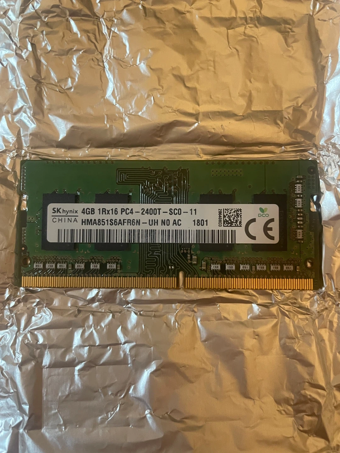ノートPC メモリddr4 pc4-19200 4gb(1枚) ⚠️詳しくないので説明を読んで下さい。 ⚠️傷はないですが中古なので ややありにしてます。 手持ちのノートPCのメモリ 12G(4G+8G )の4Gを抜いて、8Gを差し16Gにしたので、 ⭕️不要になった『4G』1枚を出品します。 規格は下です。 メモリ規格 DDR4-2400 PC4-19200 形状 SO-DIMM(260pin) 2018年2月7日 発売のマウスコンピュータのノートパソコンですが、当方は2人目の持ち主なので前者がどのくらい使ってるかわかりません。 当方が使い始めてから1年、頻度は週2回くらい。デジカメの写真動画の取り込みや保存くらい。 本日まで問題はまったくなかったです。 ノークレームノーリターンとは言いませんが、説明を承知の上でお取り引きをお願いいたします。 アルミホイルに包んで小さい箱にいれます。 中古品であることご了承ください