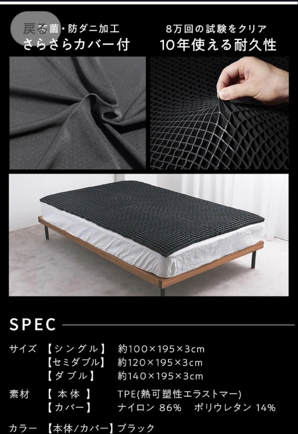 ご覧いただきありがとうございます。 3日ほど使用しました。 防水シーツを上からつけていました。 中古品であることをご了承のうえ、ご購入ください。 写真のダンボール、袋はつきません。 マットレスのみです。 けっこう重たいので、車で取りに来られる方にお譲りしたいと思います。 お近くで、持ってきてもらいたい、という方はご相談ください。 【サイズ】 シングル 【素材】 本体:TPE(熱可塑性エラストマー) カバー:ナイロン86%、ポリウレタン14% 【カラー】 本体/カバー:ブラック ・畳めるロールタイプ ・さらさらカバー付き