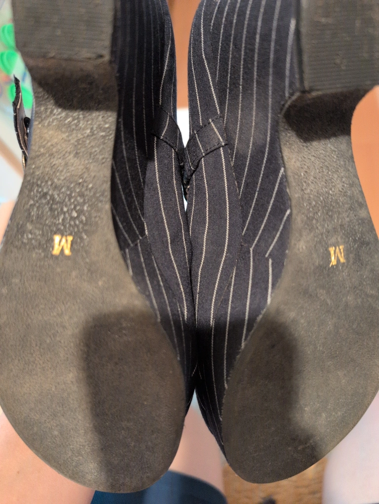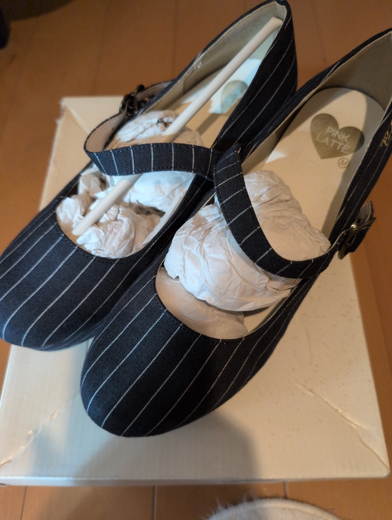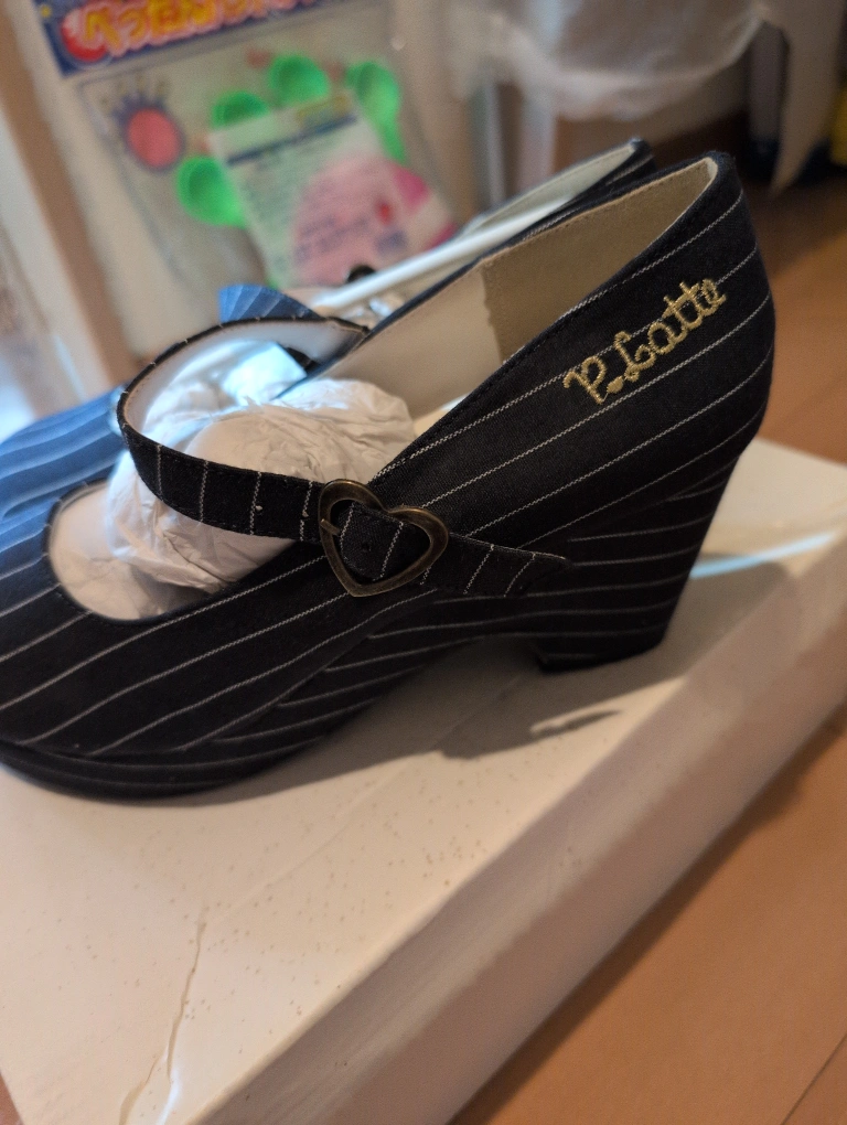 ピンクラテのパンプスです。 ・ブランド:ピンクラテ ・サイズ:M ・色:ネイビーに白のストライプ ・かかと部分に「P.latte」の刺繍あり ・ストラップの留め具はハート型 ・使用感あり 中古品であることご了承ください