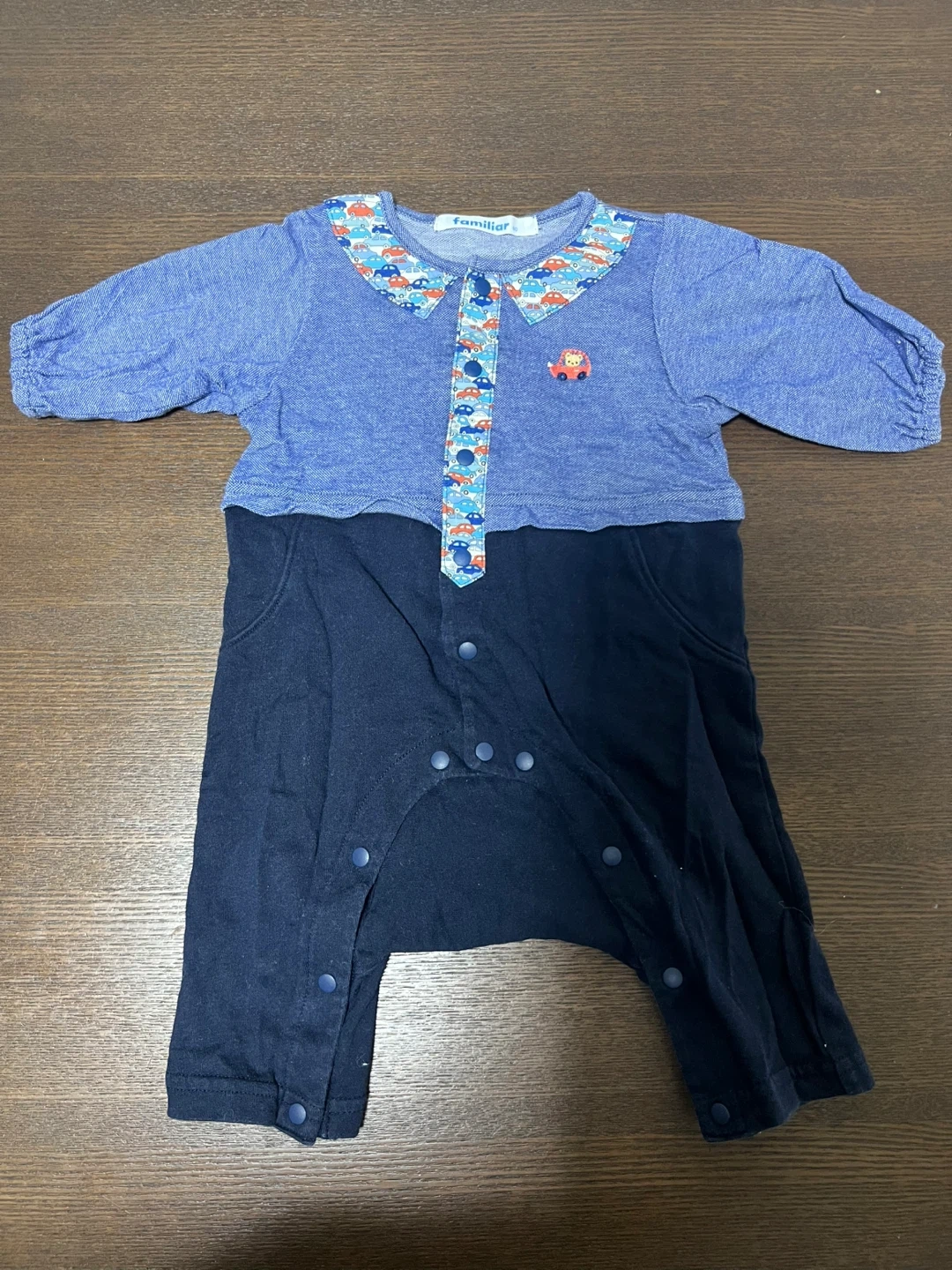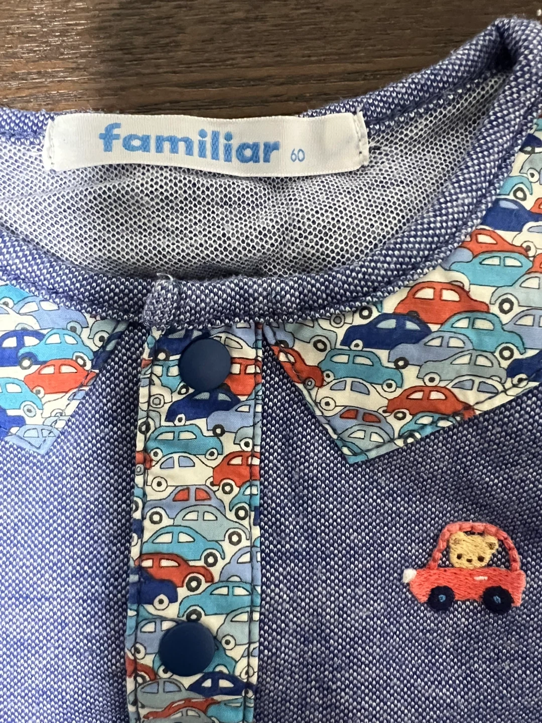 ファミリアのロンパースです ・ブランド:ファミリア ・サイズ:60 ・色: 上部分は青、下部分は紺色 ・車の柄 ・使用感は少なめです 中古品であることご了承ください