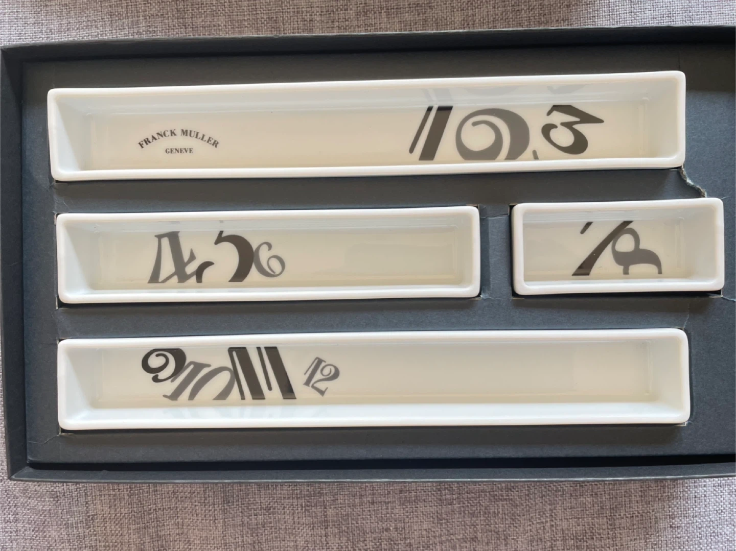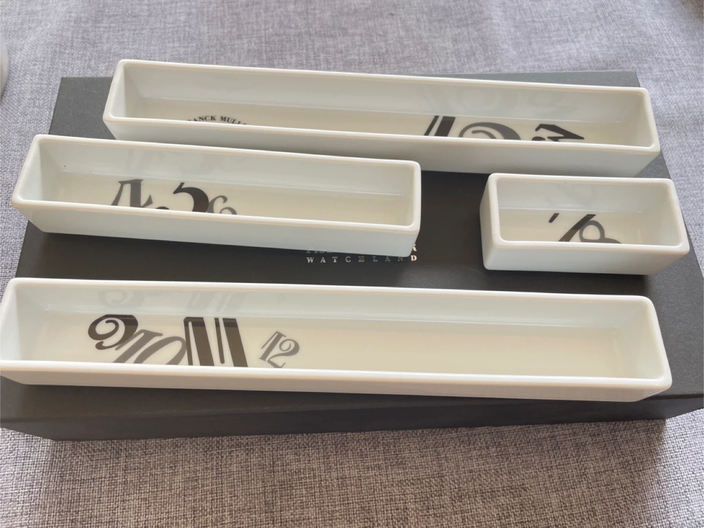フランクミュラーの小物入れ4点セットです。 【情報】 ブランド:フランクミュラー 種類:小物入れ 【状態】 未使用品 【付属品】 箱 フランクミュラーの陶器のセットです。 以前フランクミュラーの展示会にご招待頂いた際のプレゼントです。 中身を確認する為、箱は開封しましたが陶器は未使用のままなので出品致します。 陶器サイズ: 大×2 約25.3×3.5×高さ3㎝ 中×1 約17×3.5×高さ3㎝ 小×1 約8×3.5×高さ3㎝ 陶器は未使用ですが、器を取り出す際に中の仕切りが少し破れてしまいました。 それら含め自宅保管品につき完璧を求める方はご購入をお控えください。