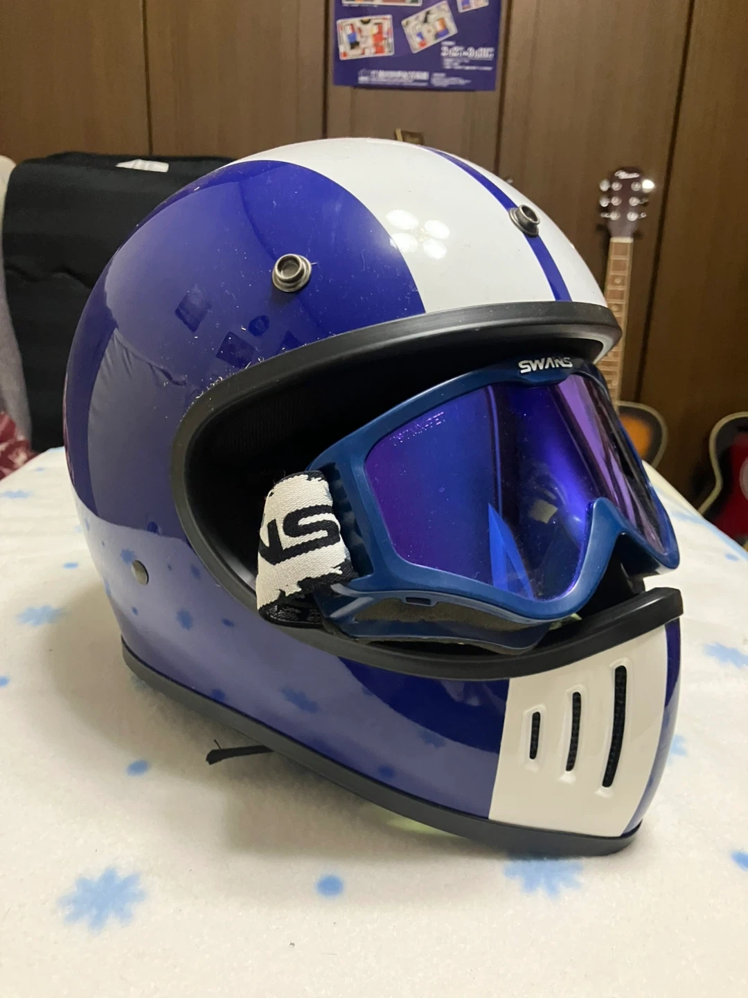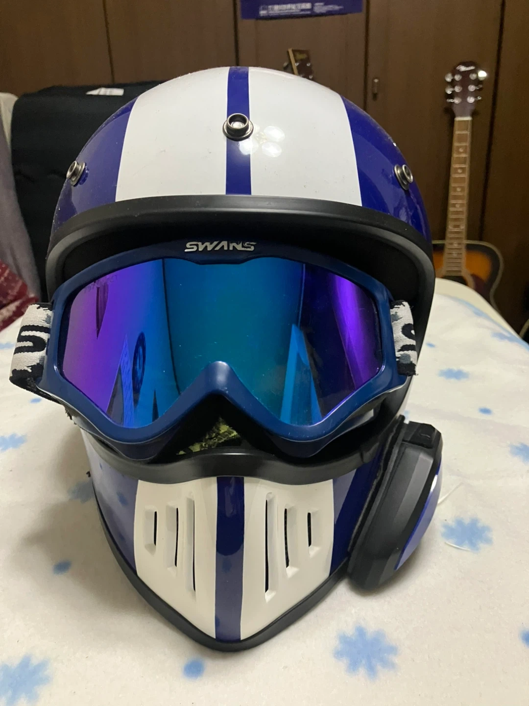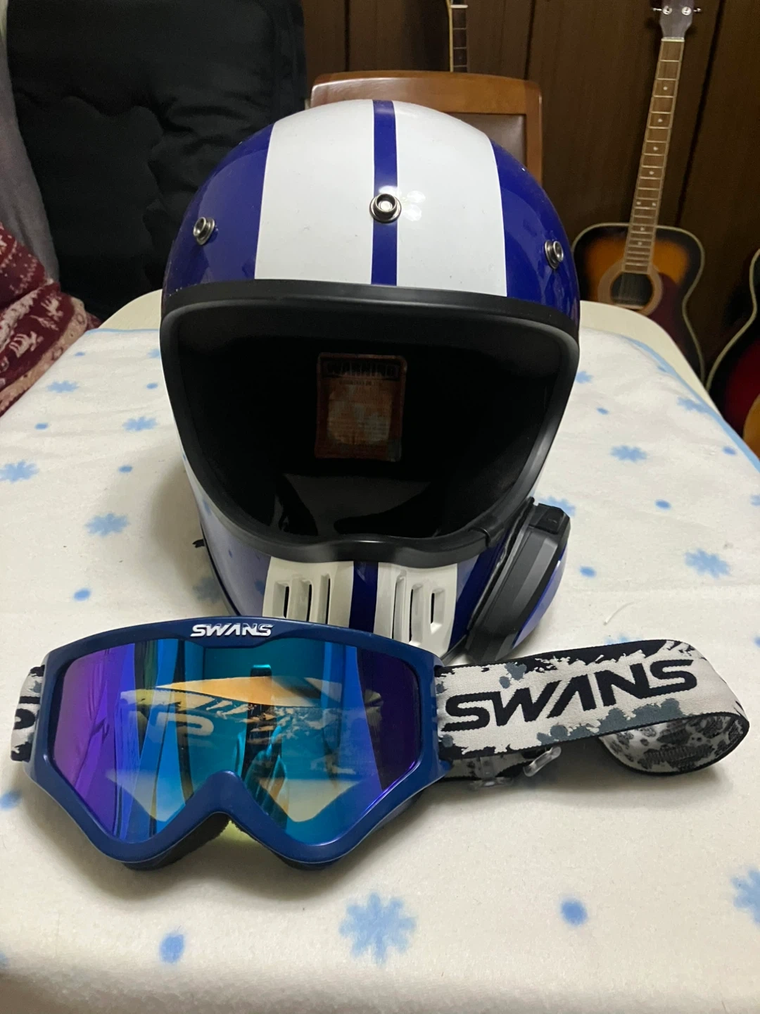 フルフェイス、オフロードタイプヘルメット&スワンズゴーグル セット 青/白