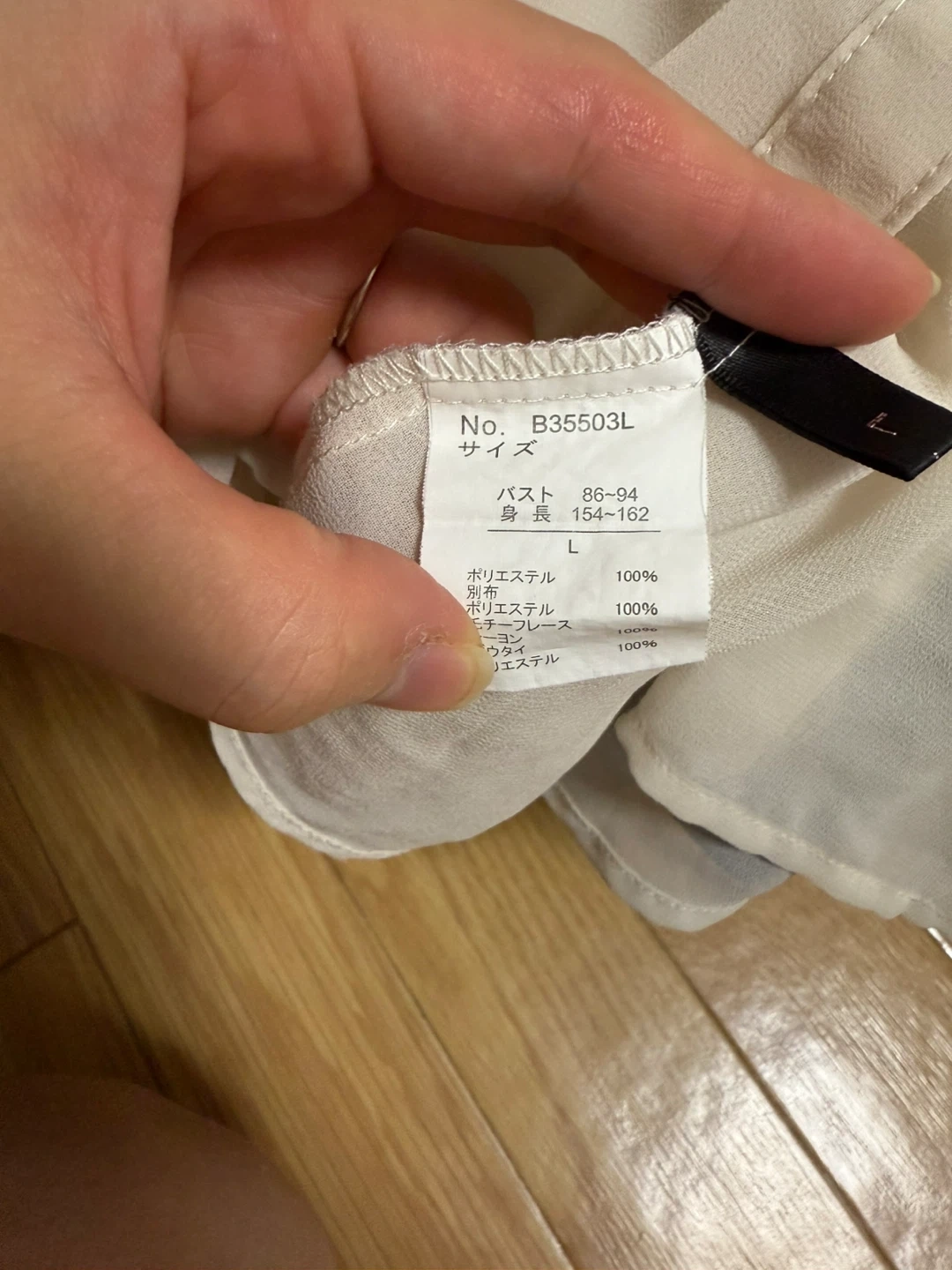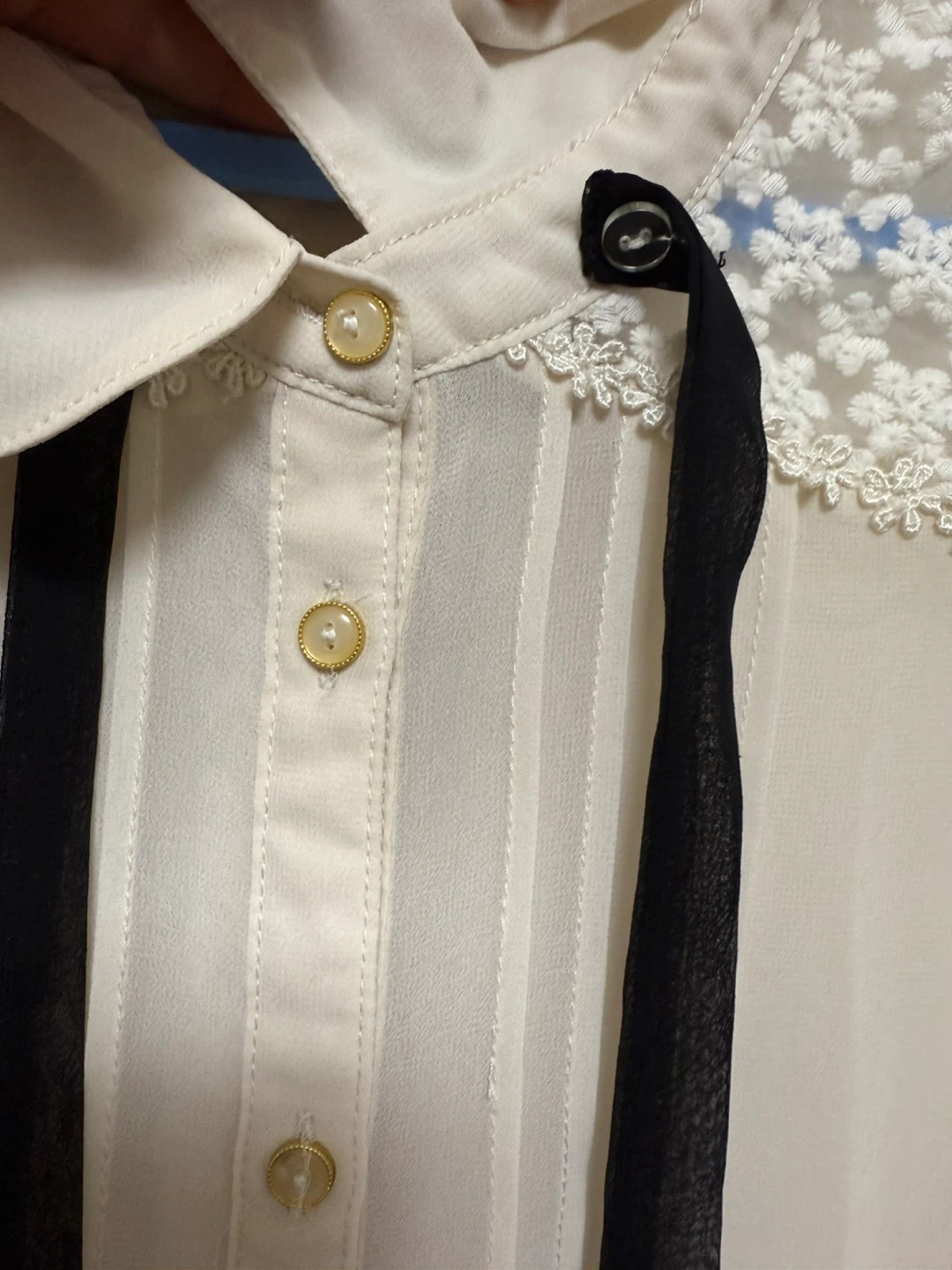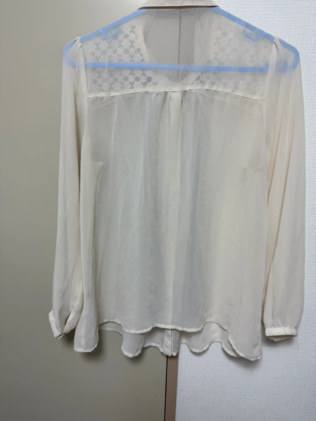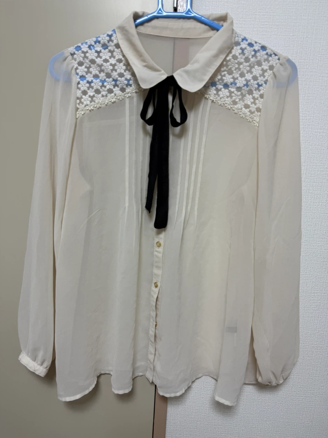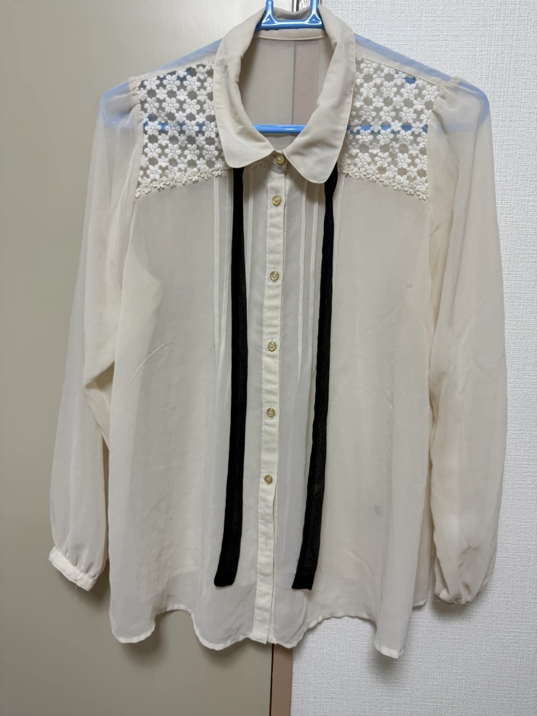 ブラウスLサイズです。 アイボリーのレース付き長袖シャツ、リボンデザインが特徴。 リボンはシアーの生地の紐リボンで、えり裏のボタンで付いています! 今の時期の暑い寒い分からない時にそのまま着れるし、少し寒くなったら、カーディガンを着て着用するのも可愛いです! 何年か前のものなので、使用感や、畳じわがありますご了承ください。 ・色:オフホワイト ・サイズ:L(バスト86-94cm、身長154-162cm) ・素材:ポリエステル100% ・胸元にレースのデザイン ・黒いリボン付き ・使用感少なめ 中古品であることご了承ください