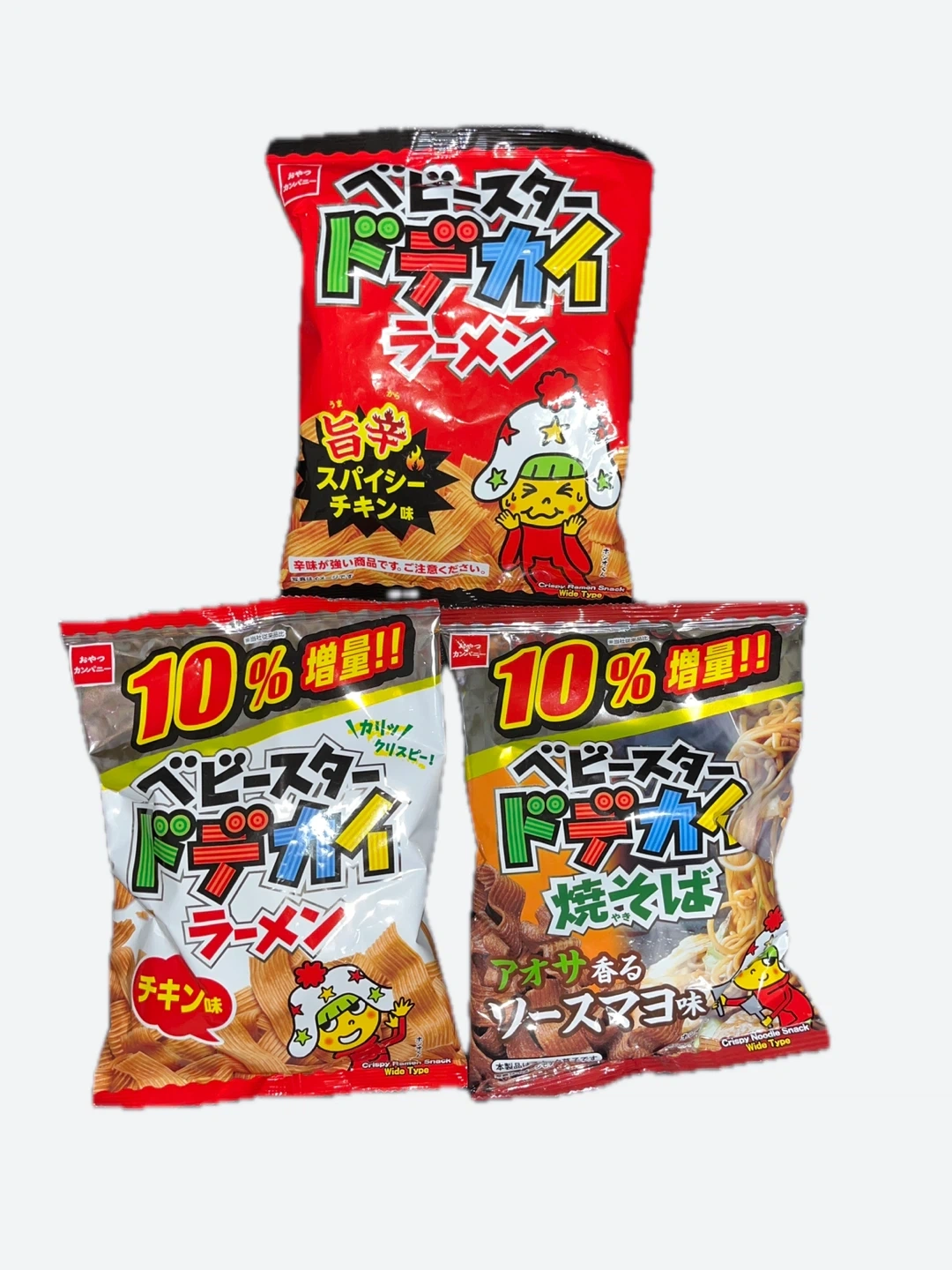 ベビースターのドデカイラーメンと焼そばのスナック菓子です ・ベビースター ドデカイラーメン(スパイシーチキン味) ・ベビースター ドデカイラーメン(チキン味) ・ベビースター ドデカイ焼そば(アオサ香るソースマヨ味) 賞味期限2026/03
